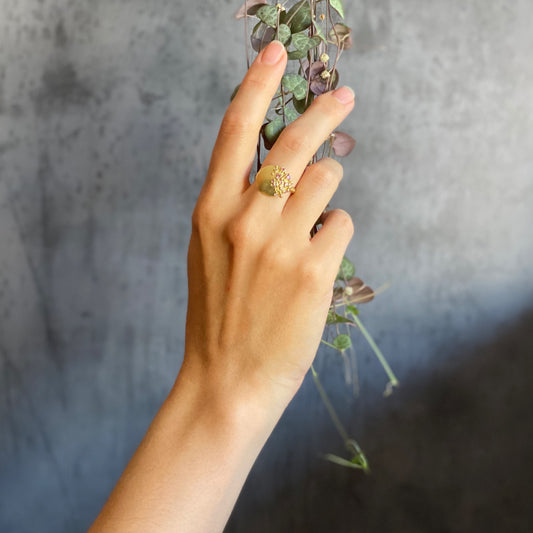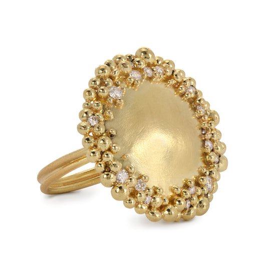 Regular price £6,000.00Regular priceUnit price perSale price £6,000.00A new Adorn creation, which radiates sunshine and light. This showstopper ring is crafted in rich 18ct gold with an exquisite halo of granulation and diamond detailing. The golden disc is created from a single large gold granule, which is forged, rolled and domed by hand before being embellished.