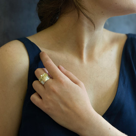 Regular price £450.00Regular priceUnit price perSale price £450.00A generous band of hand-forged matt-silver envelopes the finger in a single fold. Encrusted with contrasting 18ct gold granulation the design is a compelling exploration of eroded line and adornment.