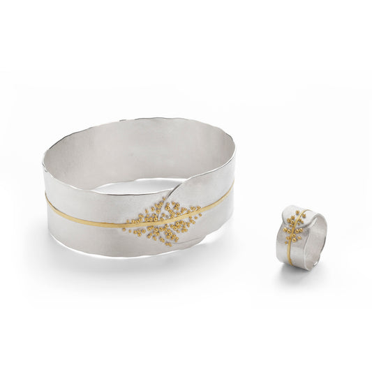 Regular price £1,600.00Regular priceUnit price perSale price £1,600.00This beautiful hand forged silver cuff elegantly overlaps before being looped with a band of fine 18ct gold and scattered with gorgeous golden granules.