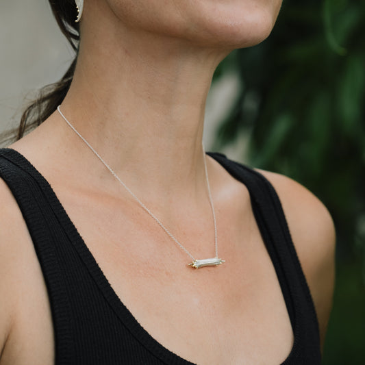 Regular price £450.00Regular priceUnit price perSale price £450.00Suspended horizontally a cylindrical spinner pendant, created from strands of silver elements, is tipped with delicate droplets of gold. Like weathered driftwood, the form has richly textural-line and irregular edges. The sense of movement adds to the tactile quality of the piece.