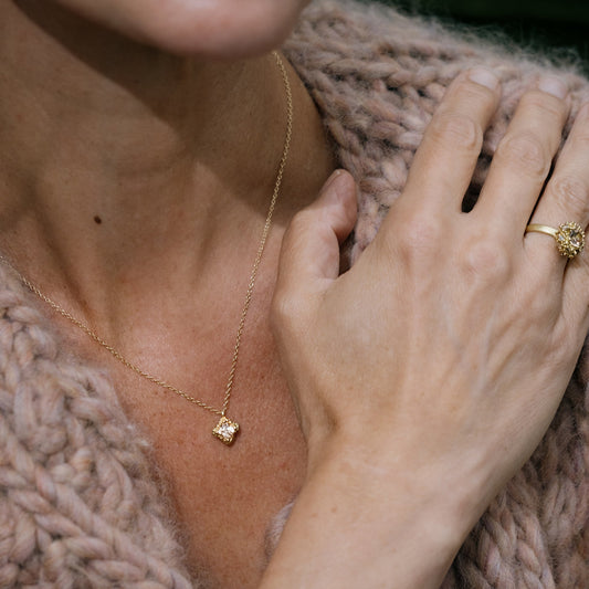 Regular price £2,500.00Regular priceUnit price perSale price £2,500.00Capturing the light beautifully - this sparkling cushion-cut Australian Zircon is richly nestled in warm 18ct gold granulation and delicately suspended from a fine chain.