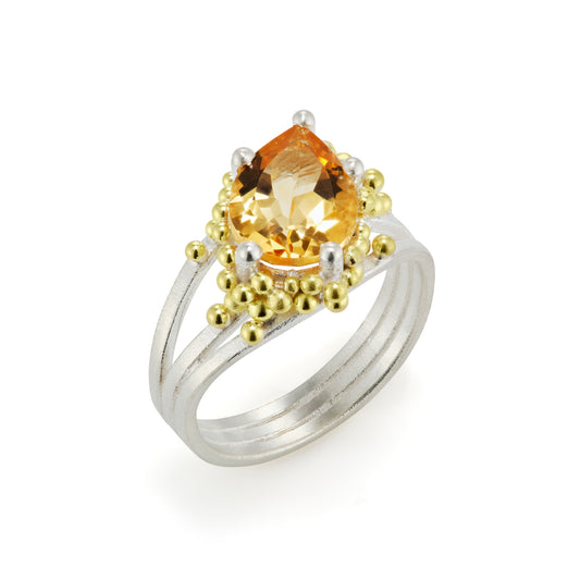 Regular price £1,000.00Regular priceUnit price perSale price £1,000.00This delicious pear-shaped citrine glows amidst scatters of 18ct yellow gold granulation, clutched within a band of silver strands.