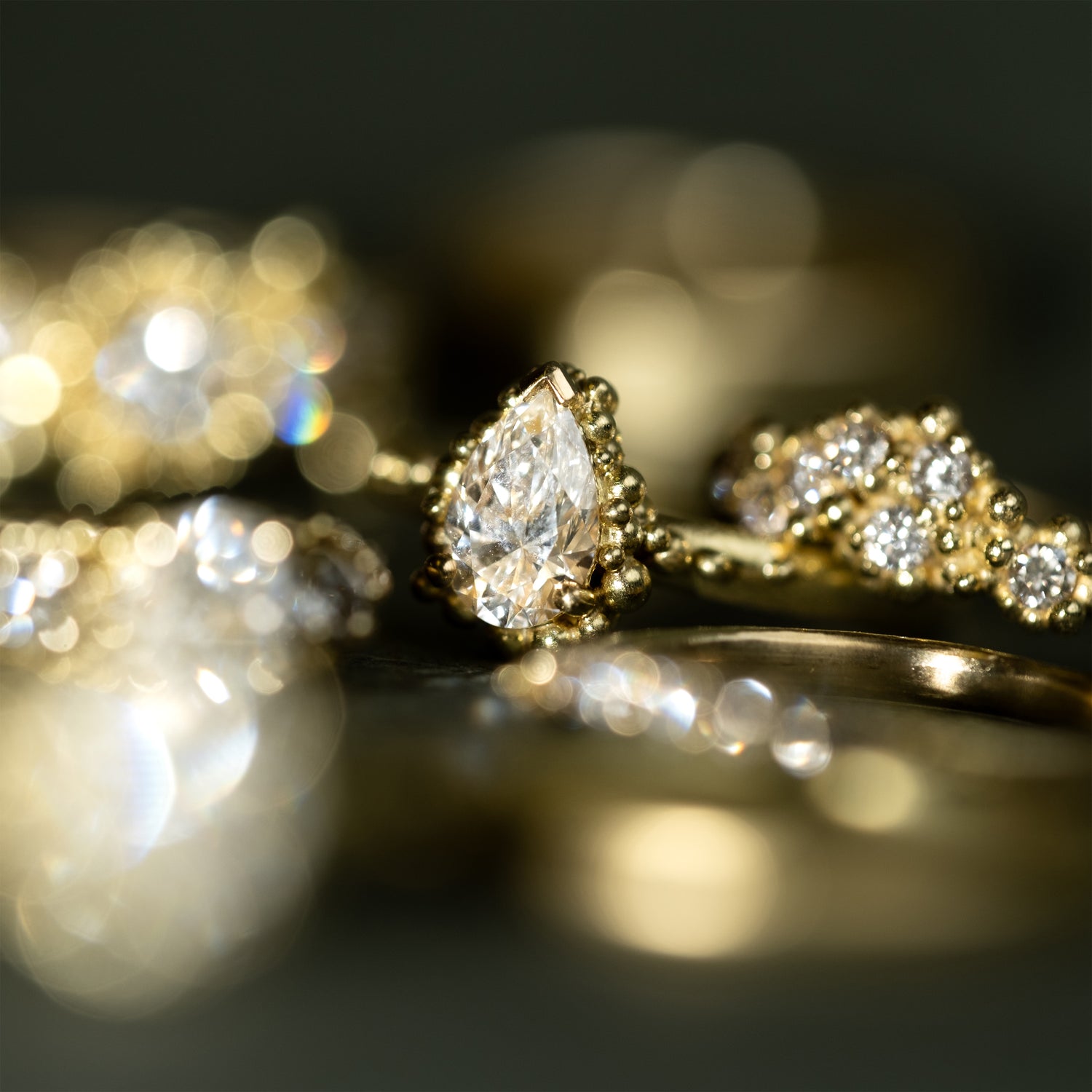 Regular price £2,200.00Regular priceUnit price perSale price £2,200.00A beautifully flowing ring with gently curved golden granulation, set with a sea of seven shimmering white diamonds.