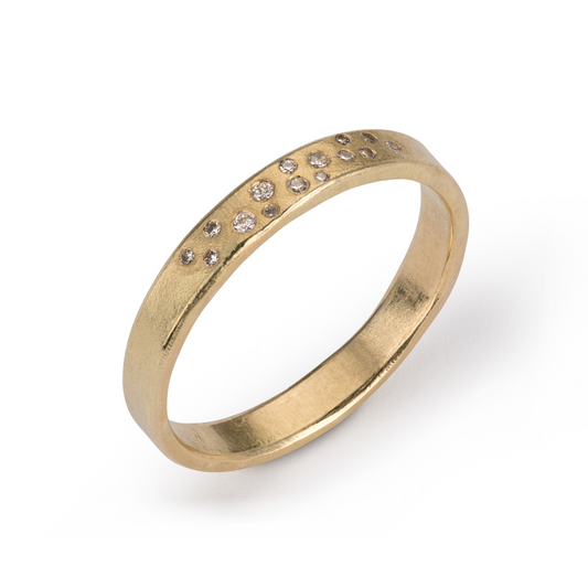 Regular price £1,900.00Regular priceUnit price perSale price £1,900.00This beautiful hand forged ring is made in 18ct yellow gold and is embedded with a scattering of sparkling gypsy set diamonds.