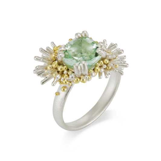 Regular price £1,250.00Regular priceUnit price perSale price £1,250.00This ethically sourced green amethyst has been encased in a bed of softly sculptural sea urchin quills and flowing silver and 18ct yellow gold granulation.