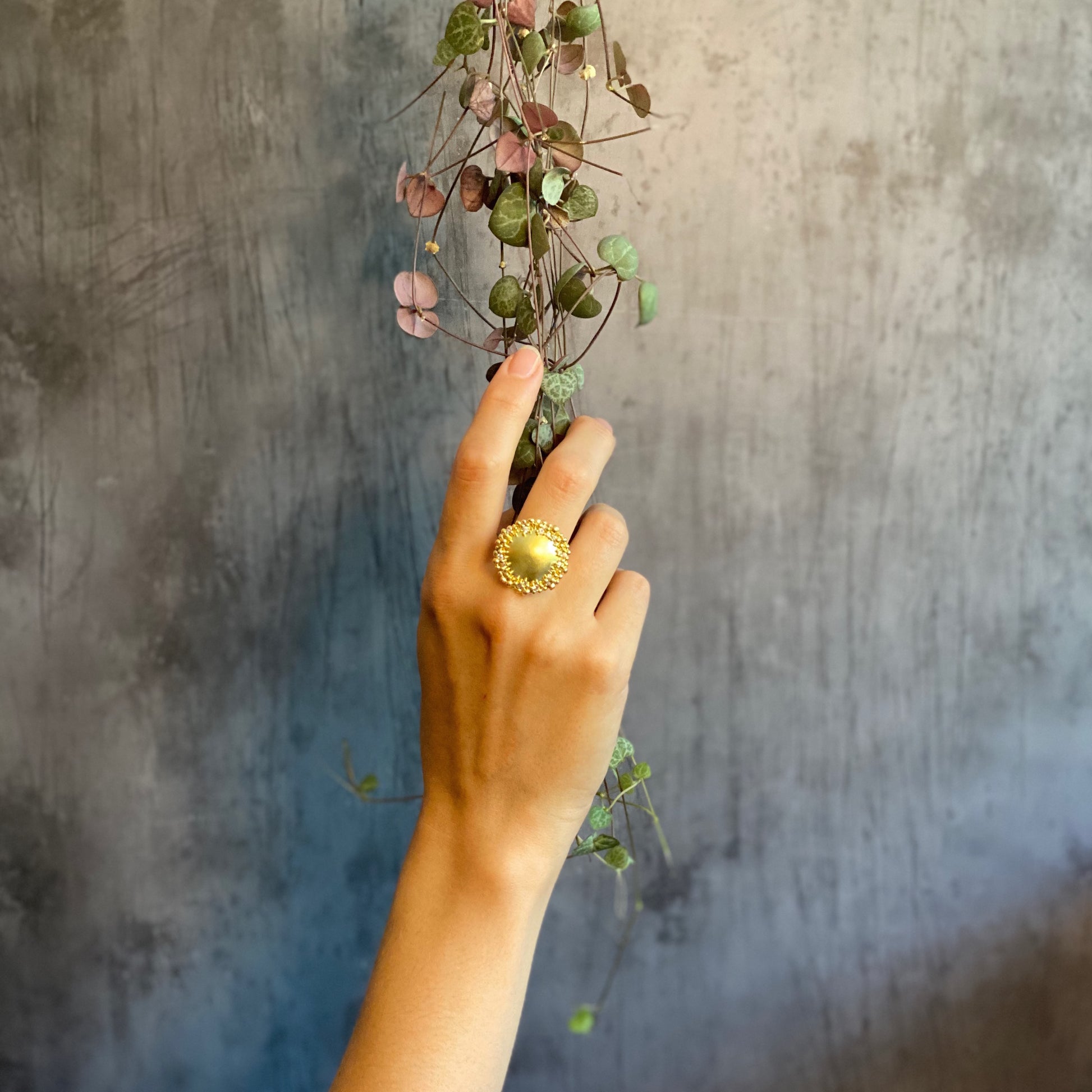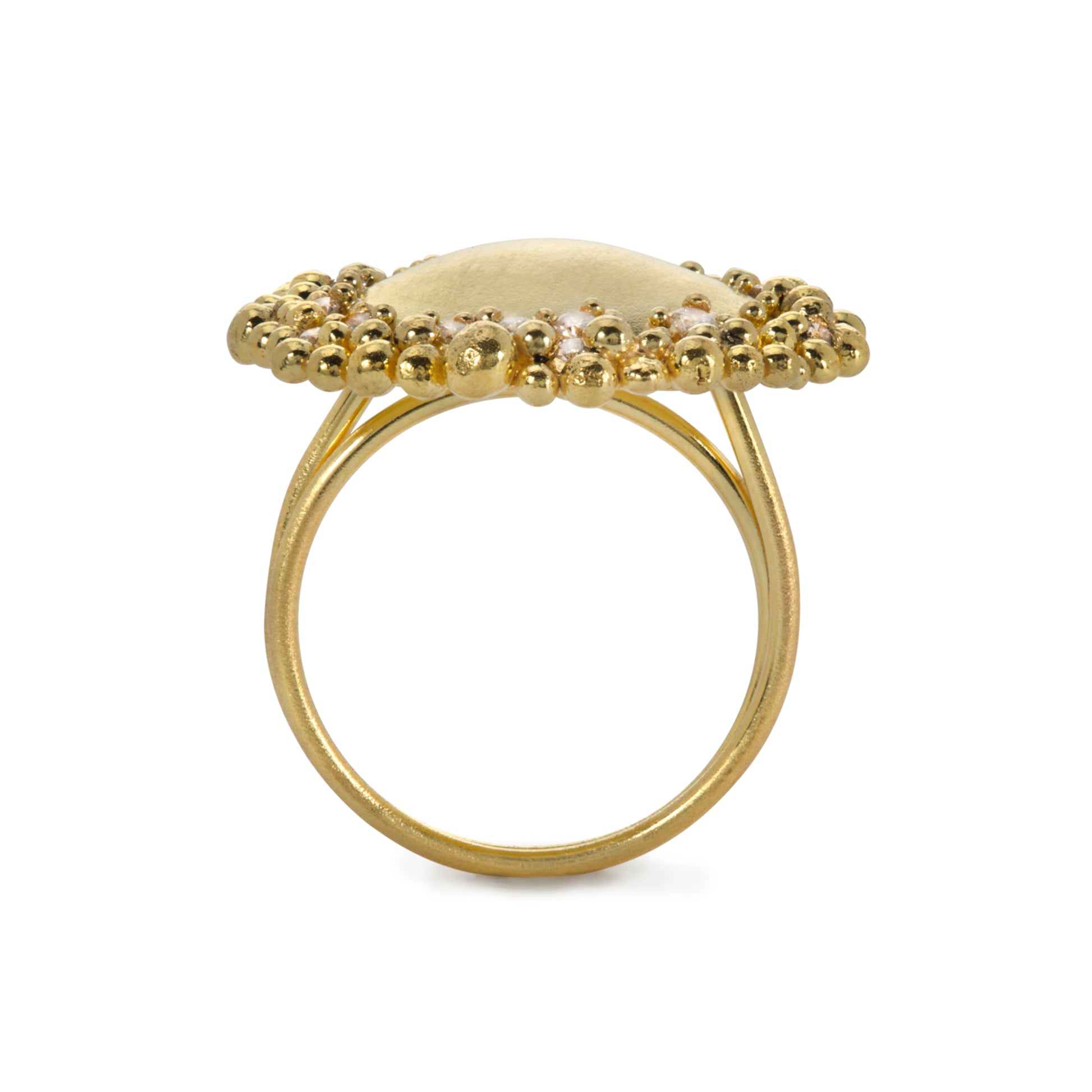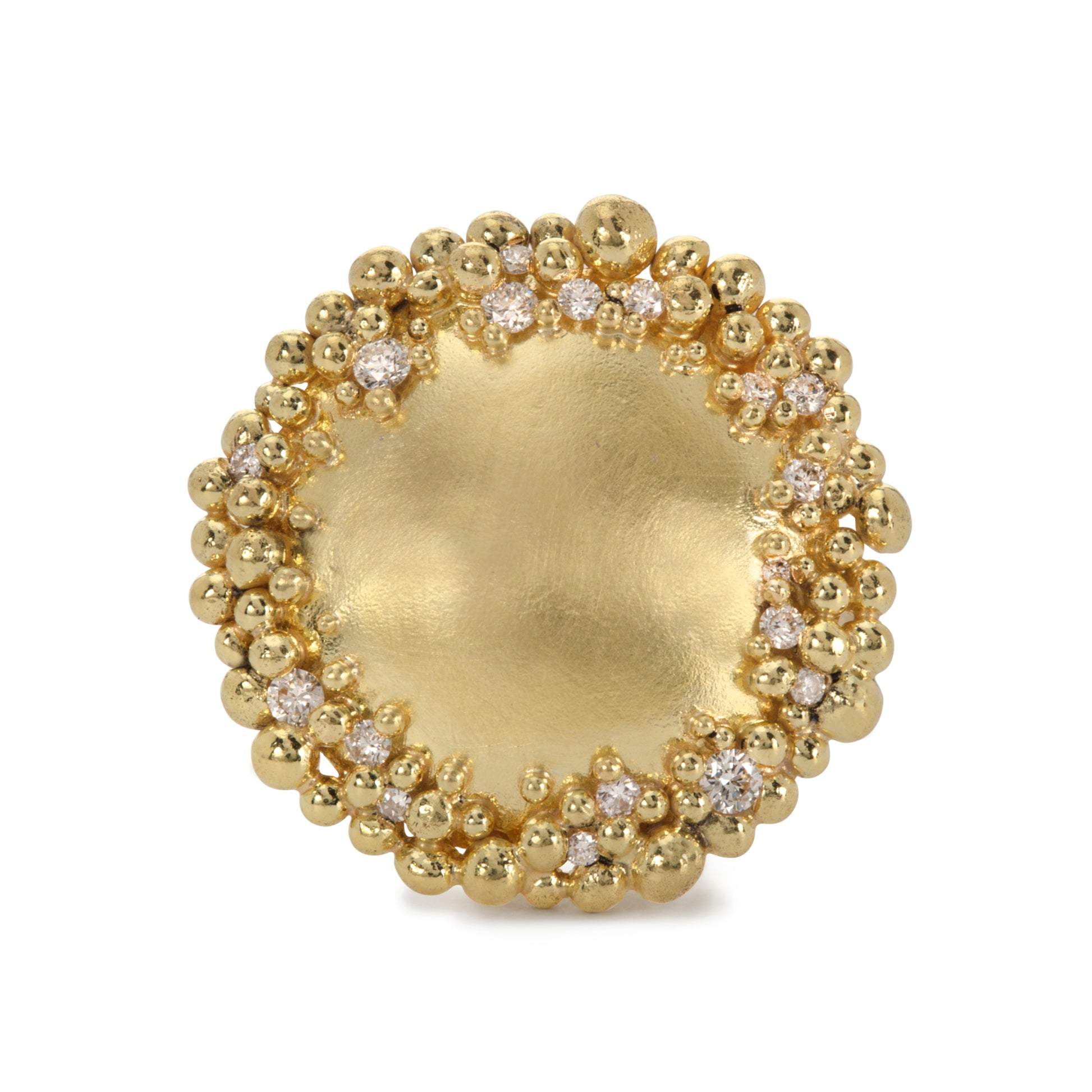 A new Adorn creation, which radiates sunshine and light. This showstopper ring is crafted in rich 18ct gold with an exquisite halo of granulation and diamond detailing. The golden disc is created from a single large gold granule, which is forged, rolled and domed by hand before being embellished.