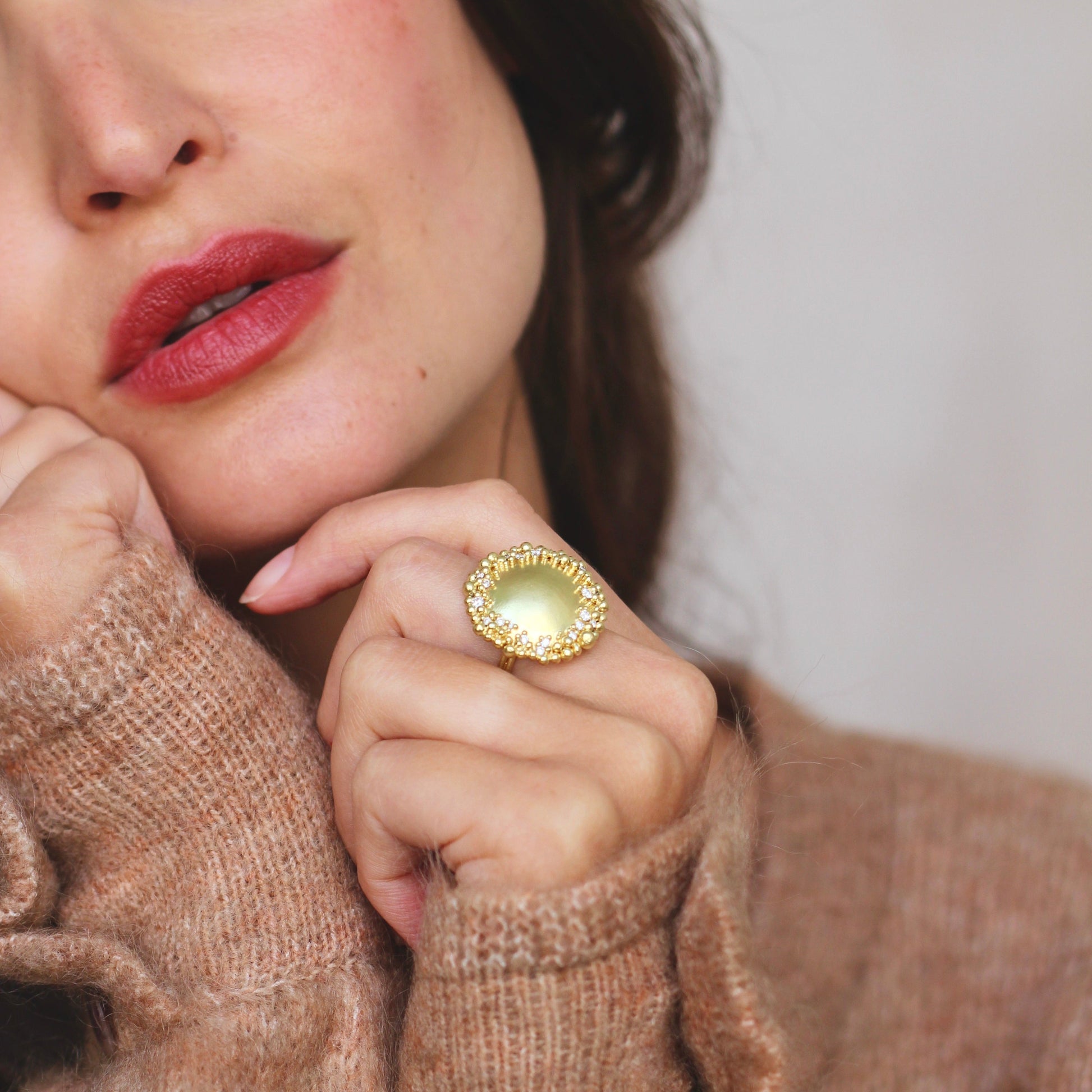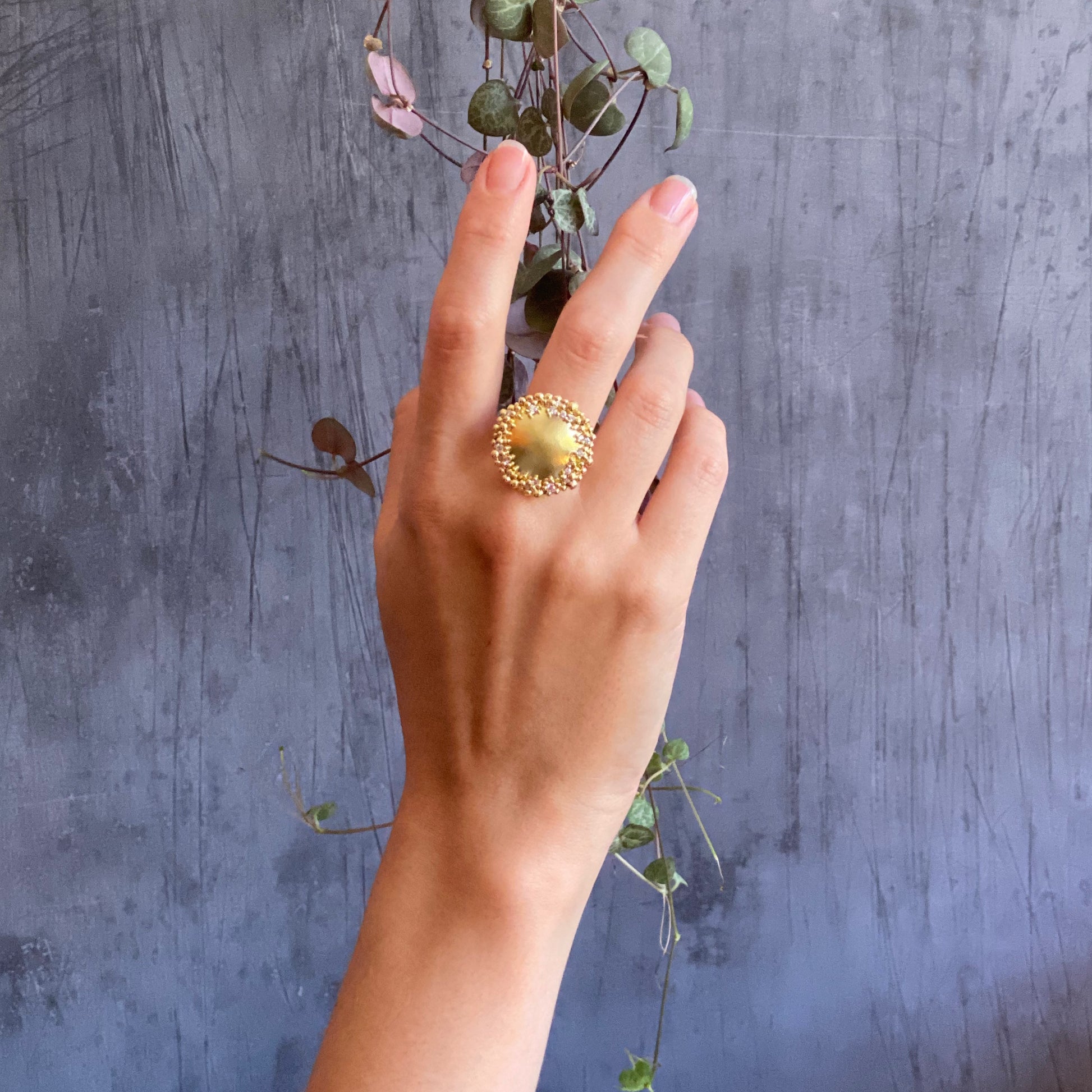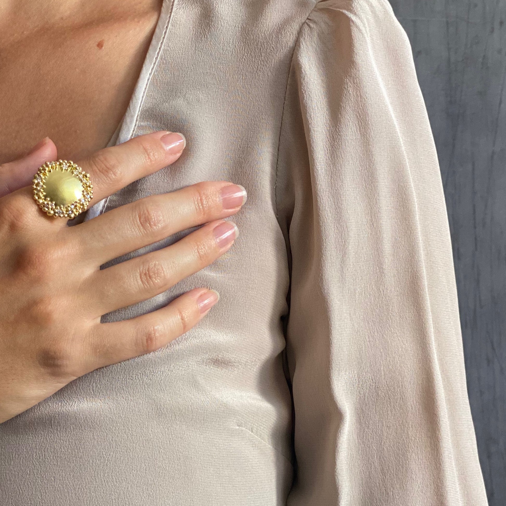 A new Adorn creation, which radiates sunshine and light. This showstopper ring is crafted in rich 18ct gold with an exquisite halo of granulation and diamond detailing. The golden disc is created from a single large gold granule, which is forged, rolled and domed by hand before being embellished.