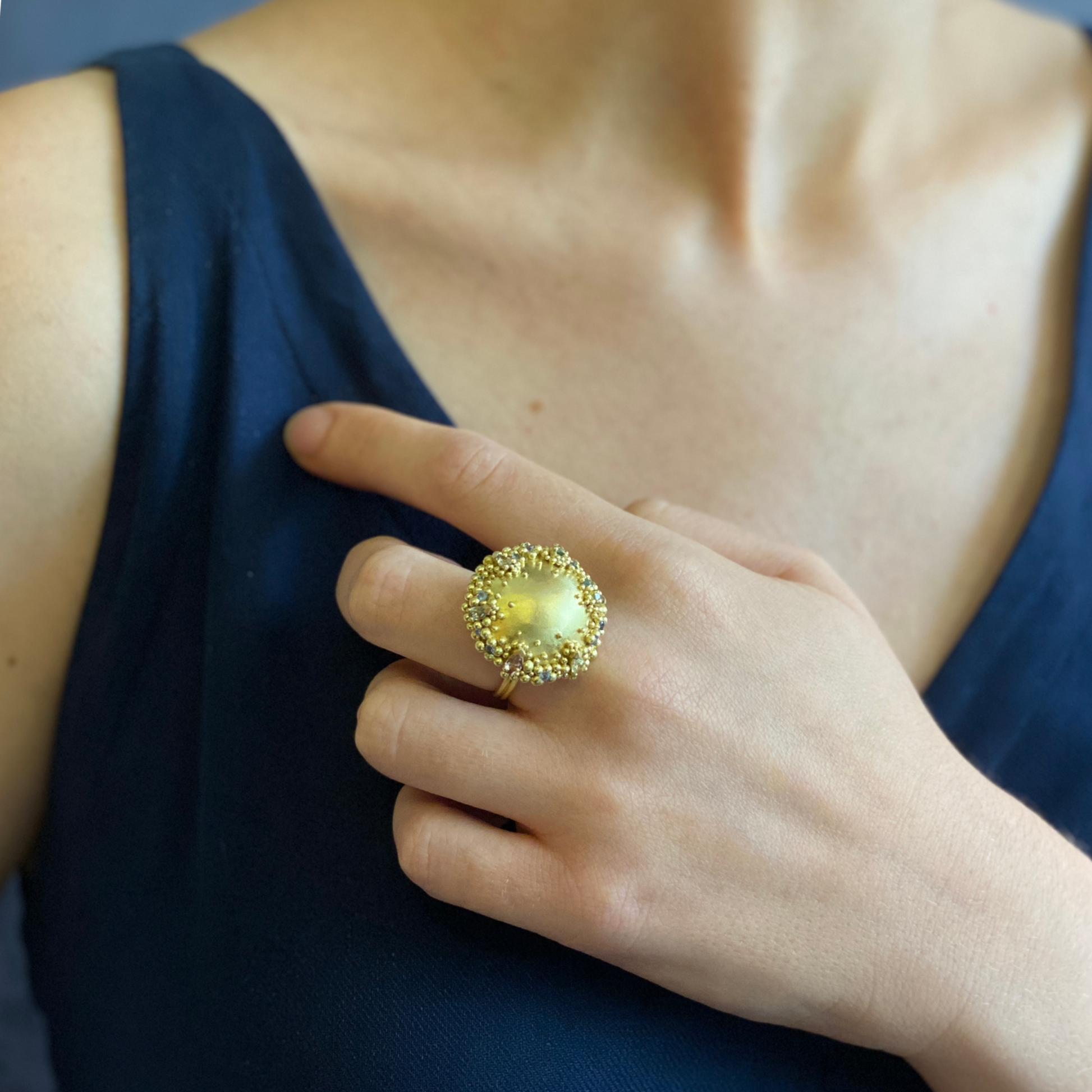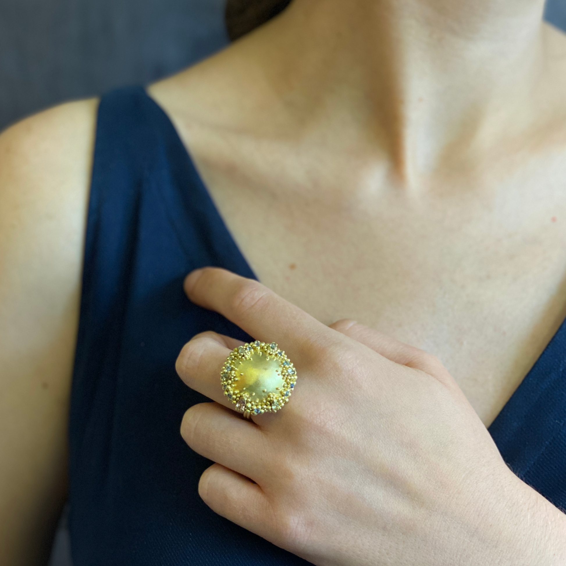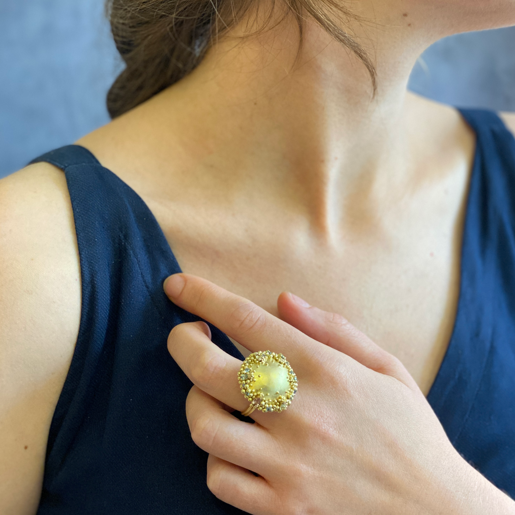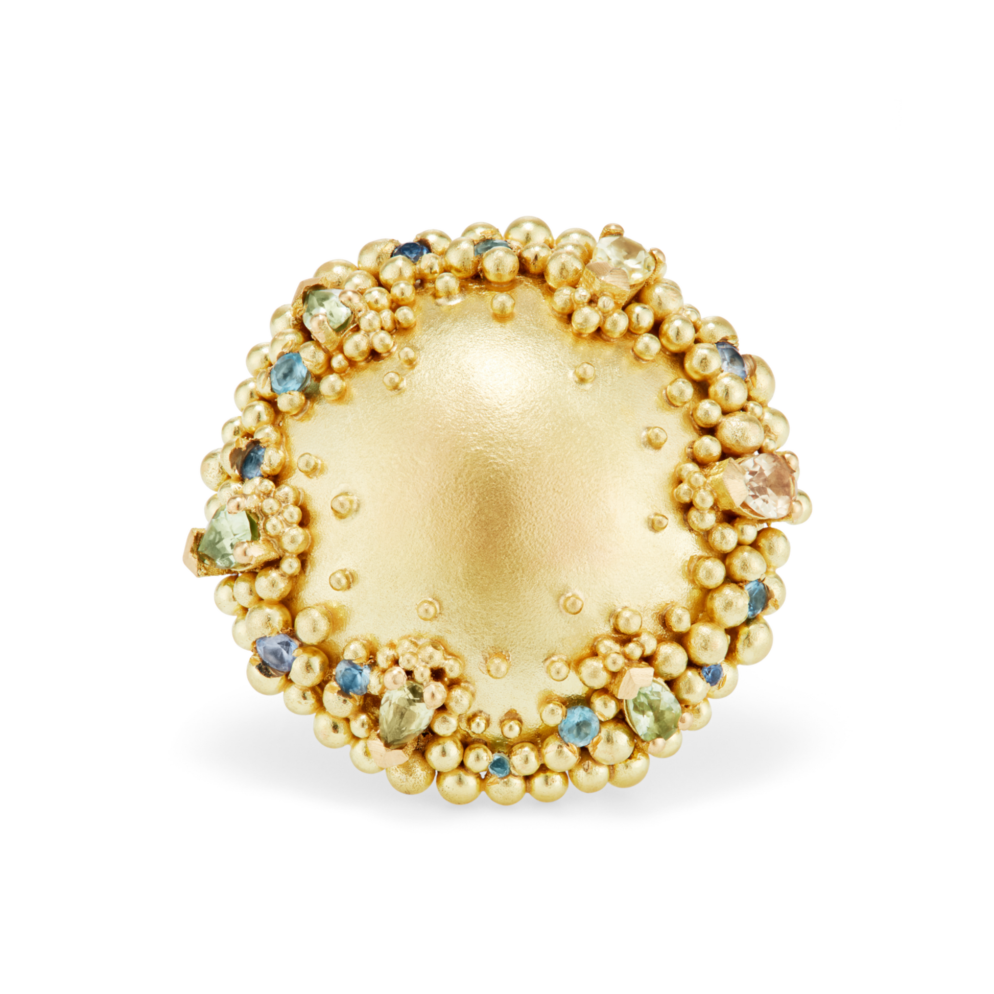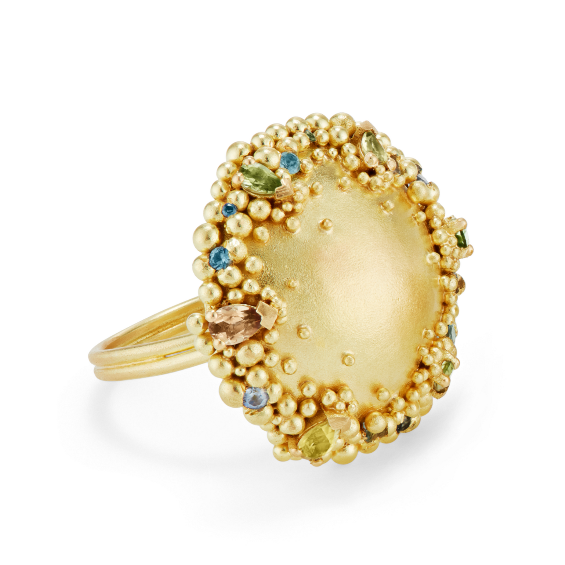 This dazzling new Adorn ring is haloed with rich 18ct gold granulation - bejewelled with raindrop and round aquamarine and sapphires in delicate ocean tones and 'golden hour' pinks.