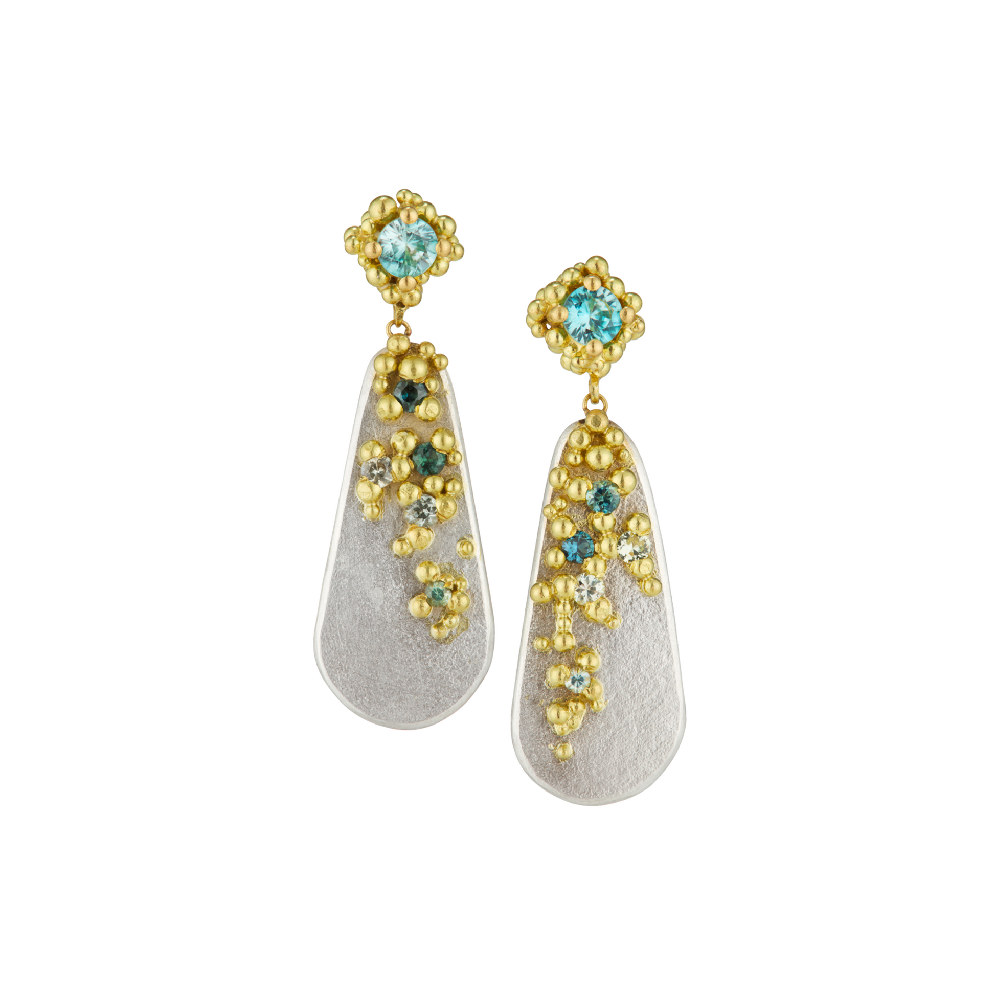 These Adorn earrings feature shimmering zircons nestled in a foam of 18ct yellow gold granulation and suspended with a delicate 3.5cm silver drop. The drops are adorned with a scattering of ten sea-toned Montana & Australian sapphires and gold granules.
