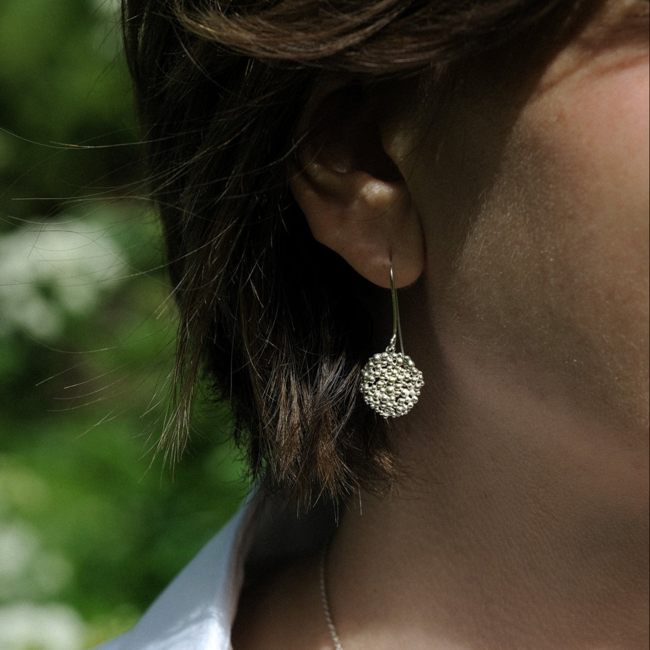 A single disc of shimmering silver granules drops elegantly in these pretty earrings. Available in a medium and large size.