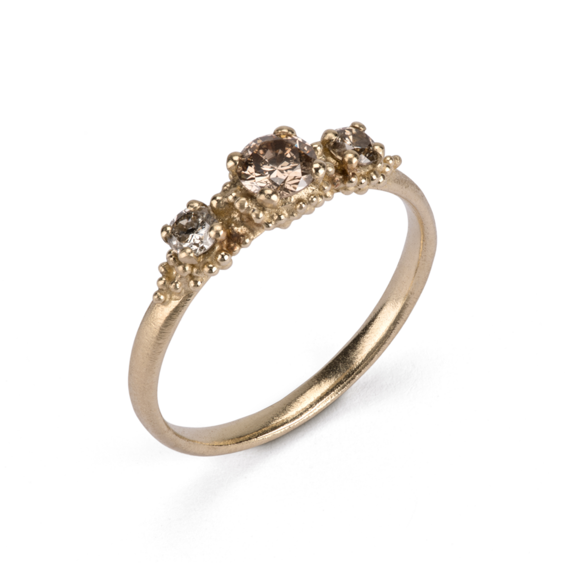 Three champagne diamonds are elegantly entwined in warm 14ct yellow gold granulation.
