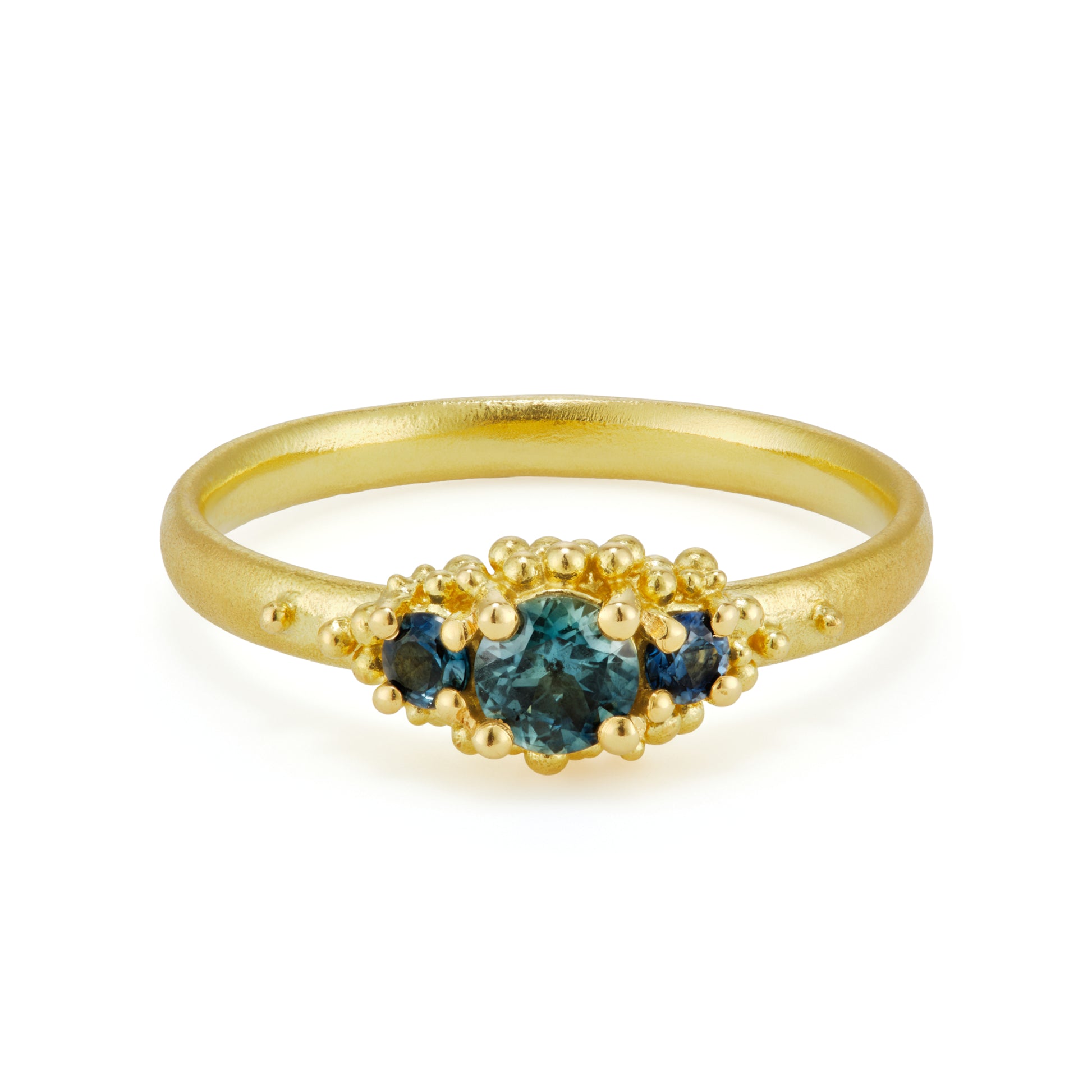 This close cluster of shimmering teal sapphires is held in rich, buttery 18ct gold granulation.