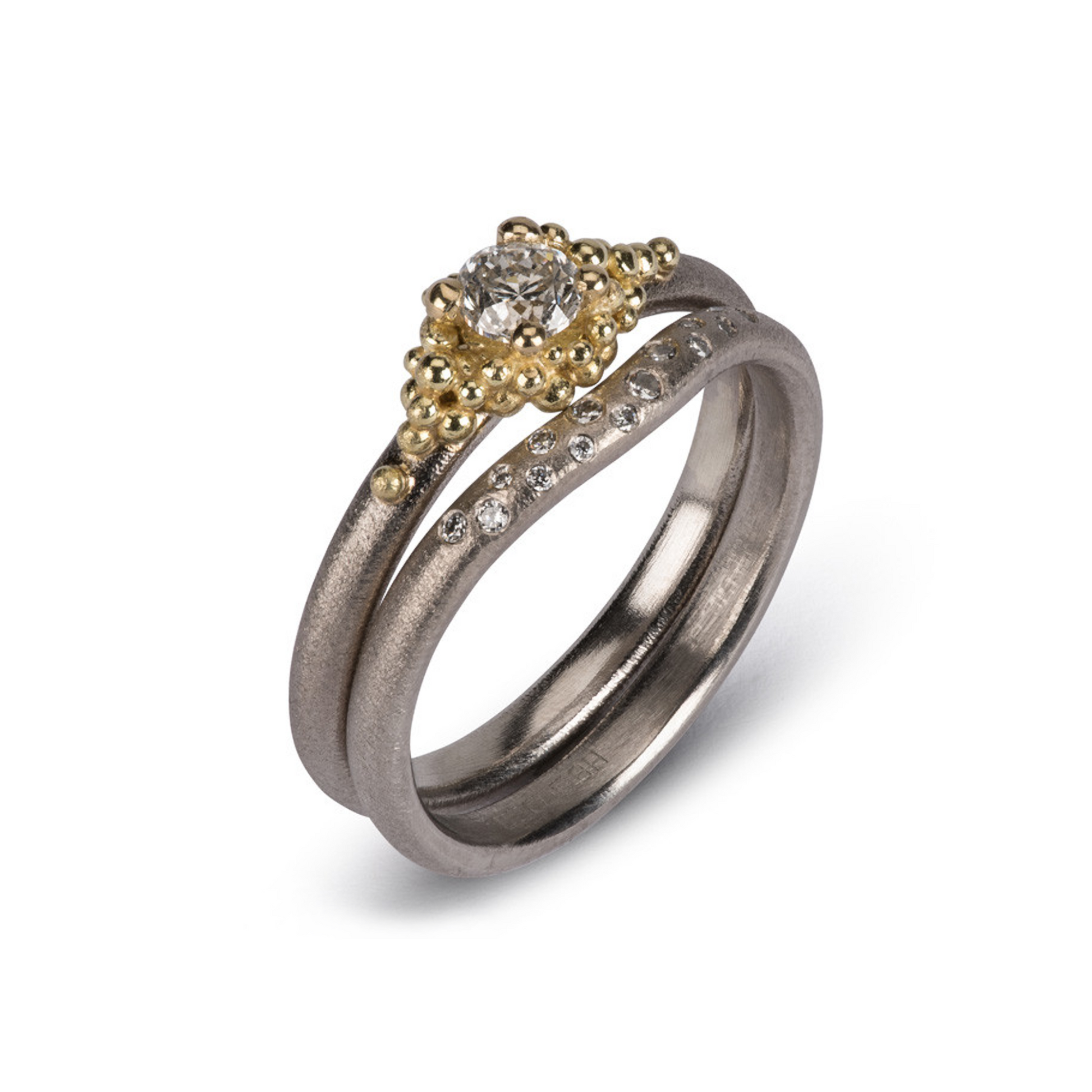 A beautiful brilliant cut diamond is nestled within a cluster of rich 18ct yellow gold granulation, set on a tonal 18ct white gold band.