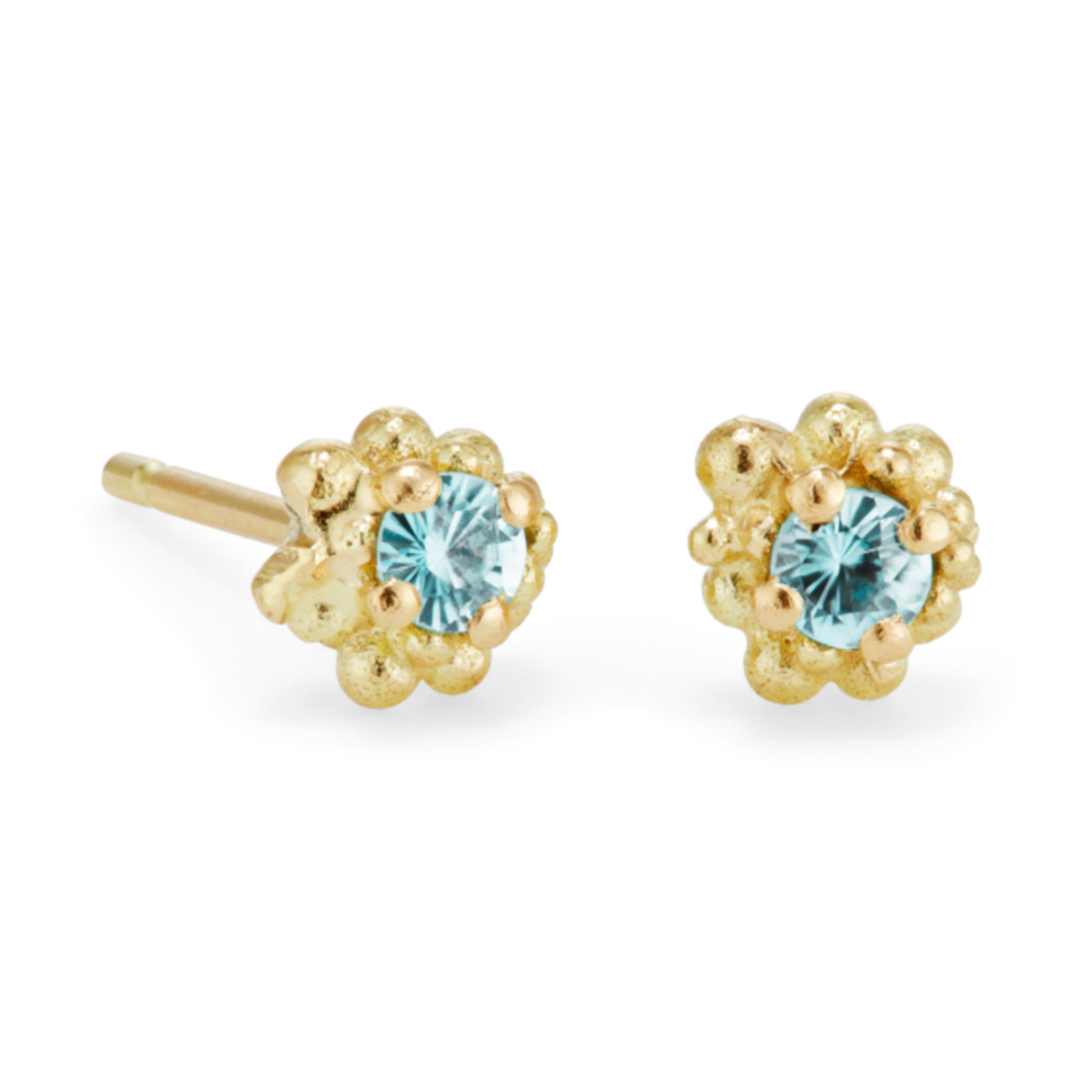 These signature Cluster earrings in 18ct yellow gold are set with sparkling sea blue zircons, clustered in gorgeous granulation.