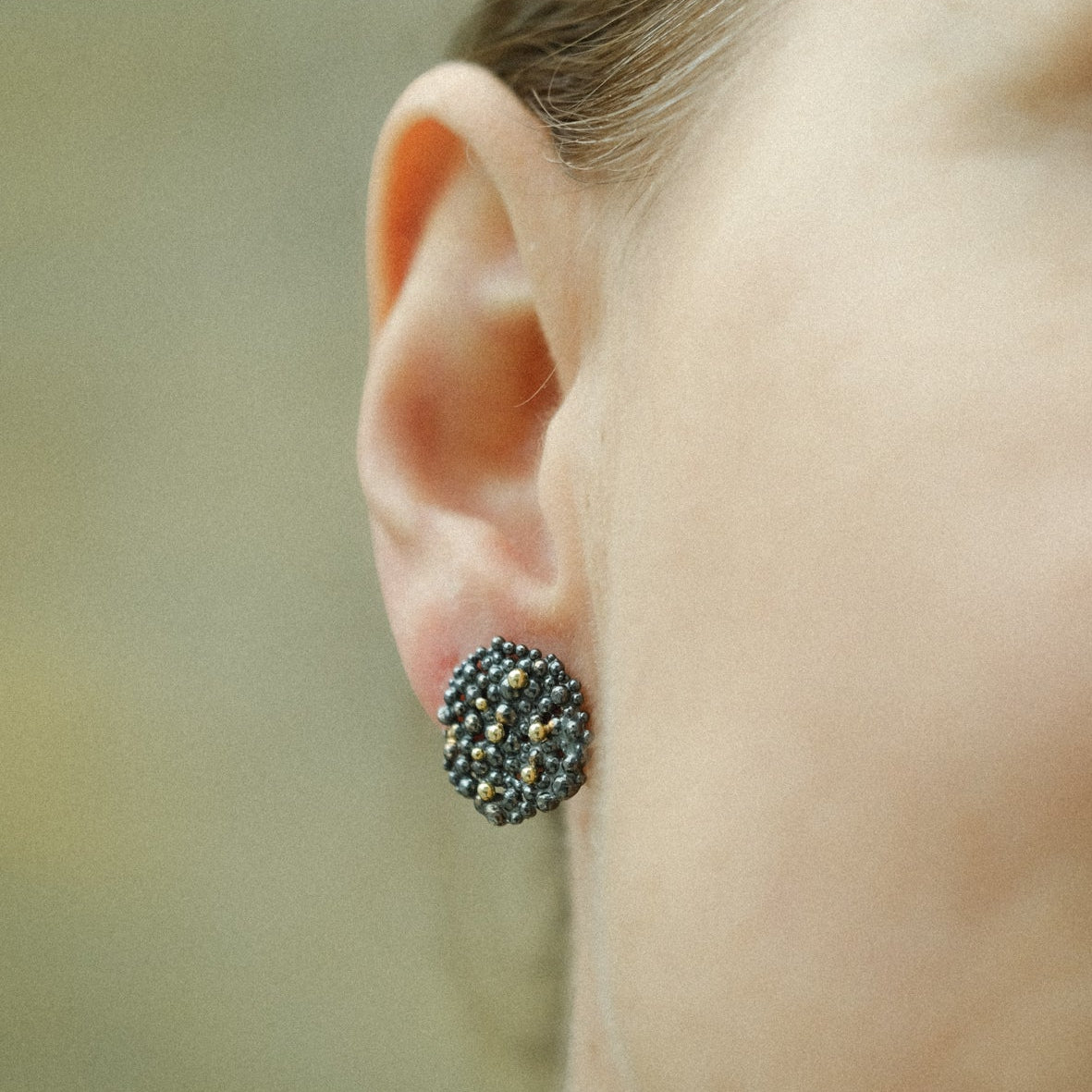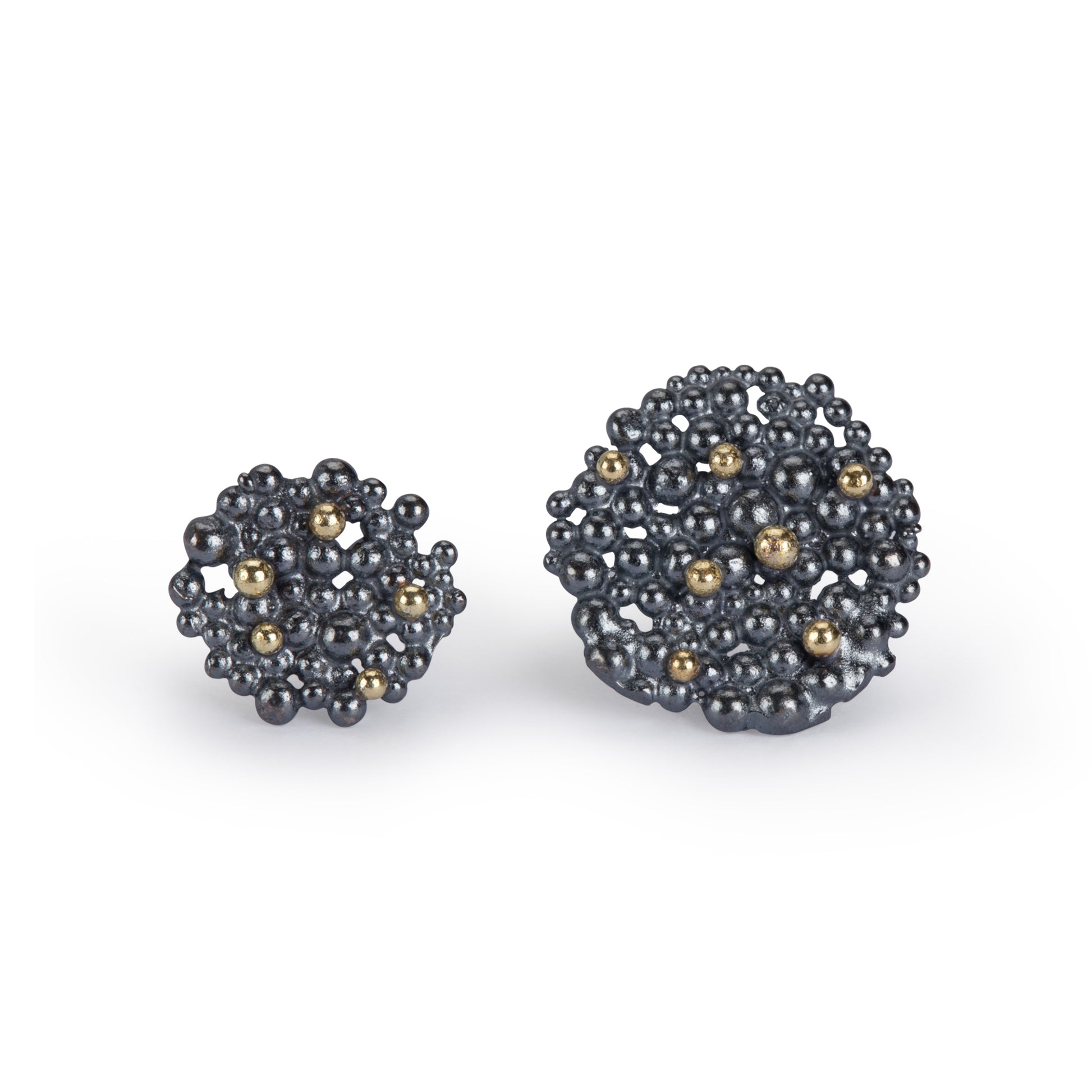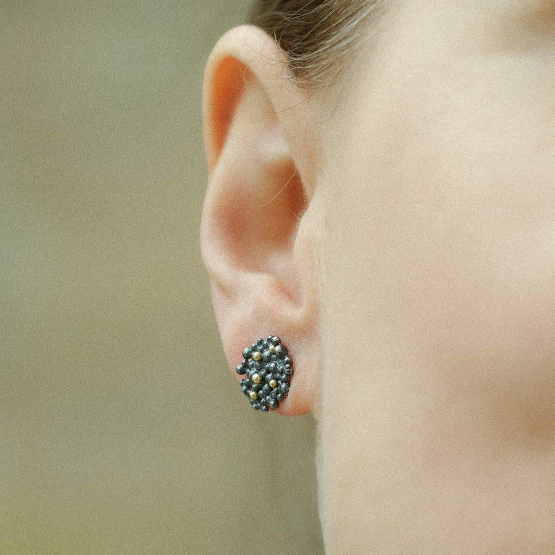 A glorious grouping of fused 18ct yellow gold and oxidised silver granules seemingly float together to form these contrasting Berry earrings.