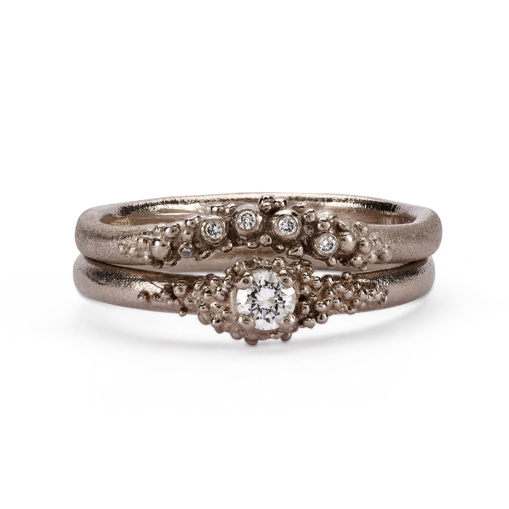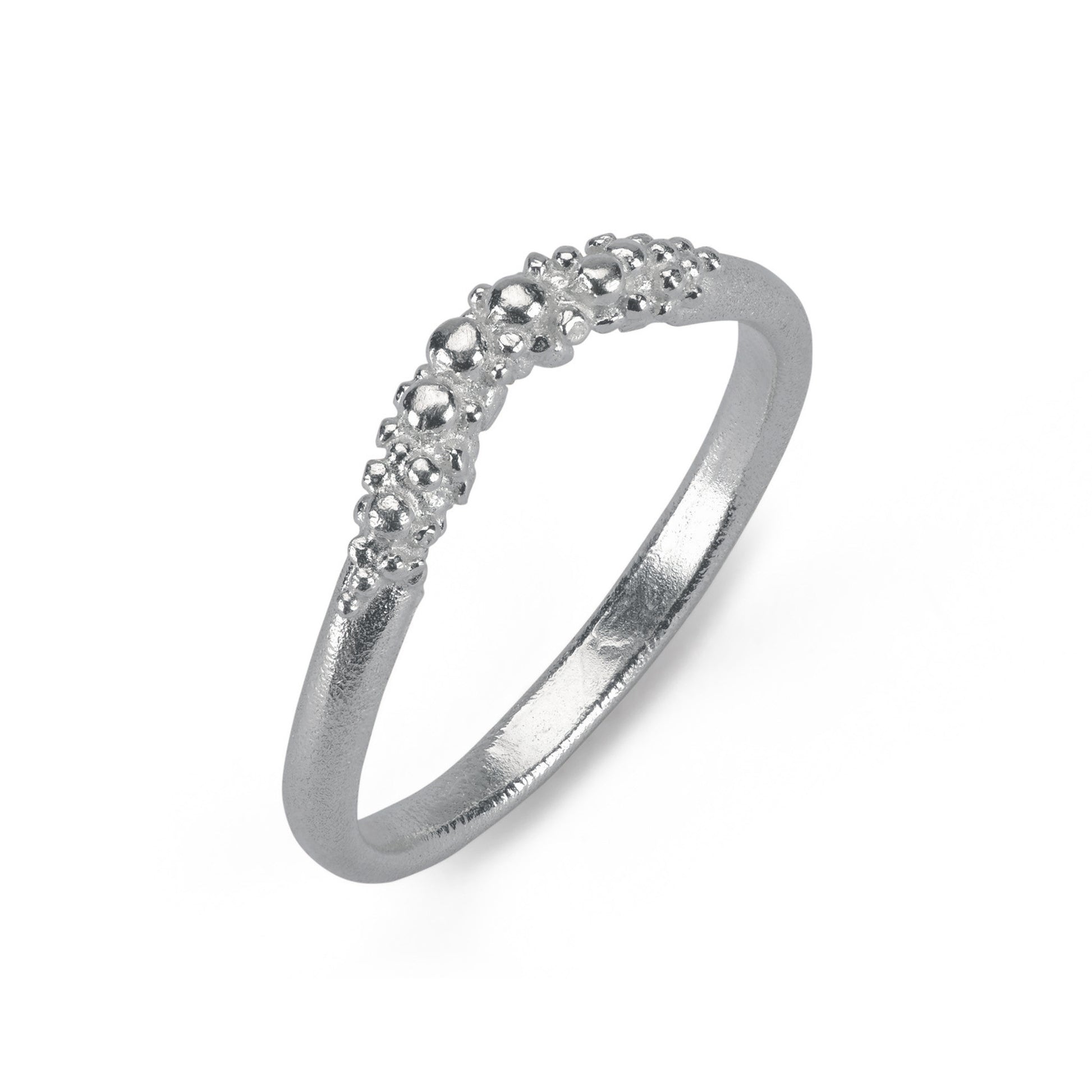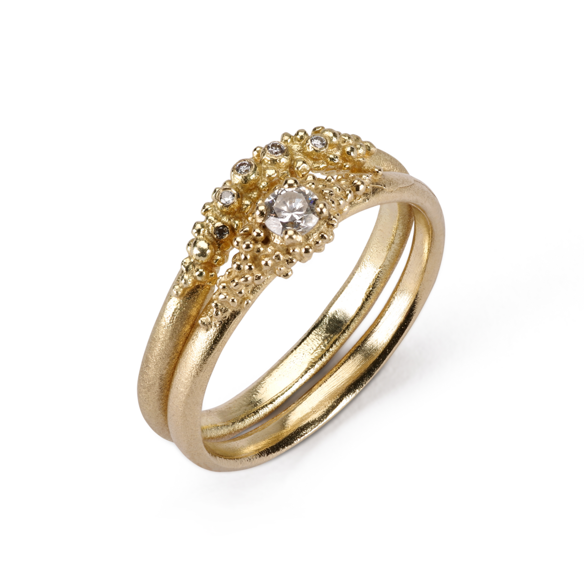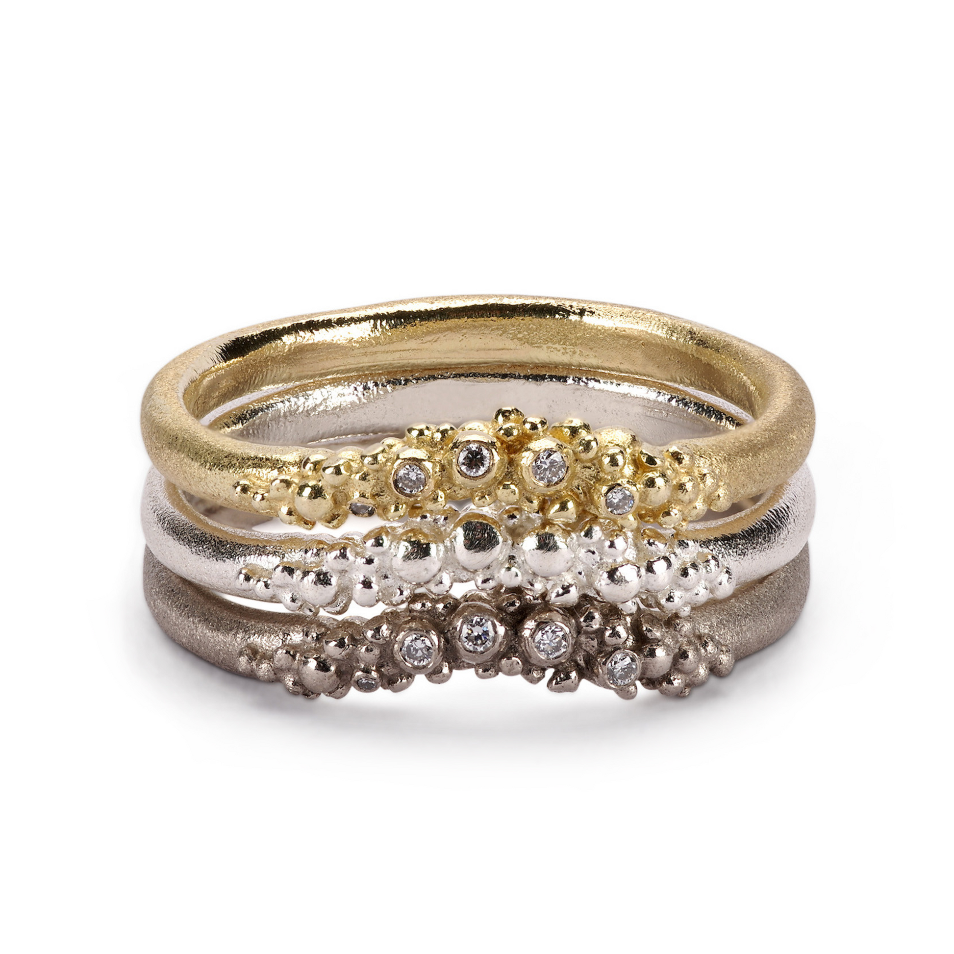 A beautiful ring with gently contoured granulation, enabling the ring to sit next to a cluster ring.  Available in 9ct white, 18ct white gold and 18ct yellow gold, with a choice of five brilliant cut white diamonds embedded in the granulation.
