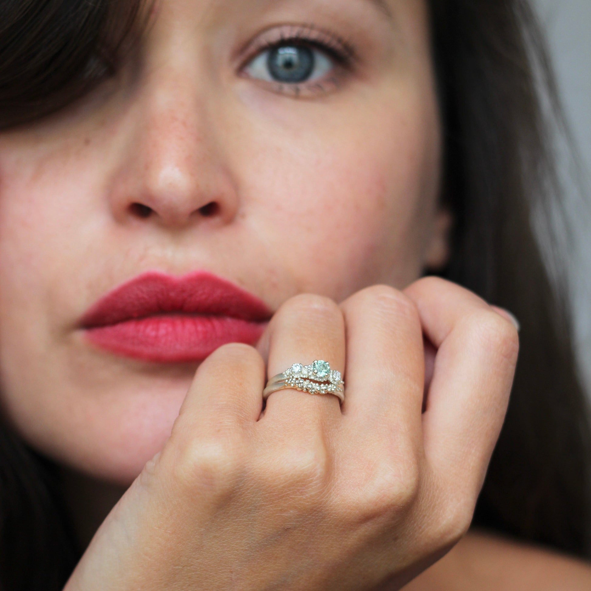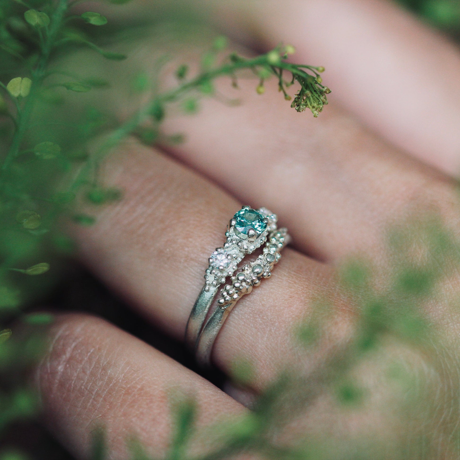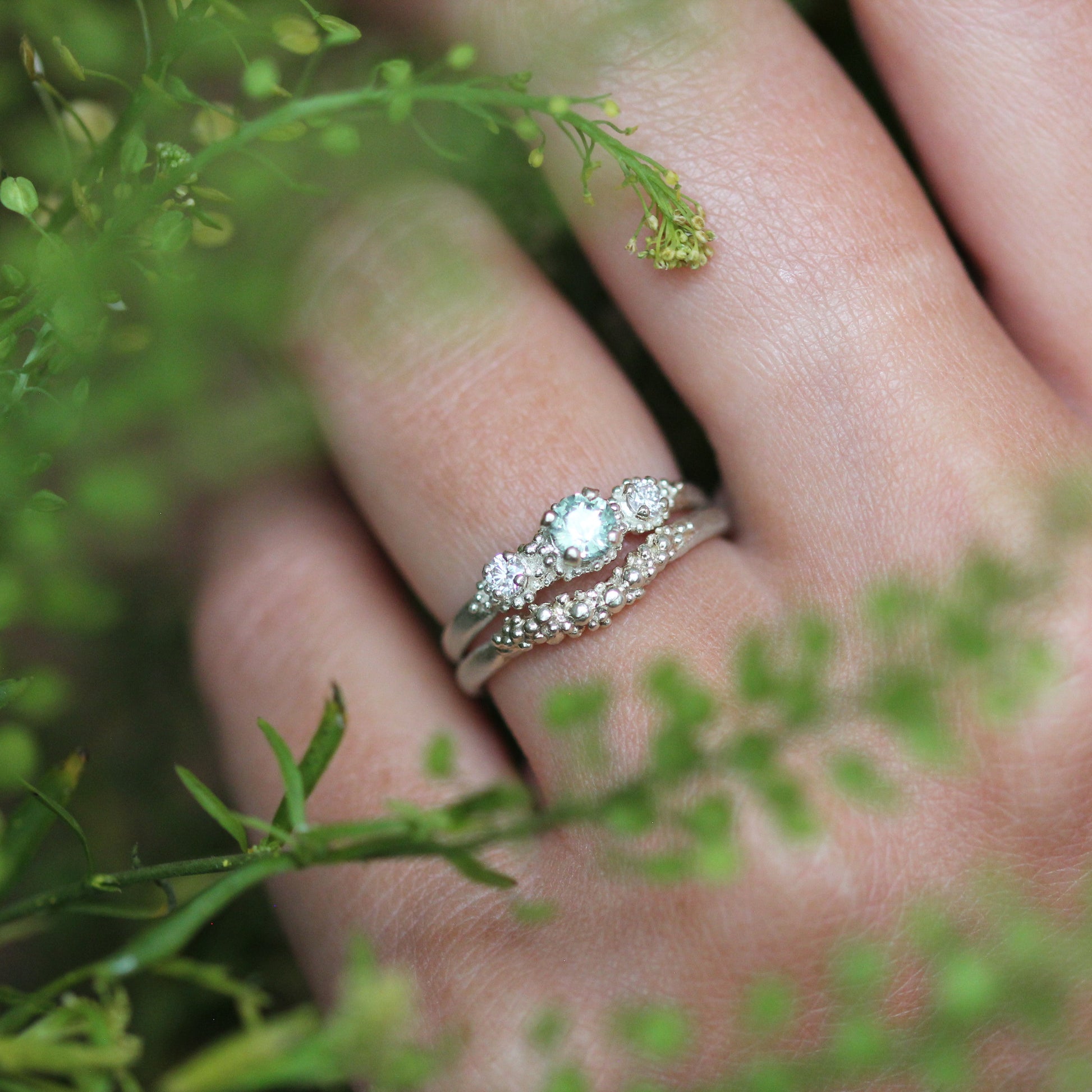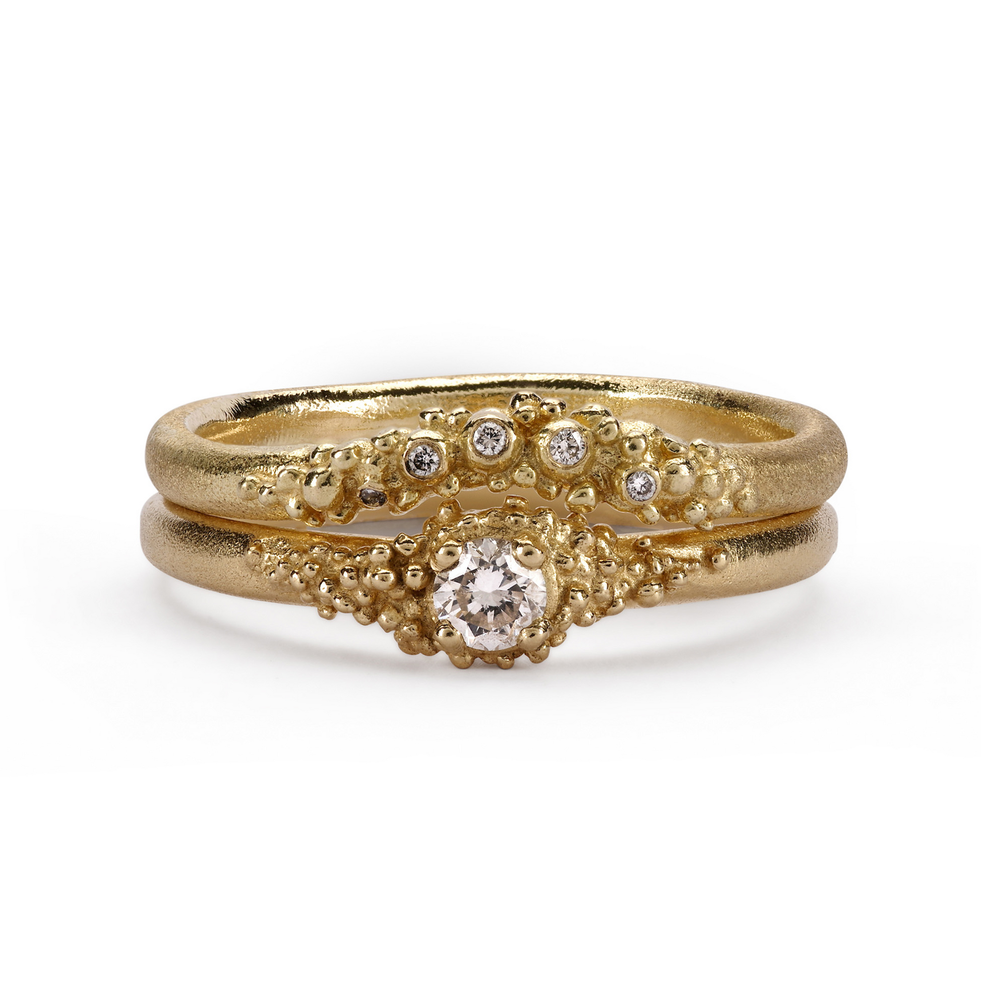 A beautiful ring with gently contoured granulation, enabling the ring to sit next to a cluster ring.  Available in 9ct white, 18ct white gold and 18ct yellow gold, with a choice of five brilliant cut white diamonds embedded in the granulation.