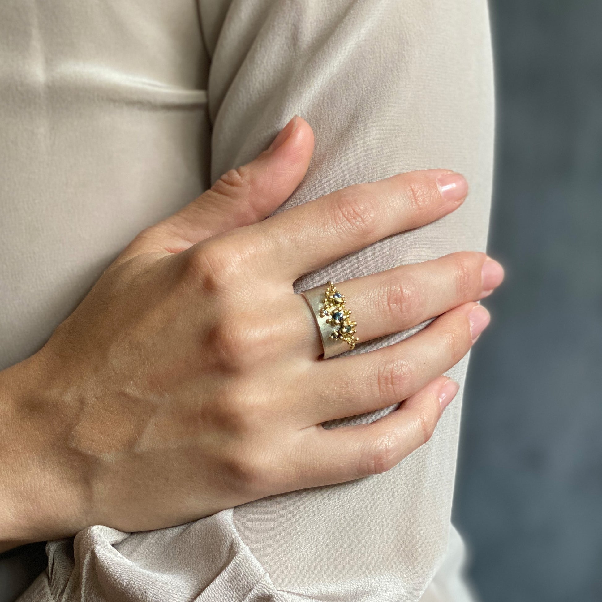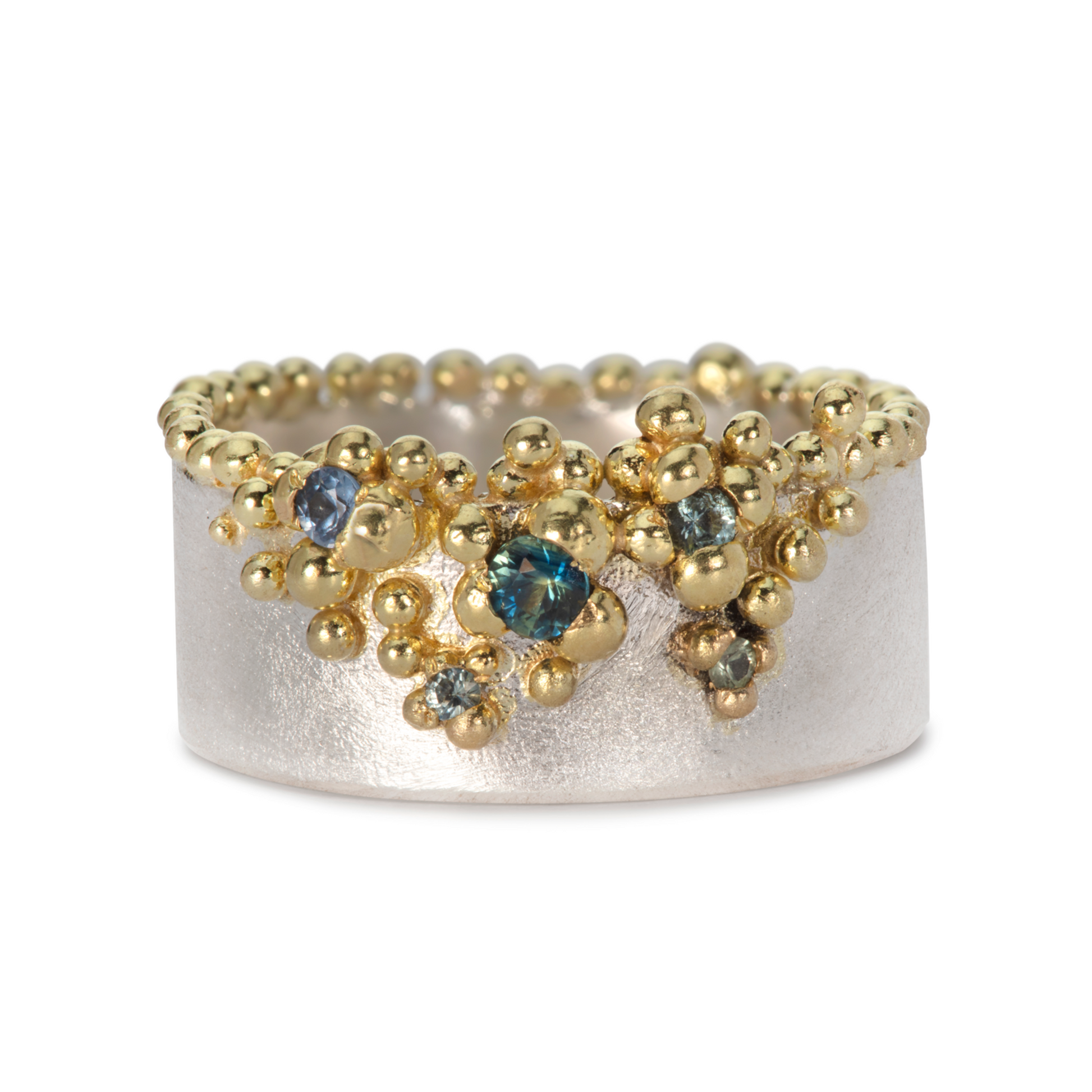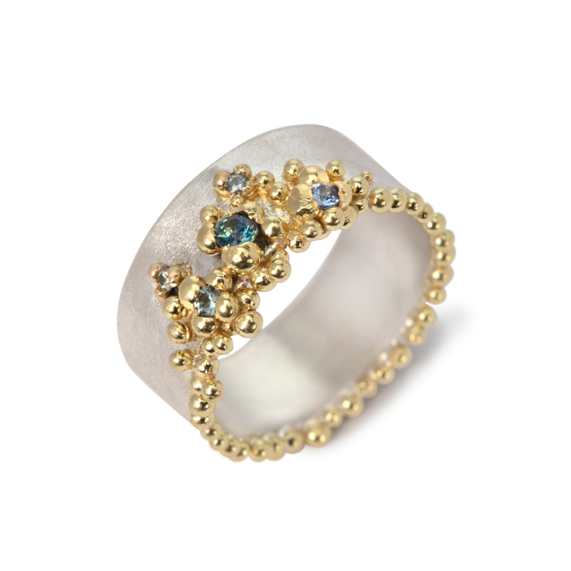 This bejewelled variation of the signature crown ring features a textured silver band, crowned in 18ct yellow gold granules and adorned with a scattering of ocean toned sapphires. The ethically sourced jewels in sea blues and greens are carefully nestled in between golden granules.