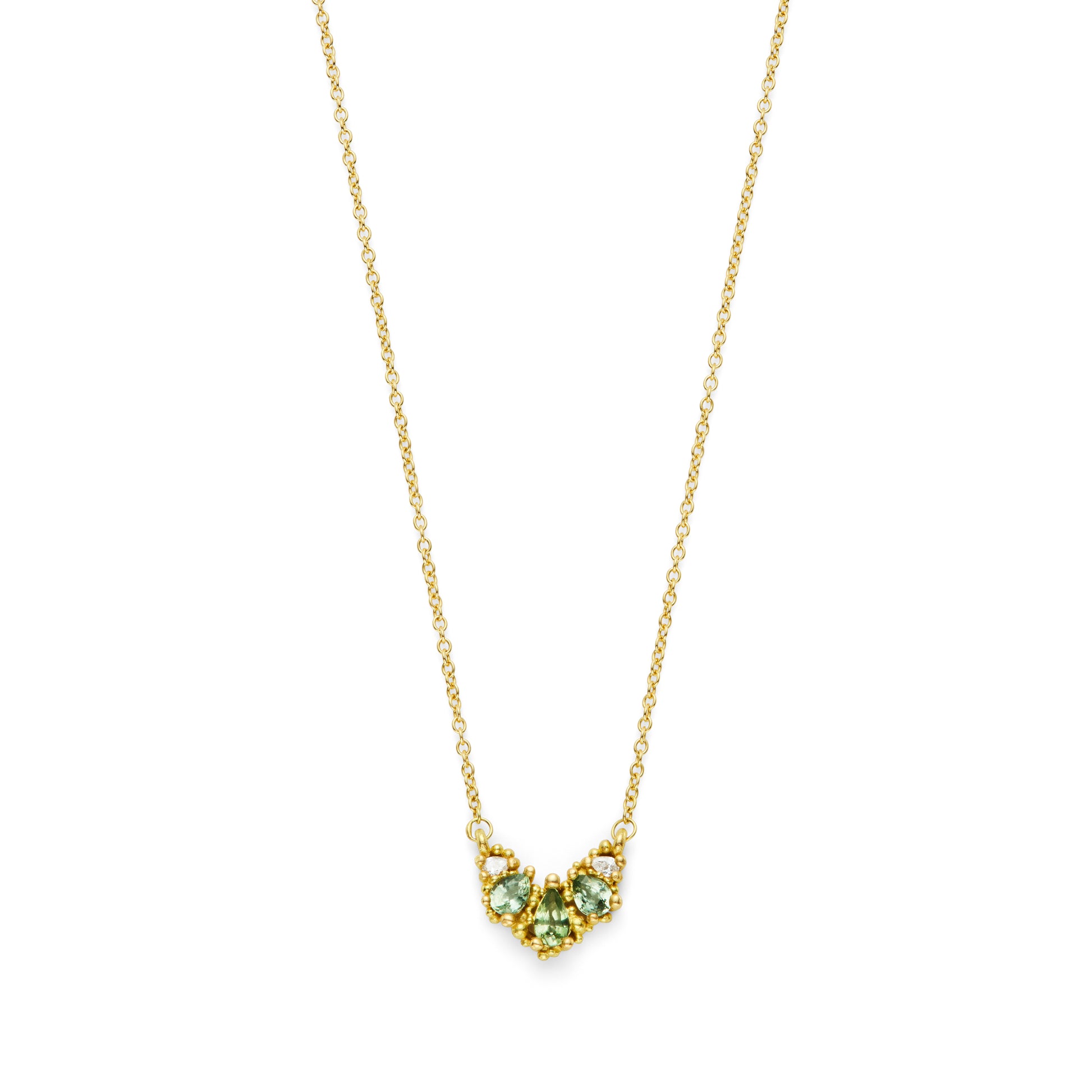 Five glorious green sapphire and white diamond 'droplets' are held in a gossamer of delicate 18ct granulation - evoking dewdrops sparkling on the leaves.