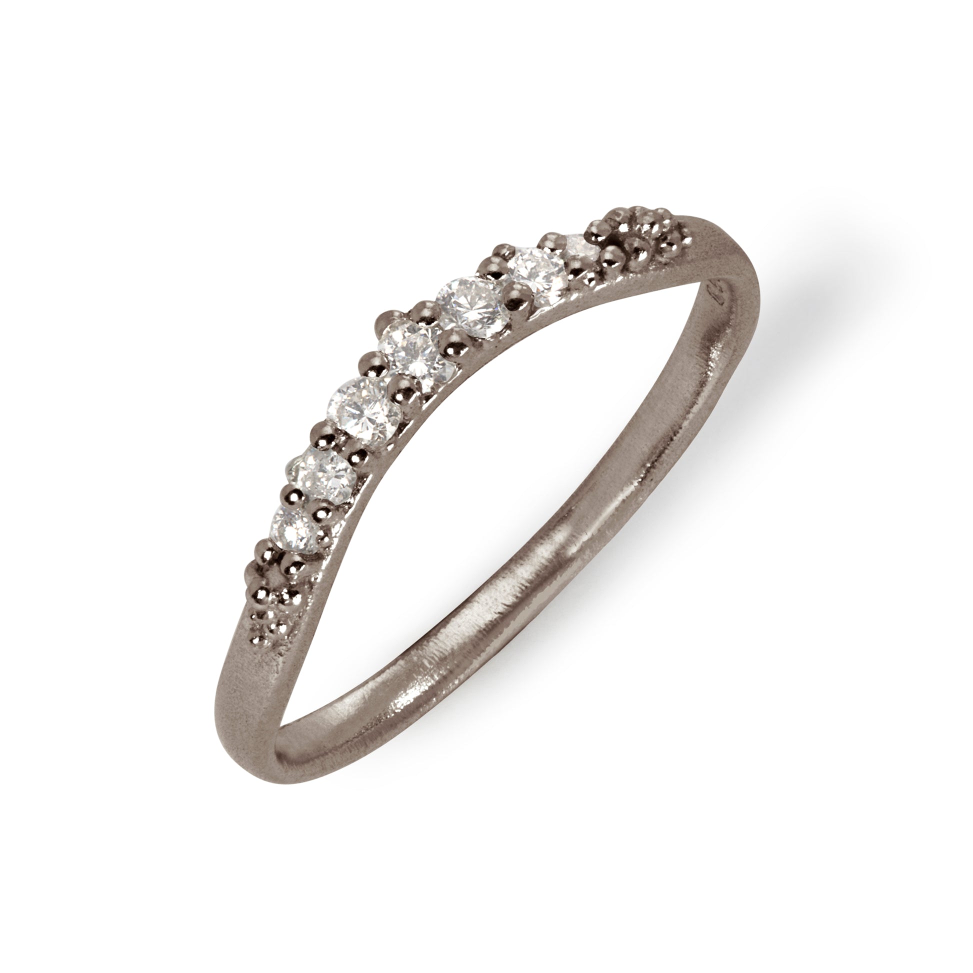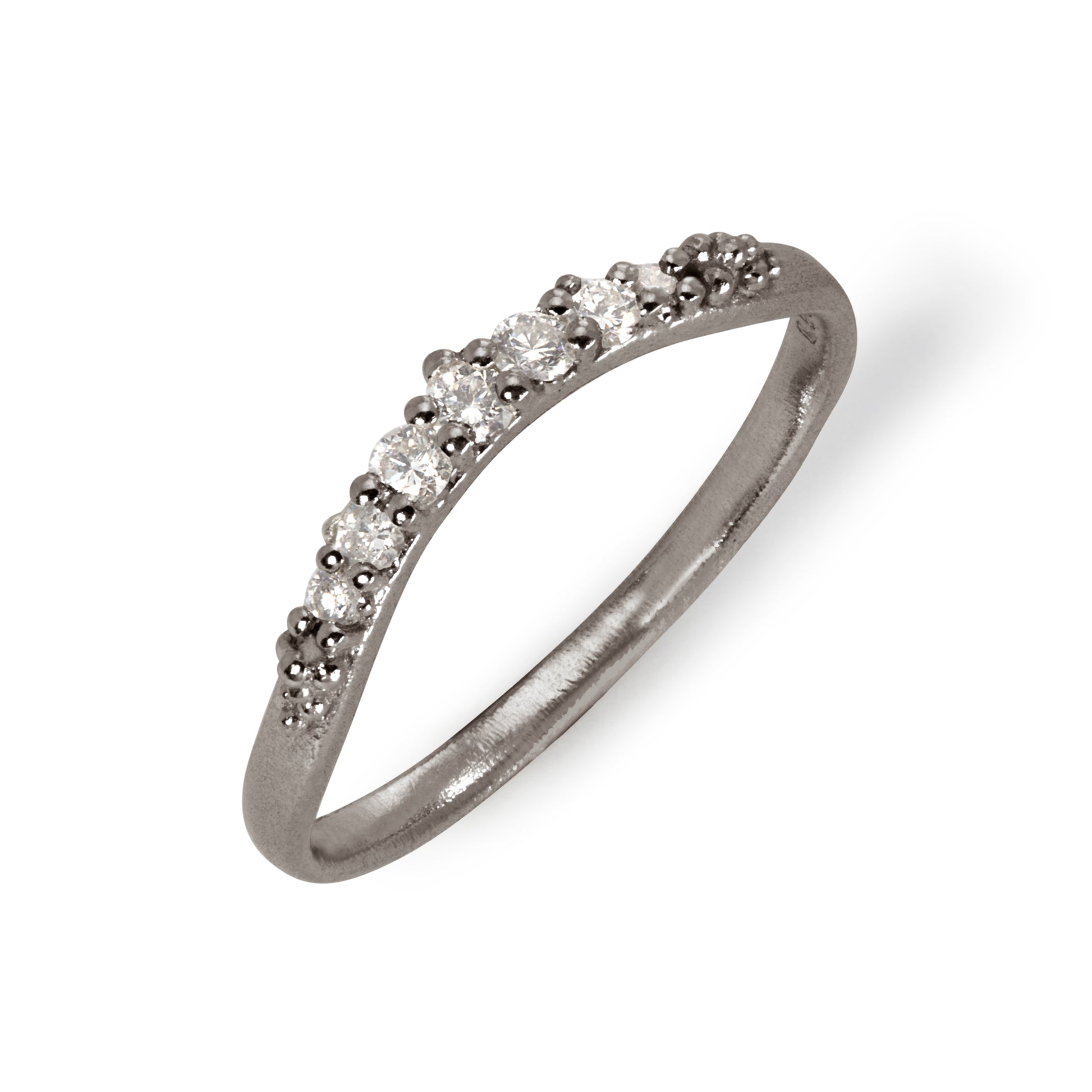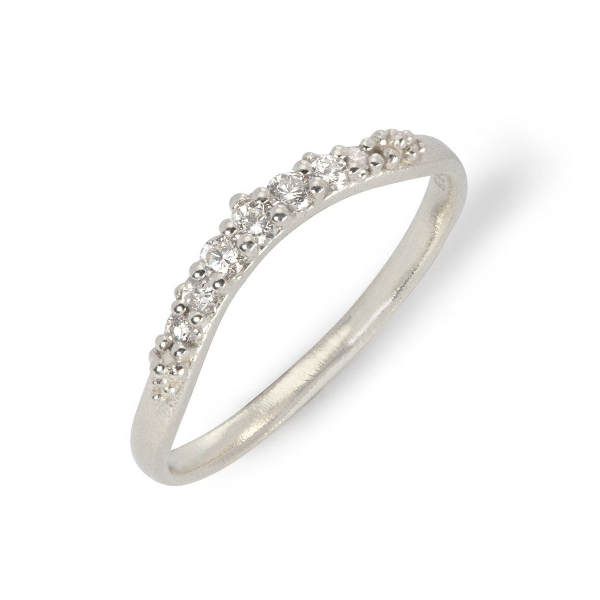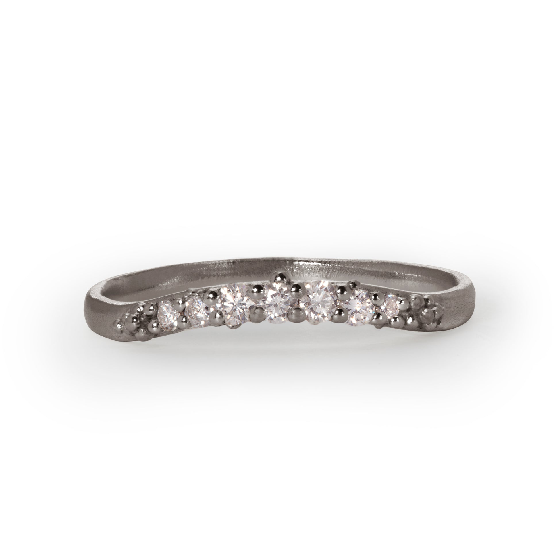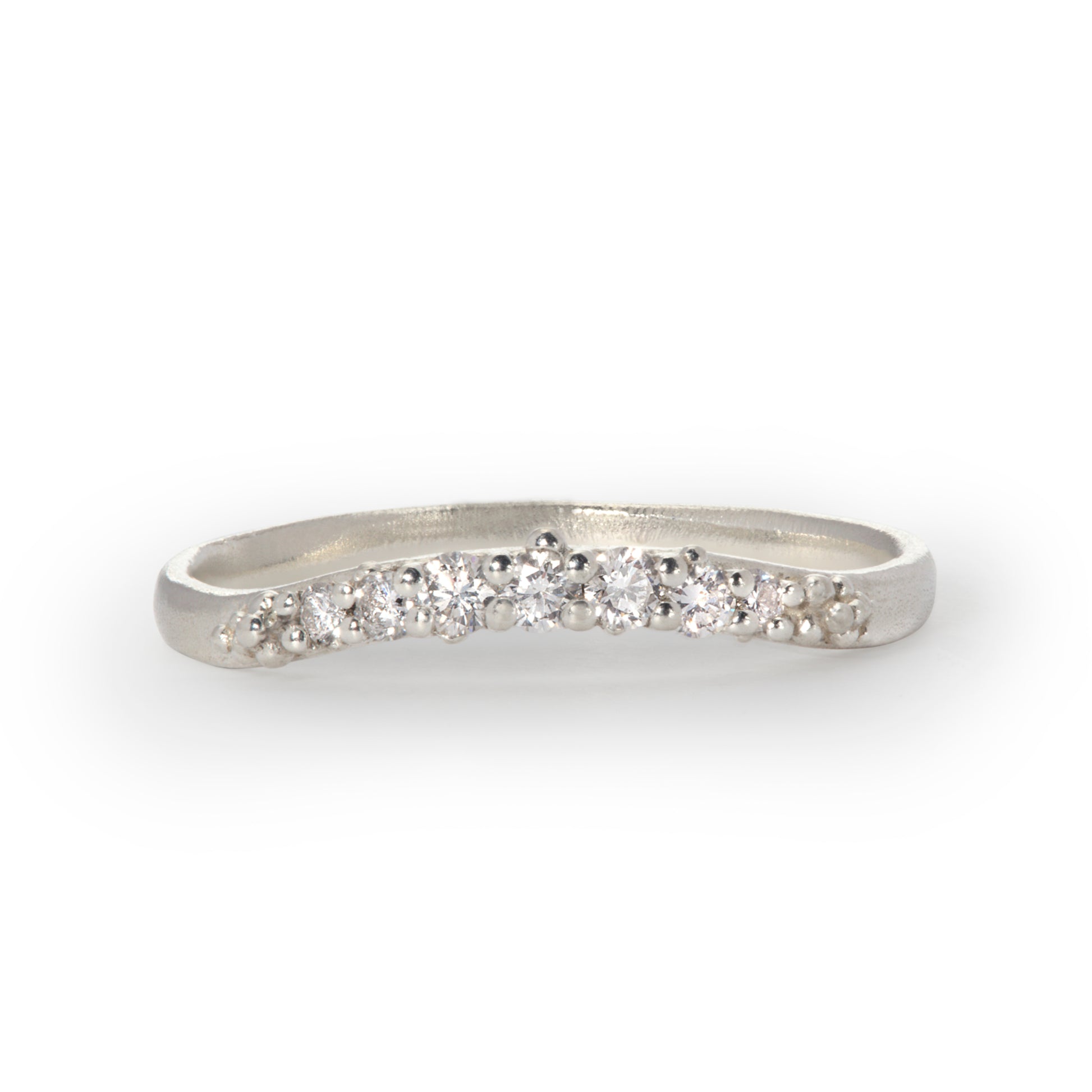 A beautiful wedding band, featuring contoured granulation, set with 7 sparkling  diamonds. The gentle curve enables the ring to sit next to a cluster ring.