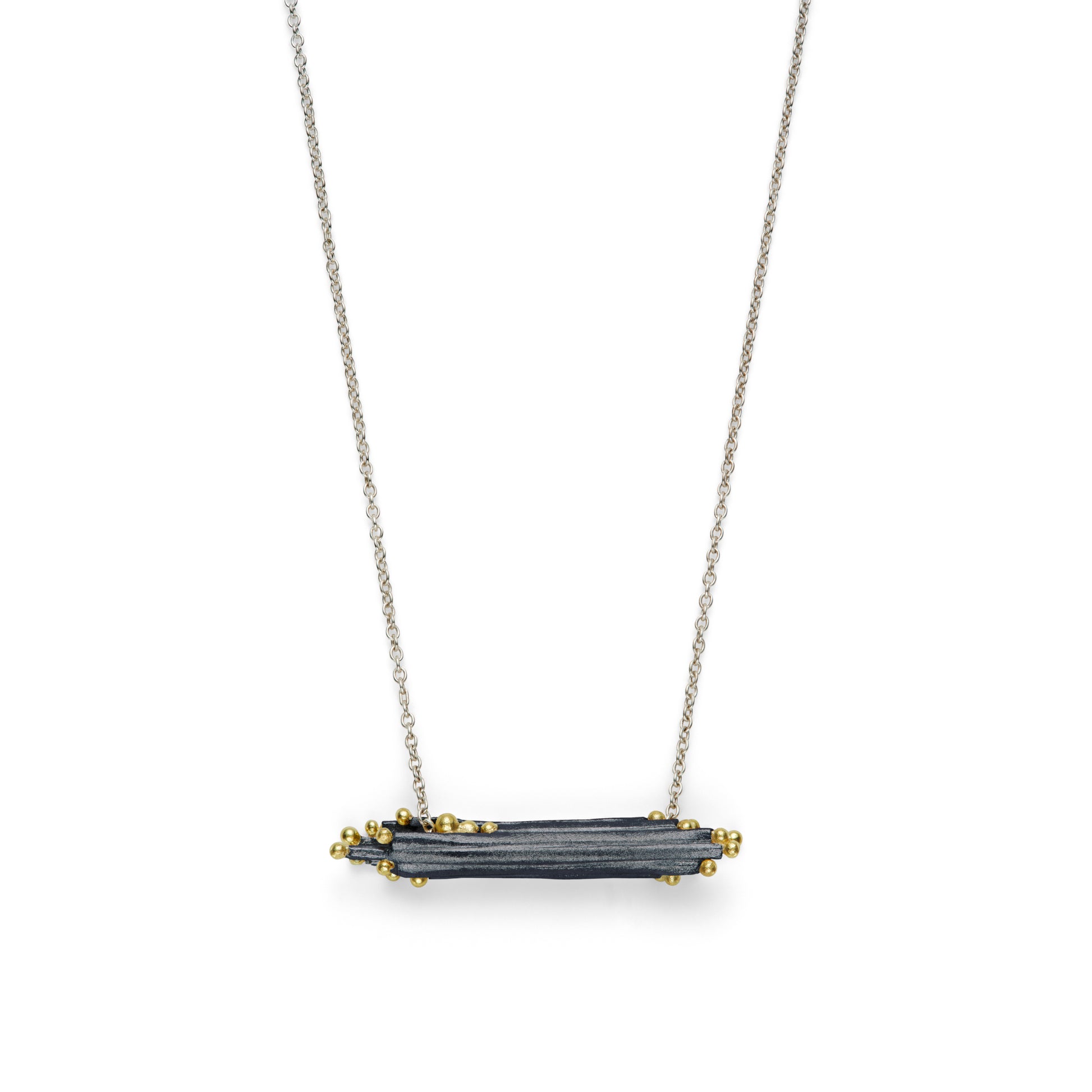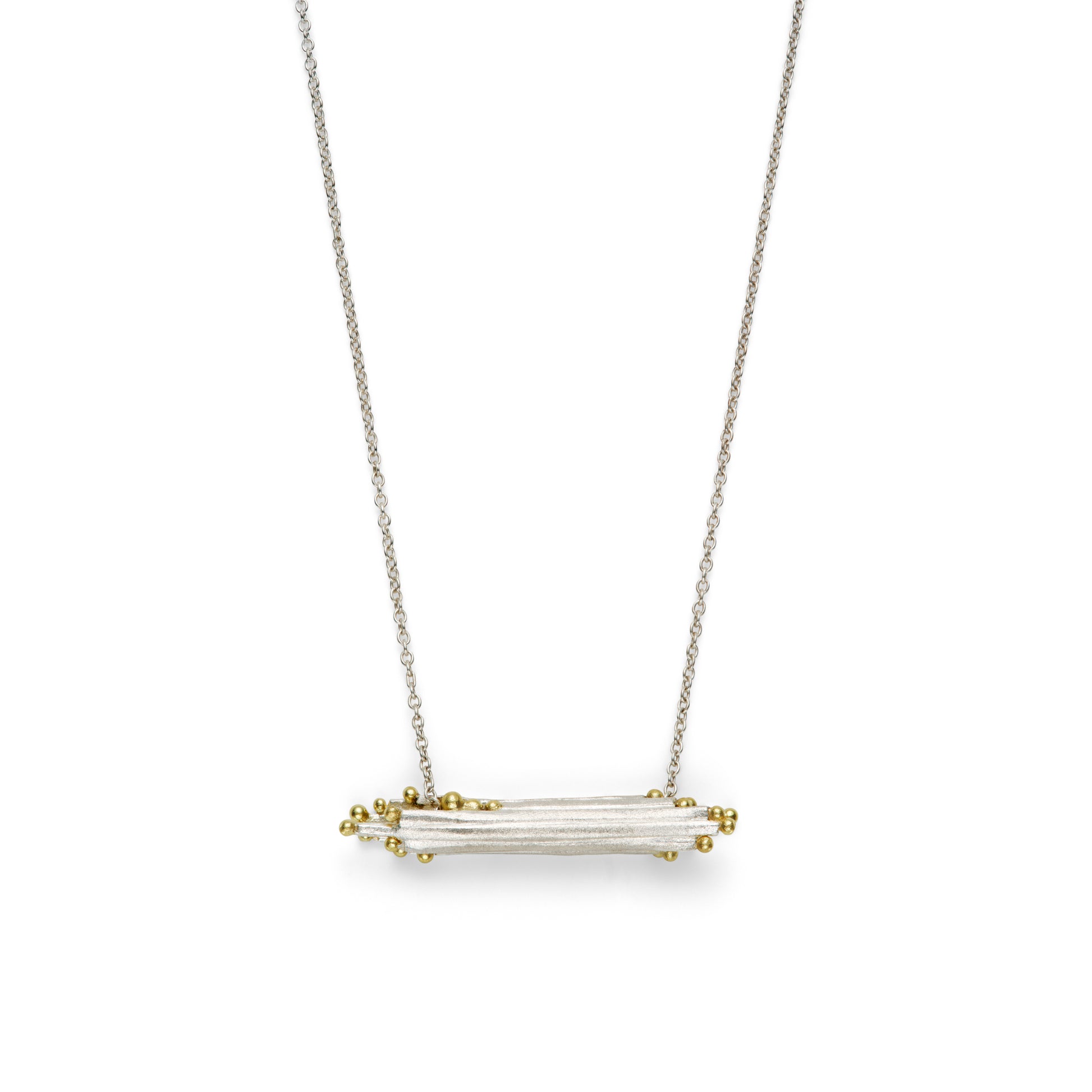 Suspended horizontally a cylindrical spinner pendant, created from strands of silver elements, is tipped with delicate droplets of gold. Like weathered driftwood, the form has richly textural-line and irregular edges. The sense of movement adds to the tactile quality of the piece.