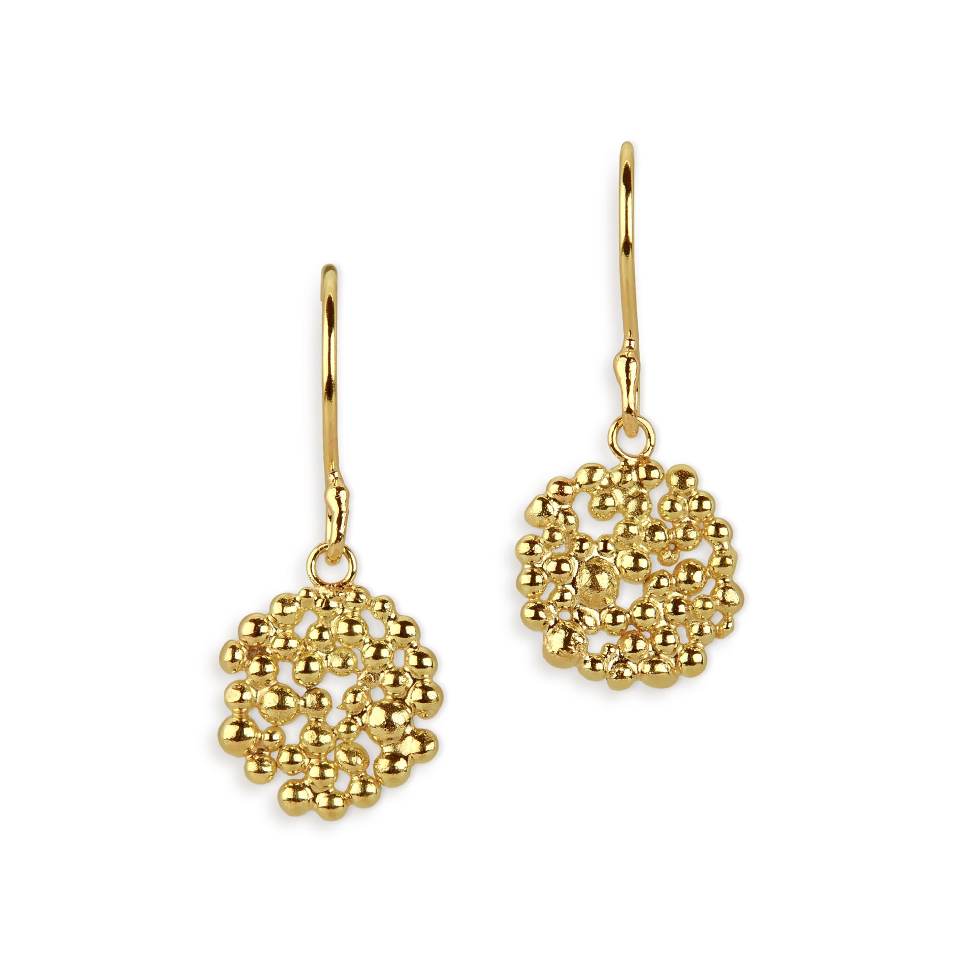 A single disc of shimmering gold granules drops elegantly in these pretty gold earrings.