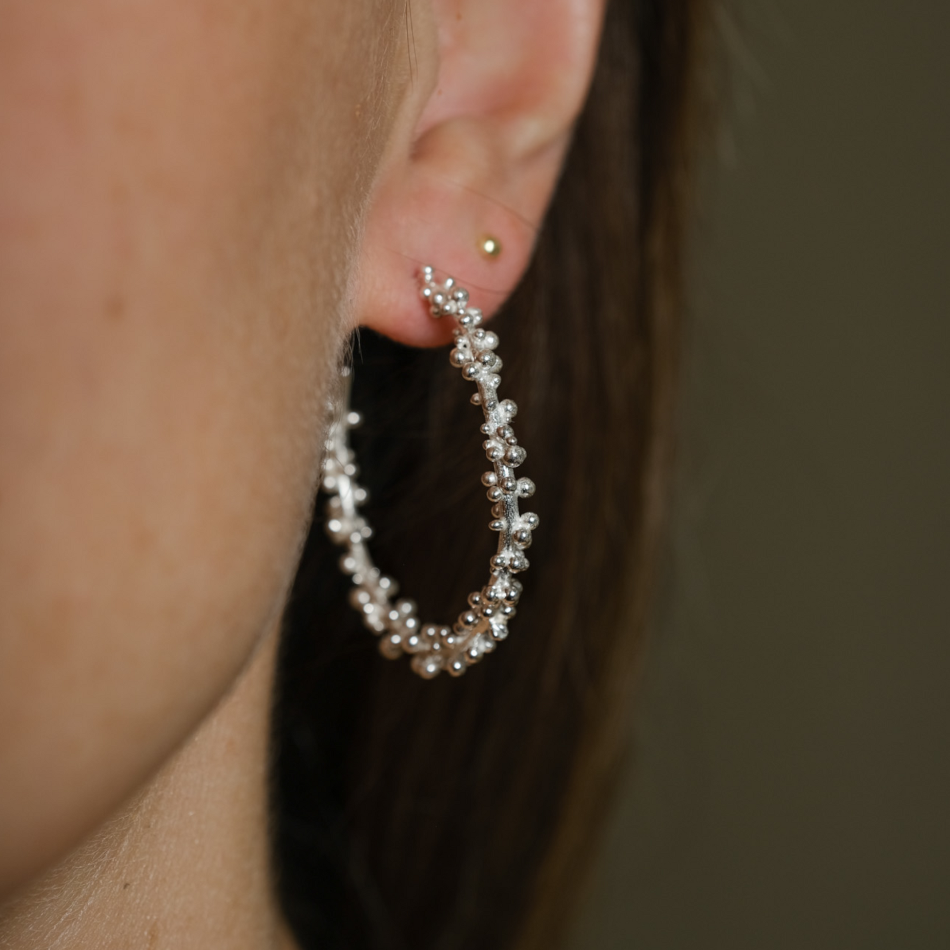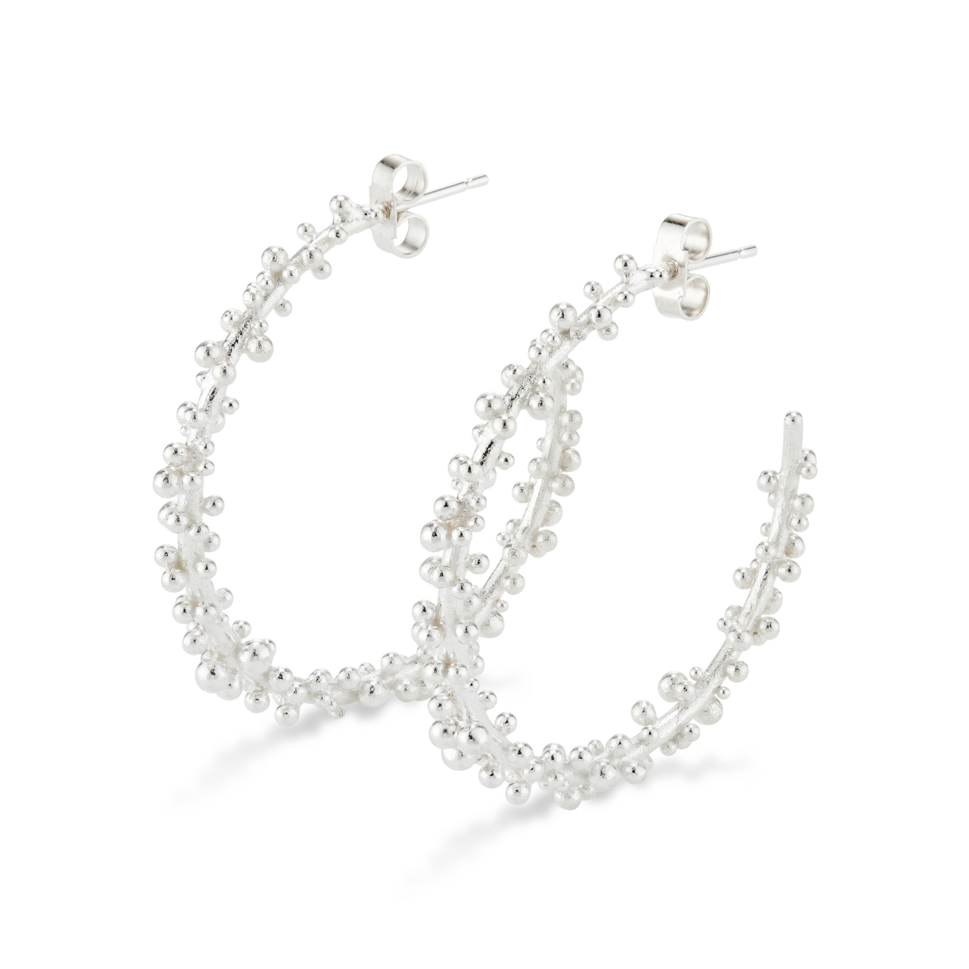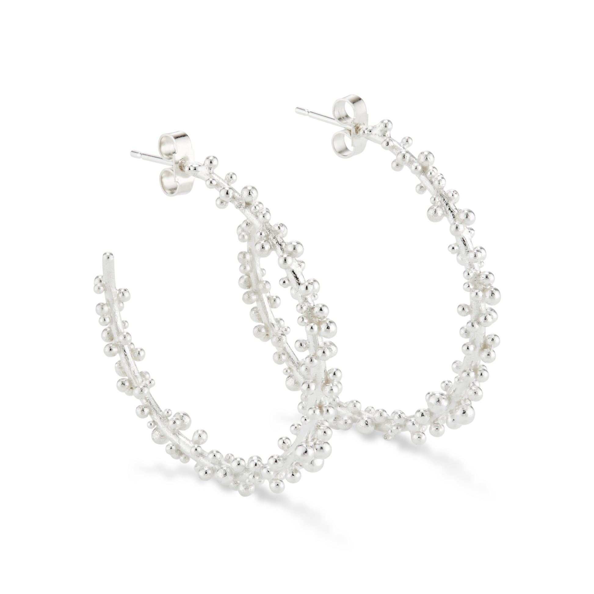These signature hoop earrings are elegantly encrusted with silver granules.