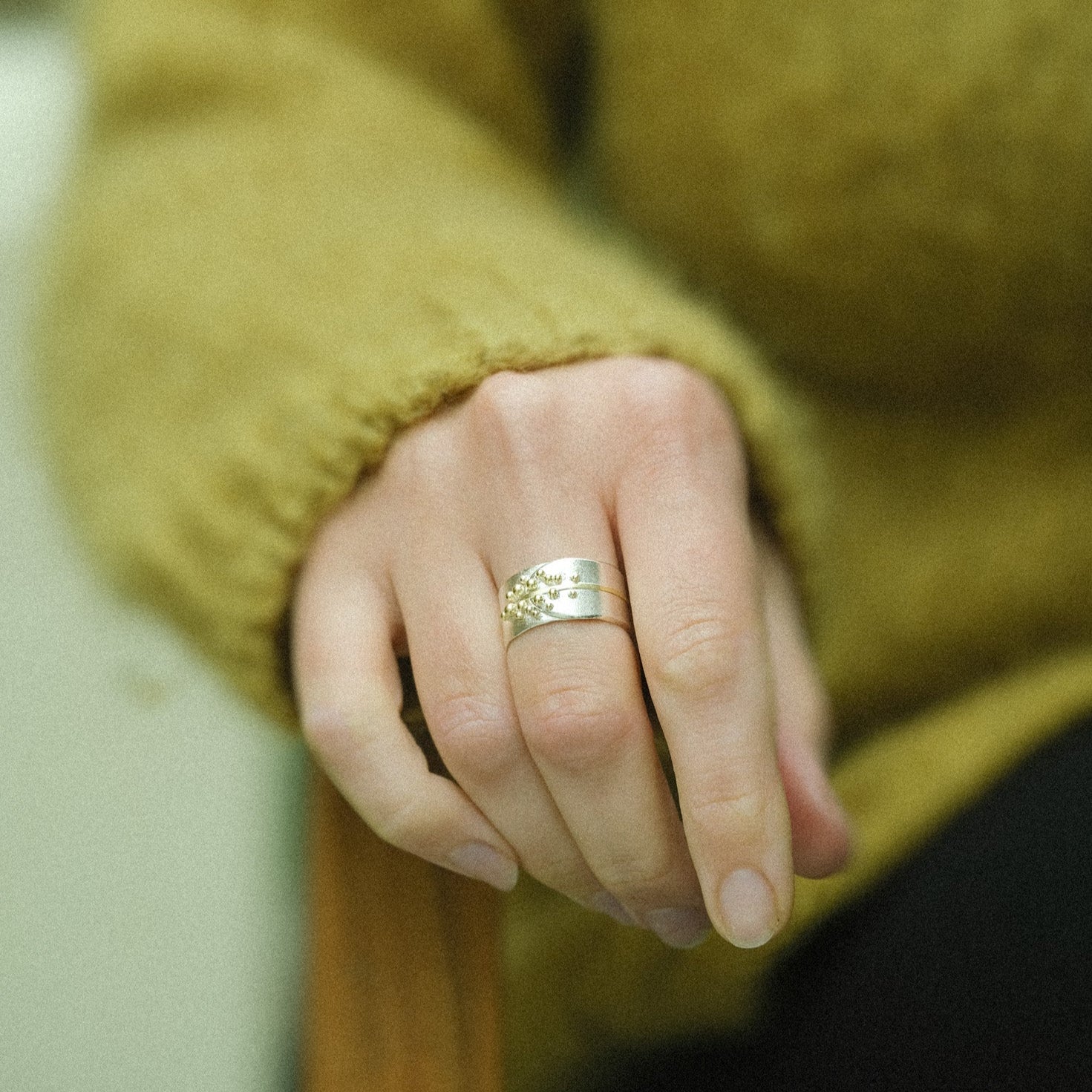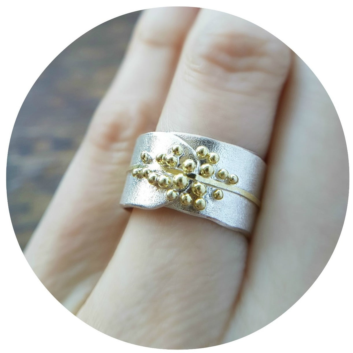 An overlapping band of shimmering silver, 1cm in width, is wrapped in a beautiful loop of 18ct Gold and adorned with a scattering of gold granulation.