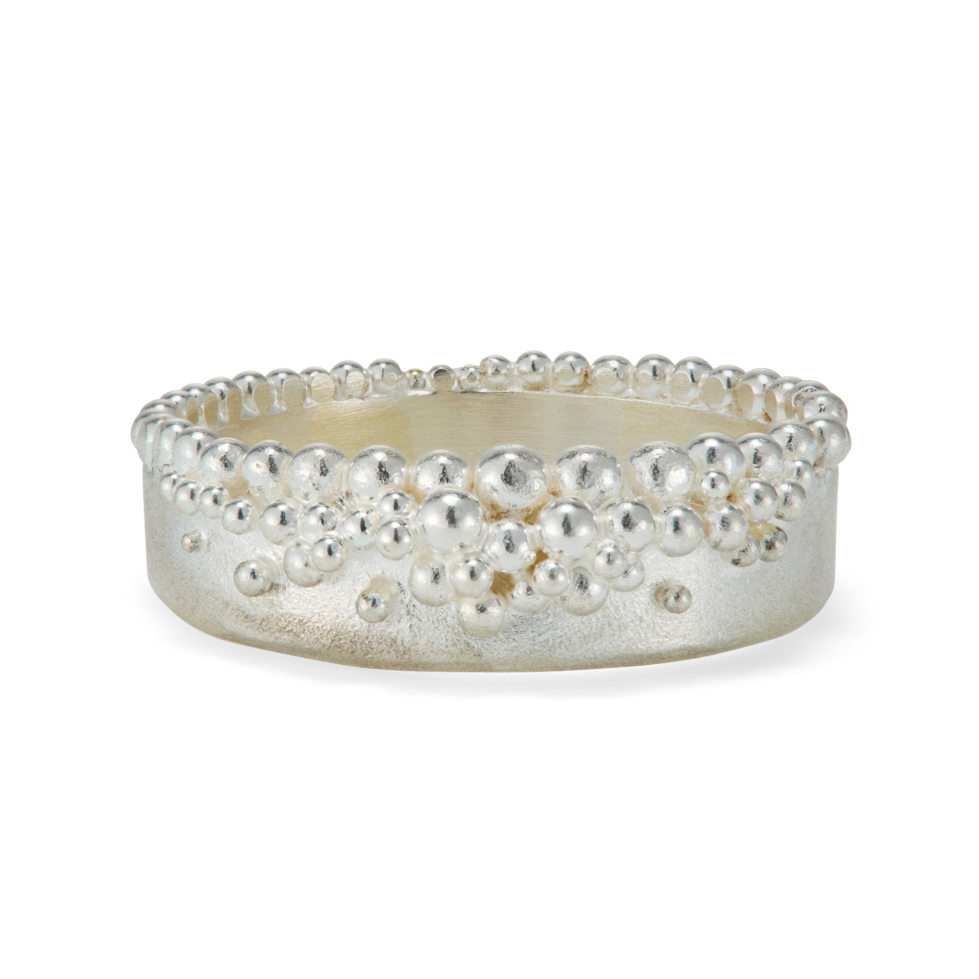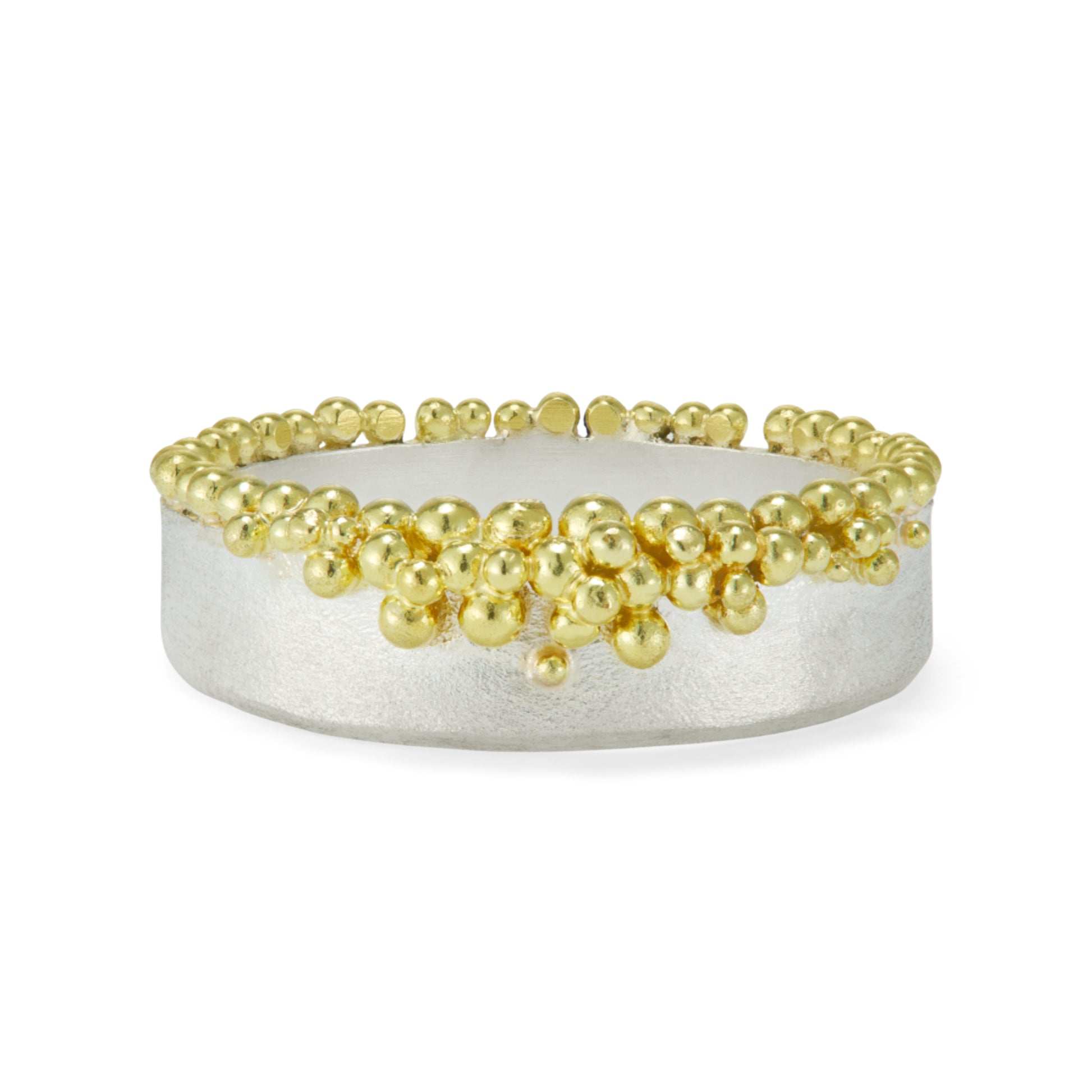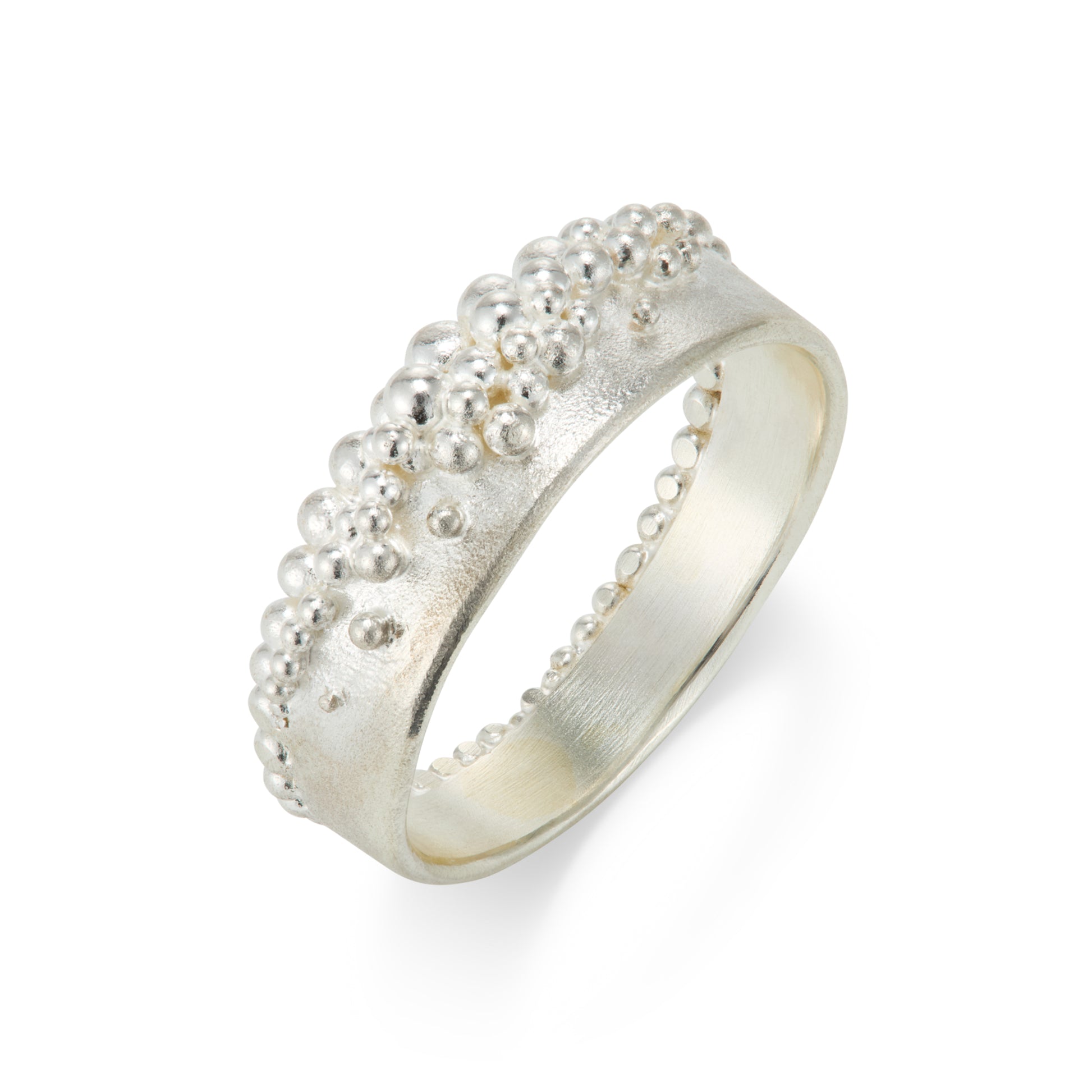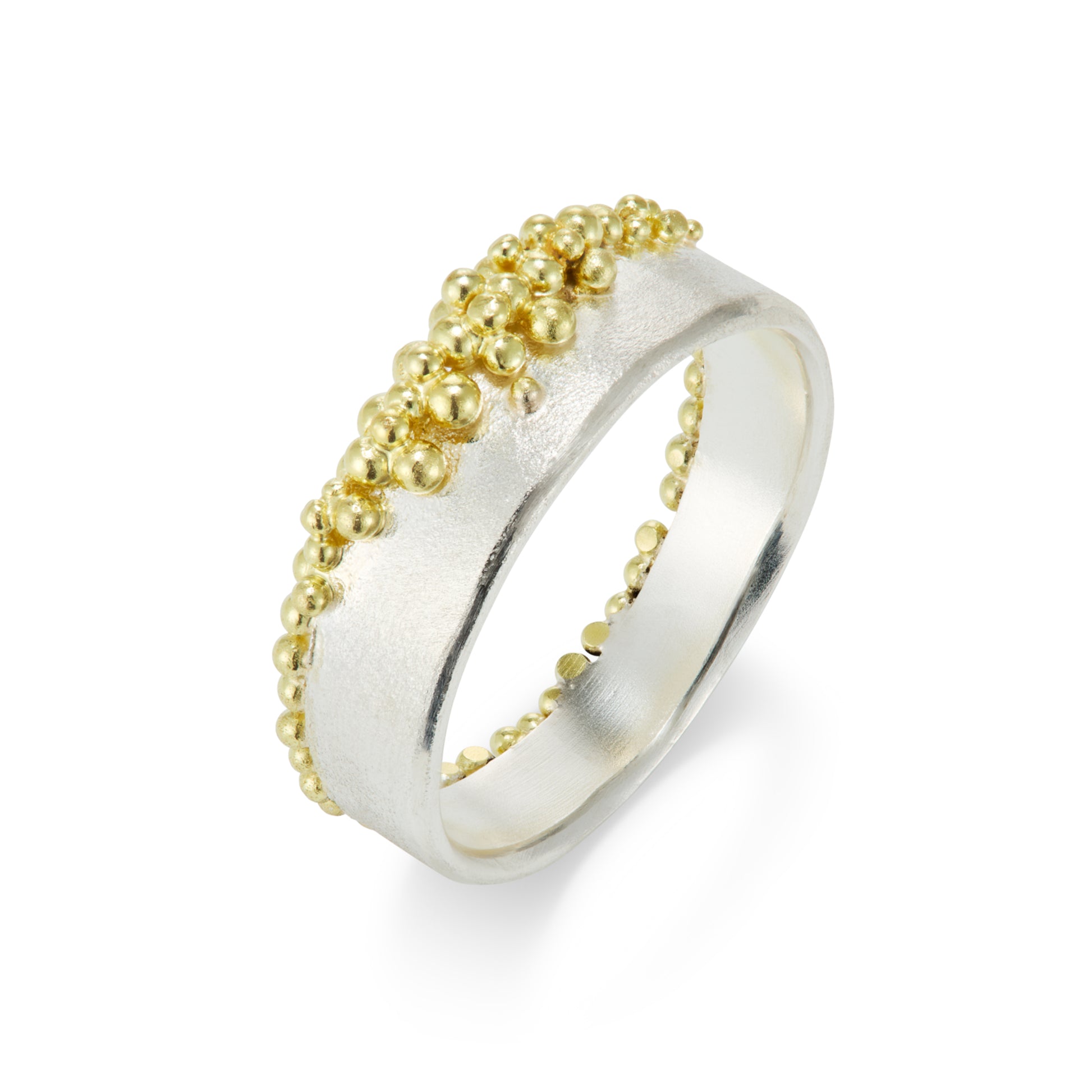 A textured silver band is edged with a crown of shimmering granulation which flows onto the rings surface. Available in silver or silver & 18ct yellow gold.