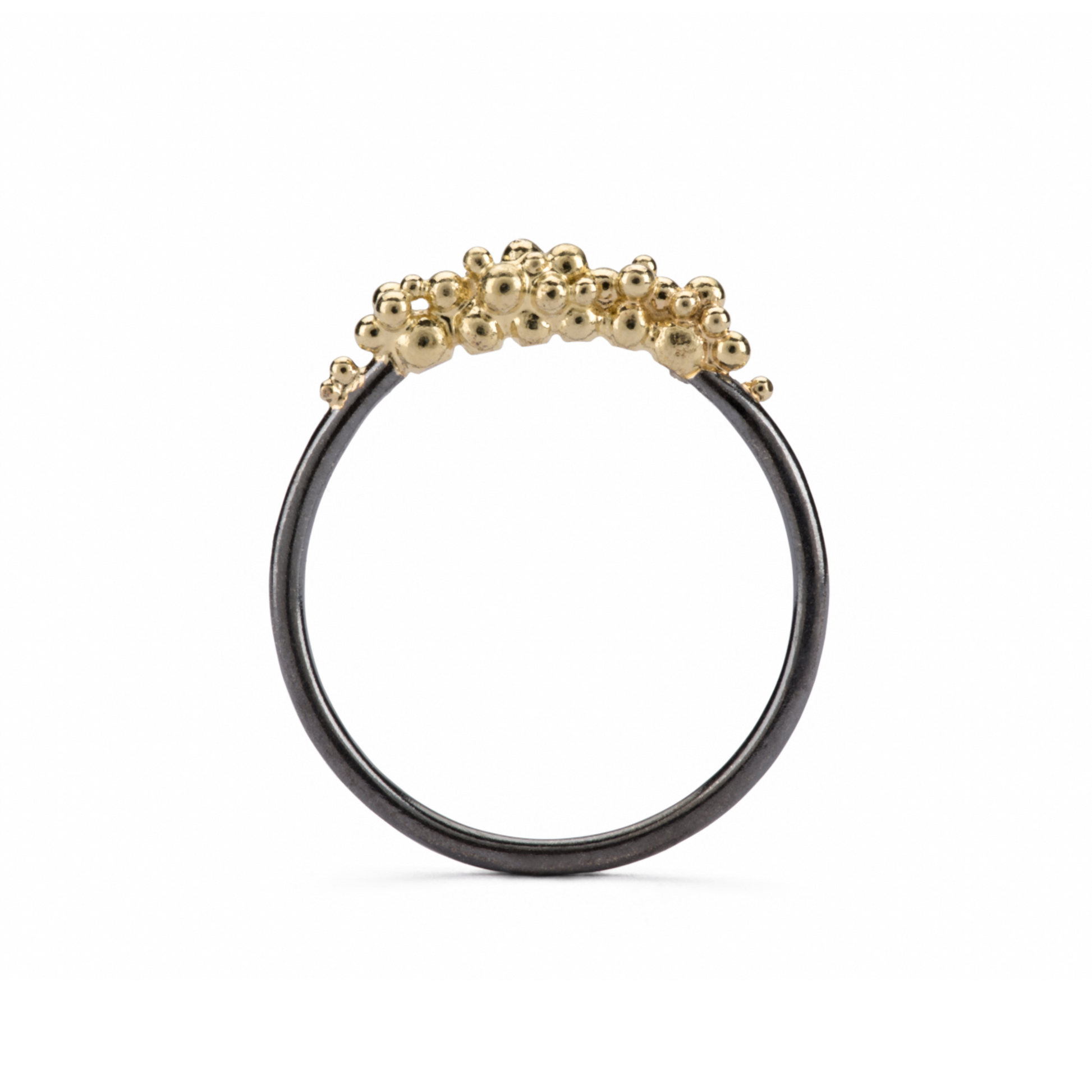This exquisitely delicate ring is partially encrusted with fine 18ct yellow gold granulation with an oxidised Silver band.