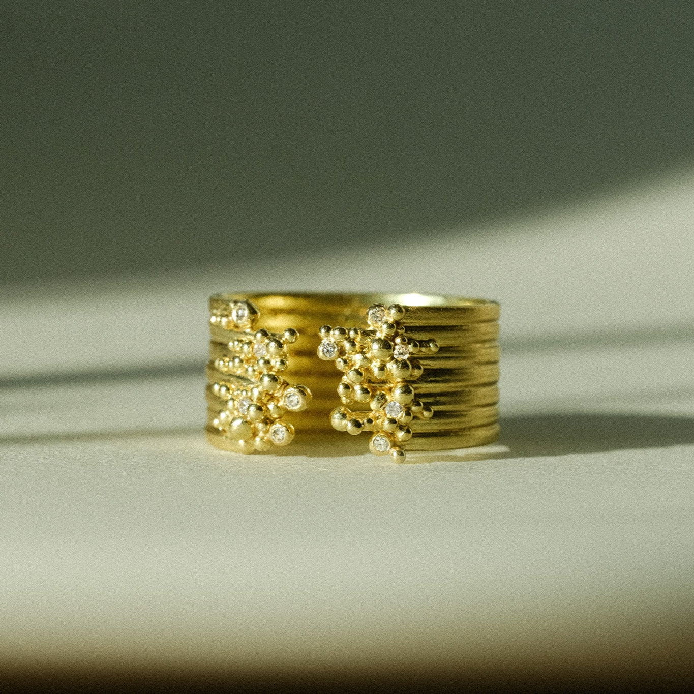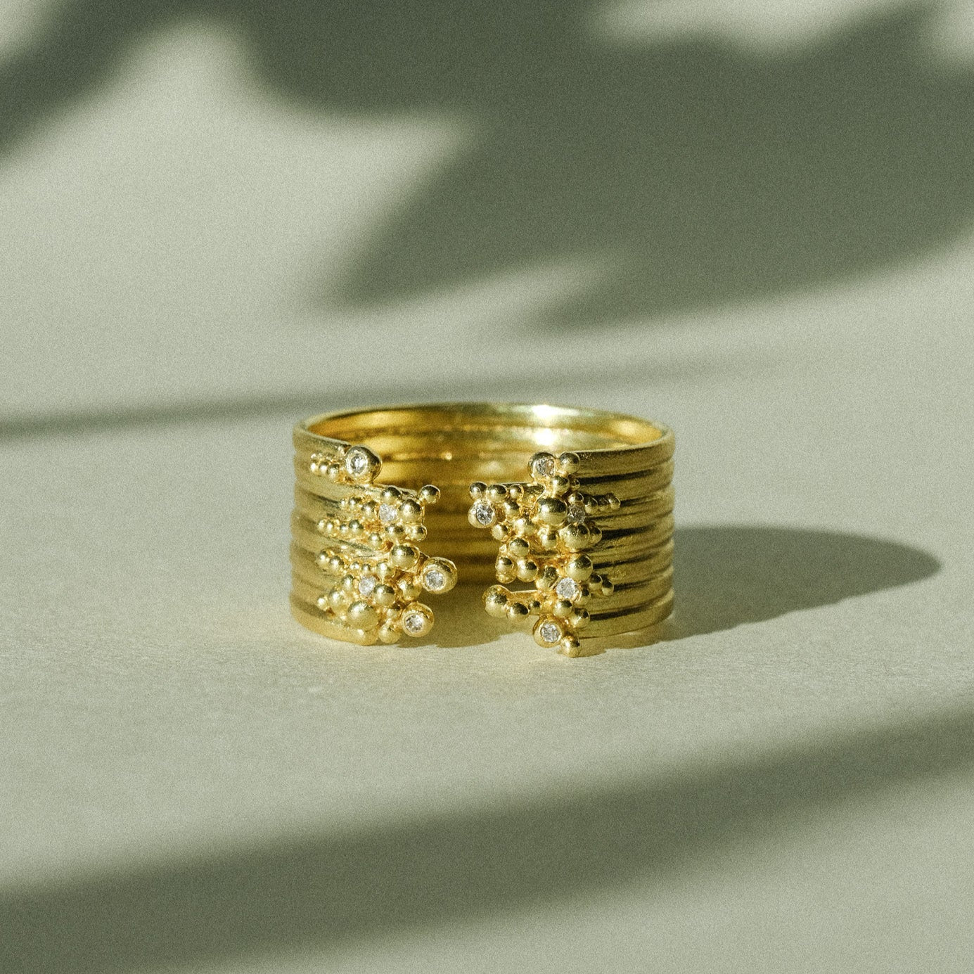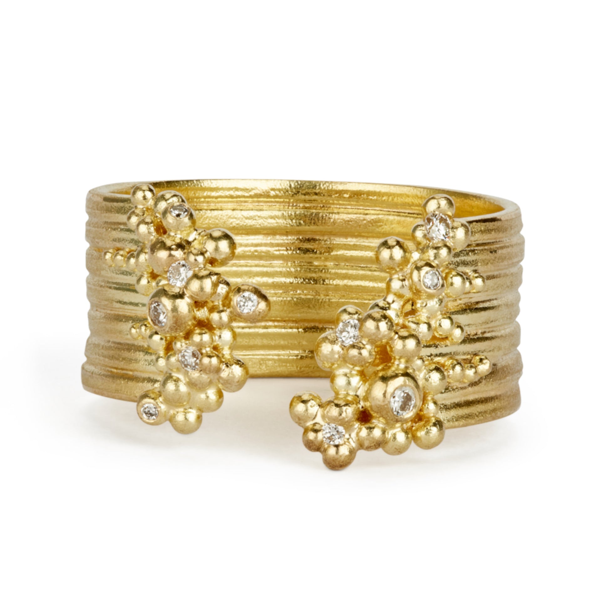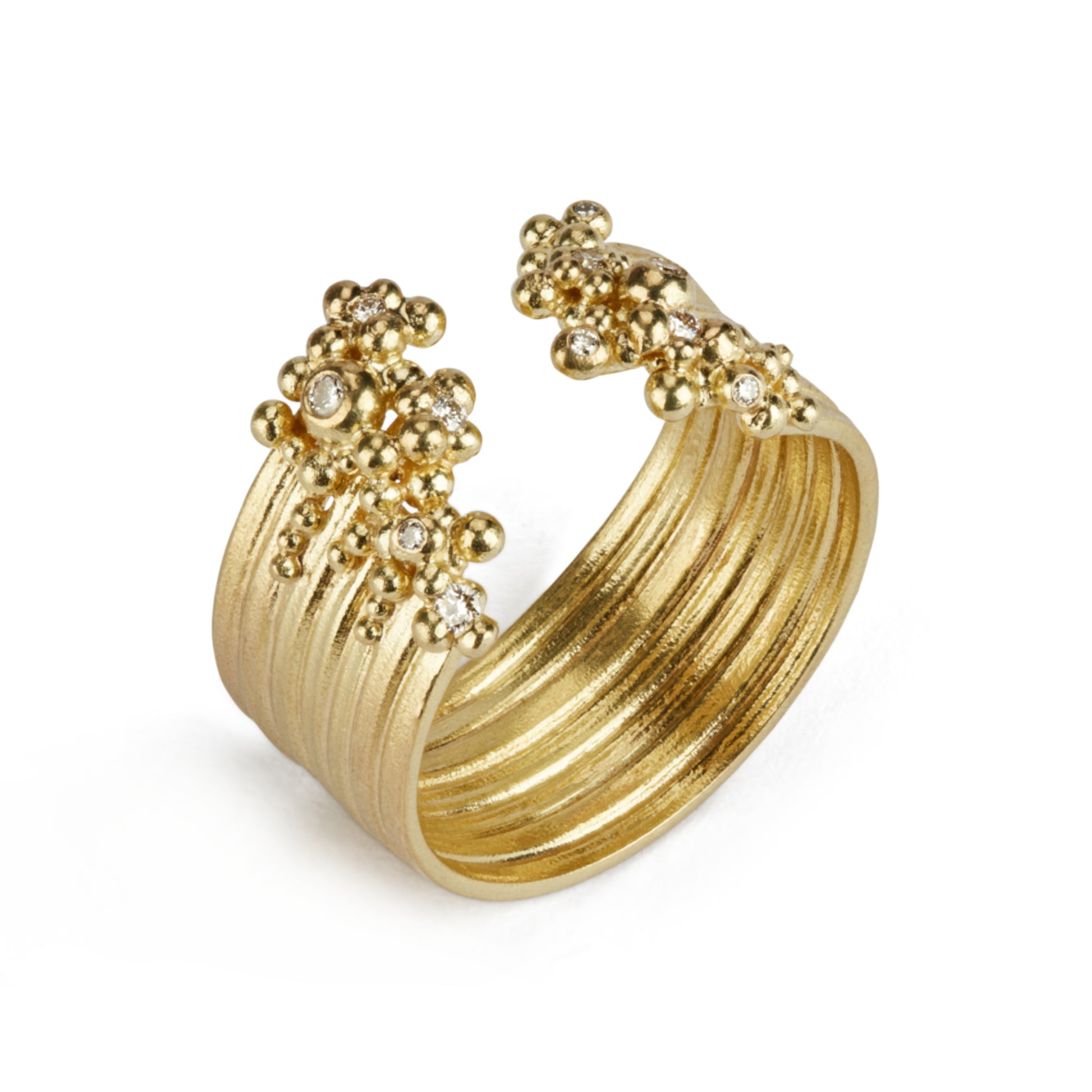 A swell of 18ct yellow gold strands are adorned with droplets of golden granulation and a froth of shimmering white diamonds. Read more about Hannah's granulation process and inspiration here >