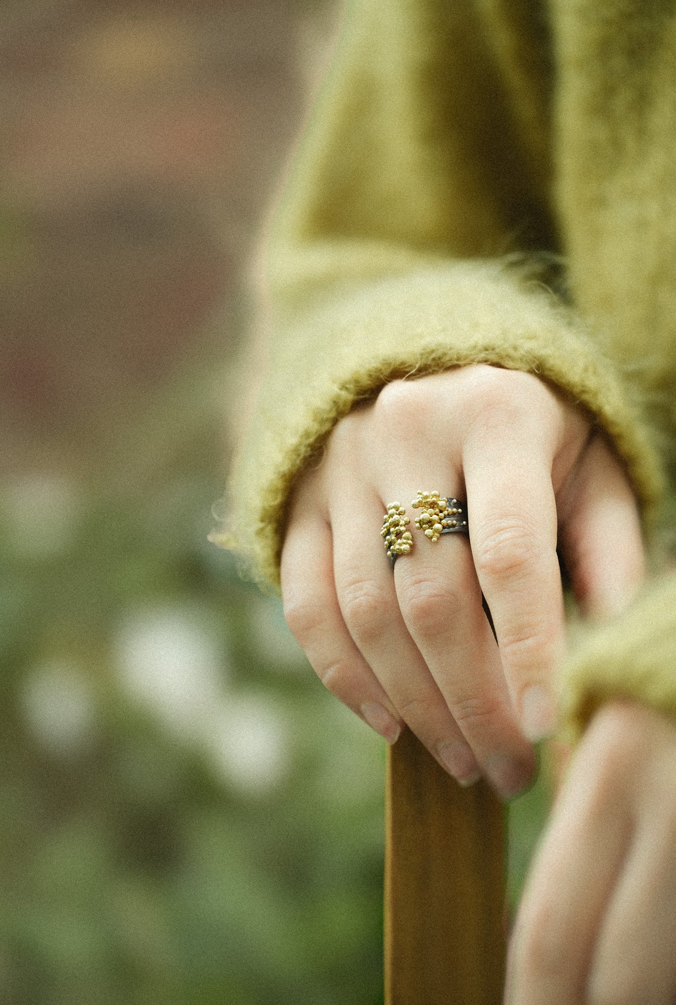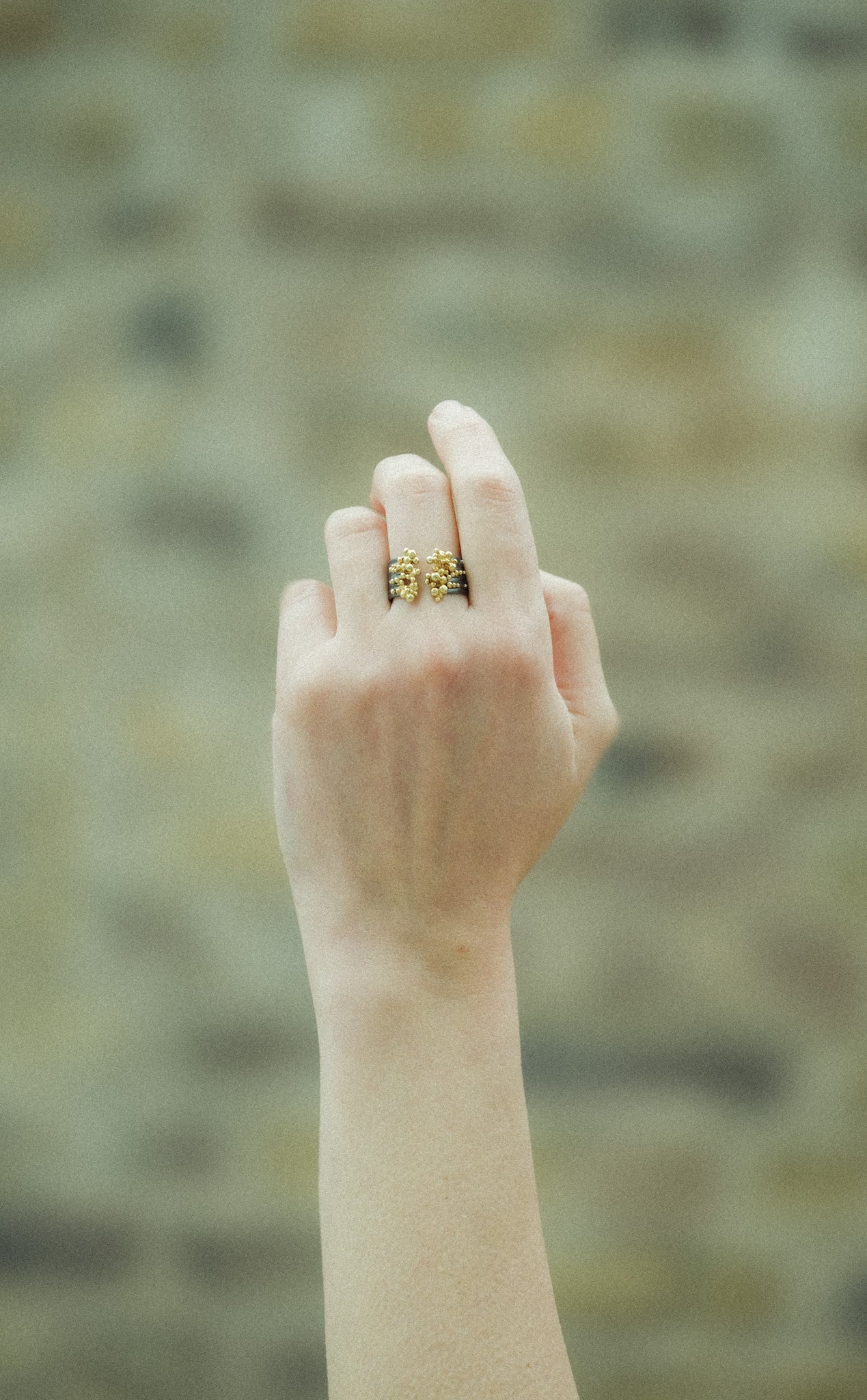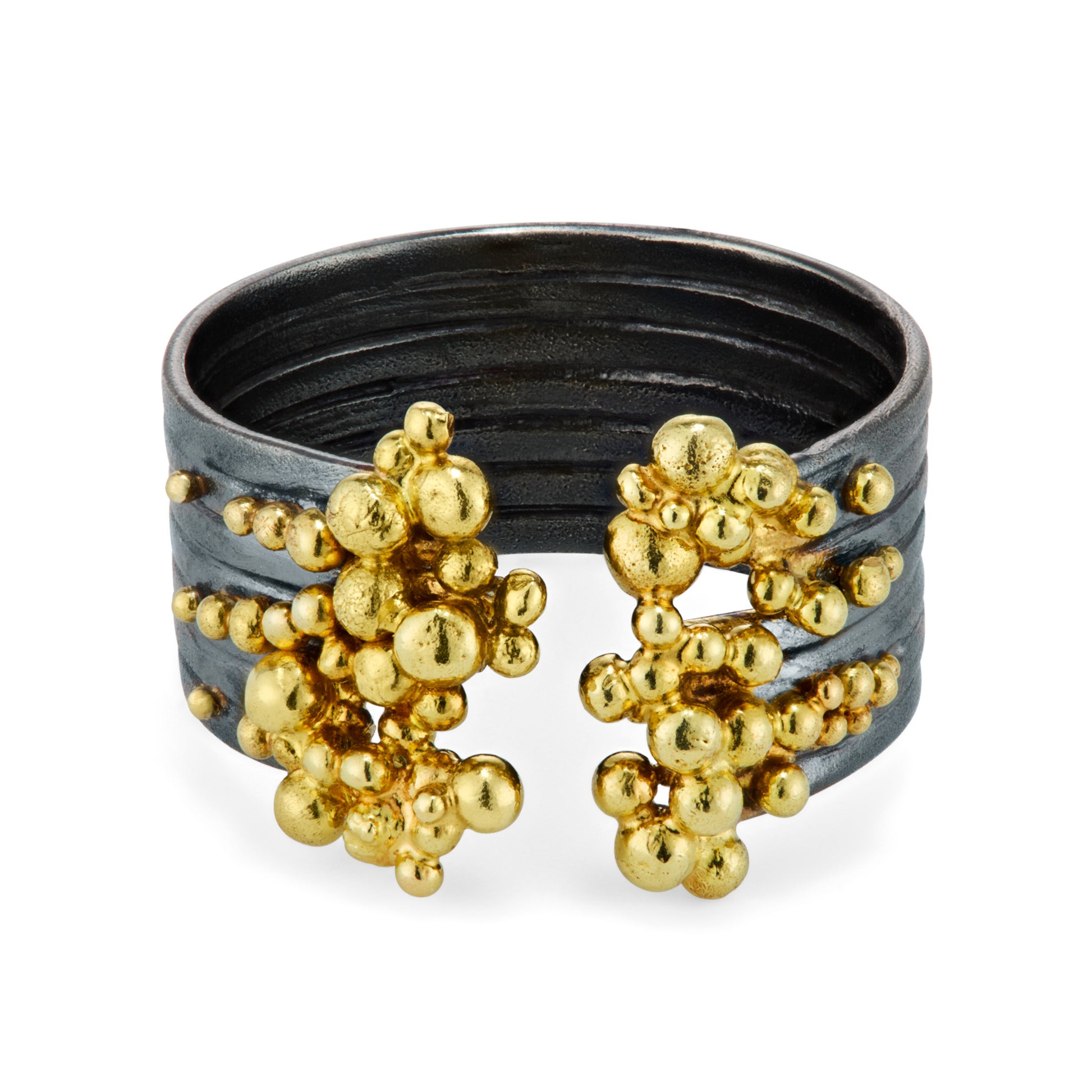 A swell of oxidised silver strands are adorned with droplets of golden granulation in this dramatic wider variation of the low tide ring.