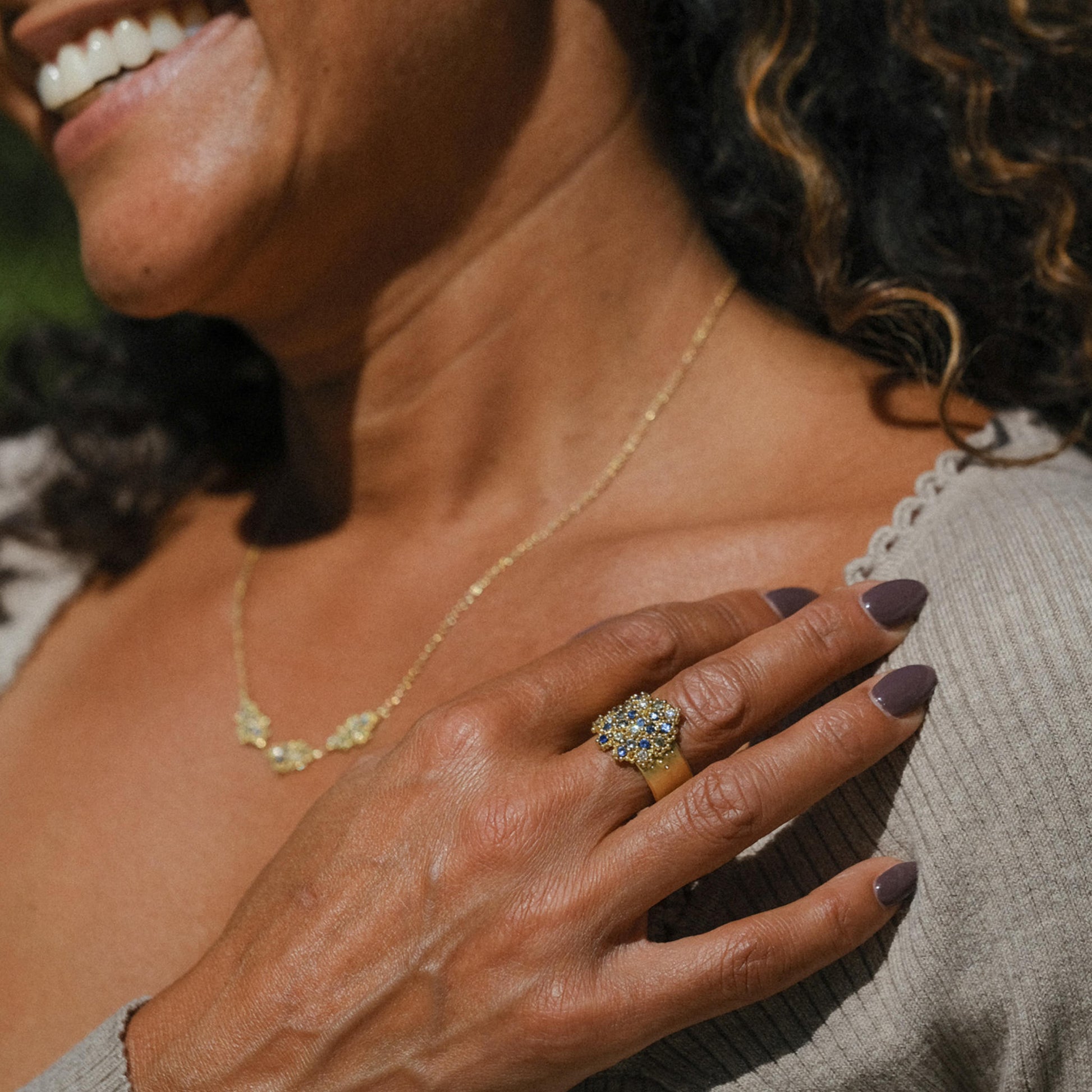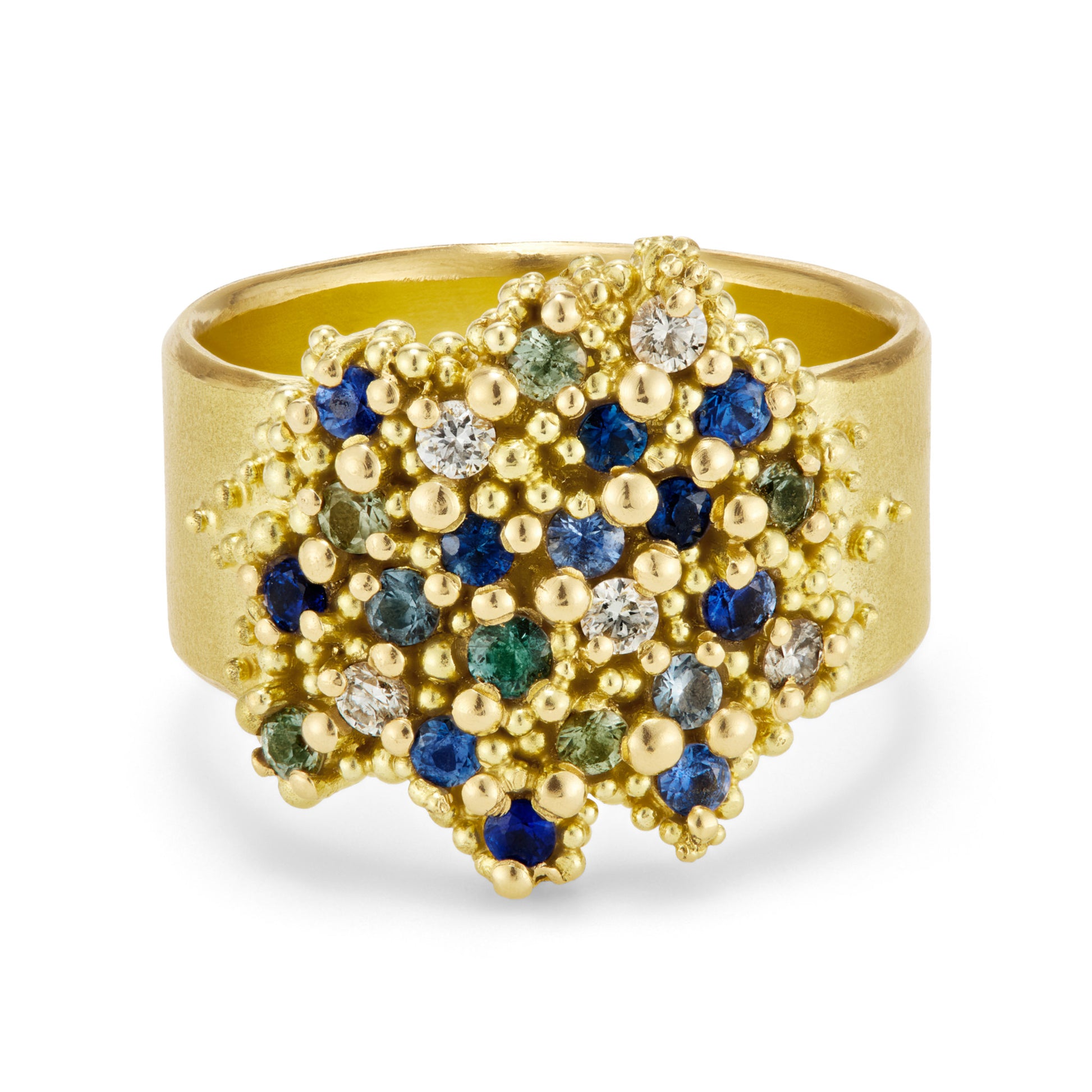Drawing on the ethereal beauty of 'Mareel' bioluminescence this statement ring features a shimmer of 24 diamonds and ocean tones sapphires. All encased in a lavish flow of rich 18ct yellow gold granulation.