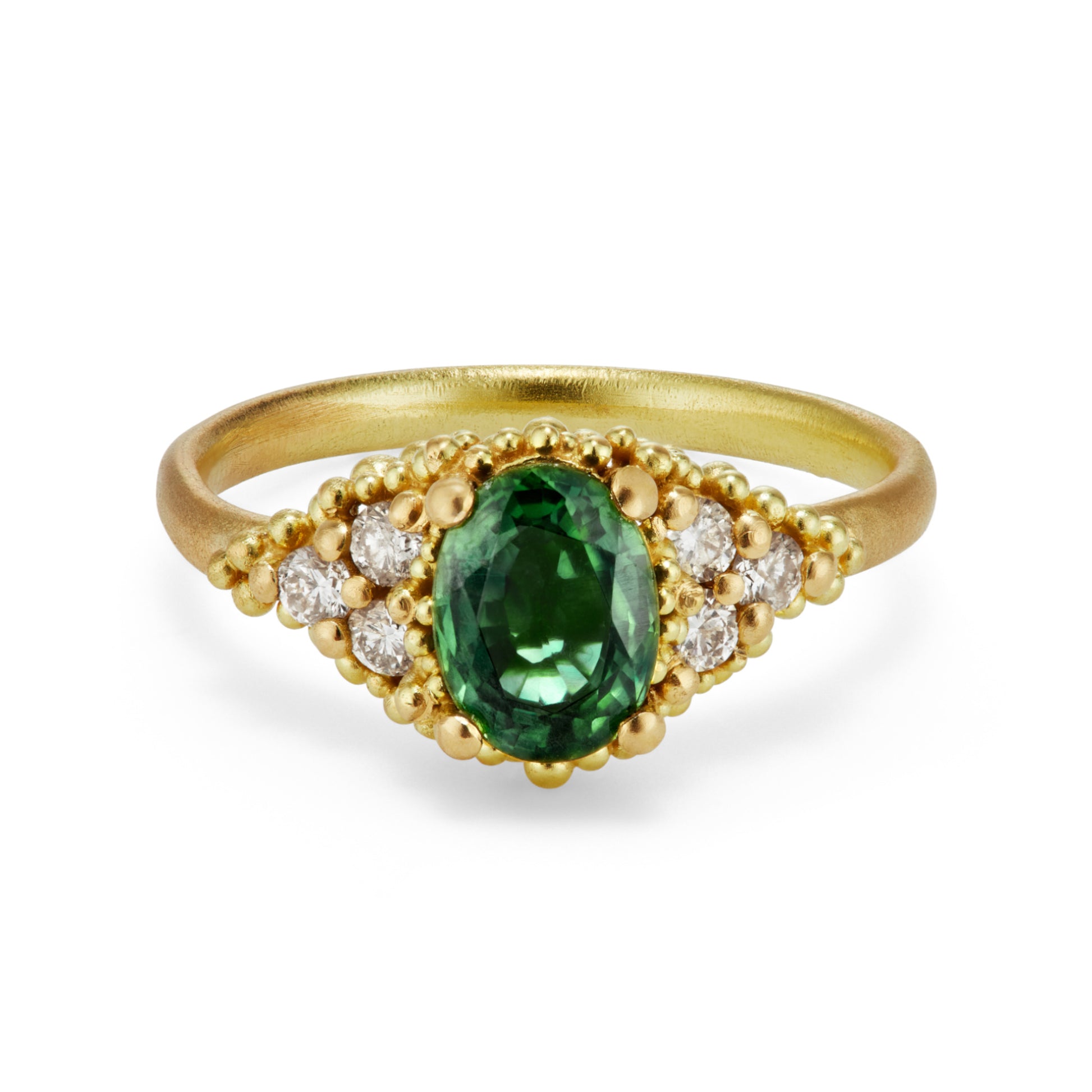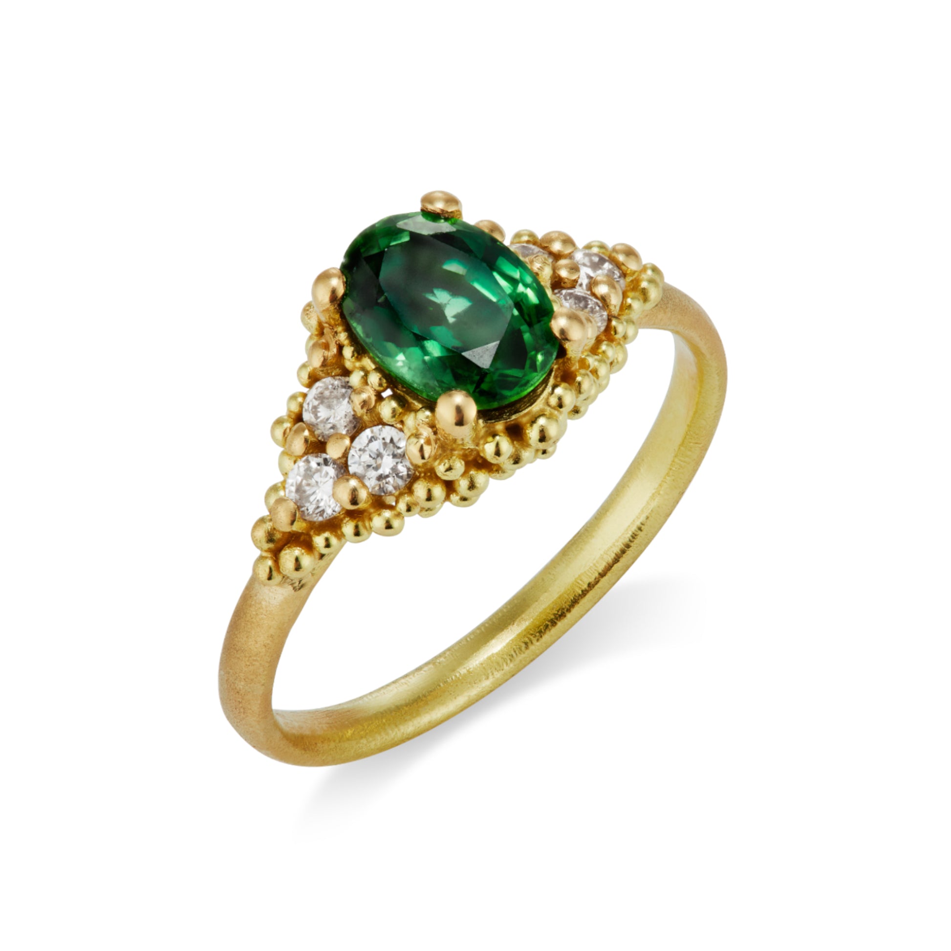 A vibrant green oval sapphire is flanked with bursts of white diamonds and nestled in lavish yellow gold granulation. This ring has a gentle taper to the granulation, cascading down the ring.