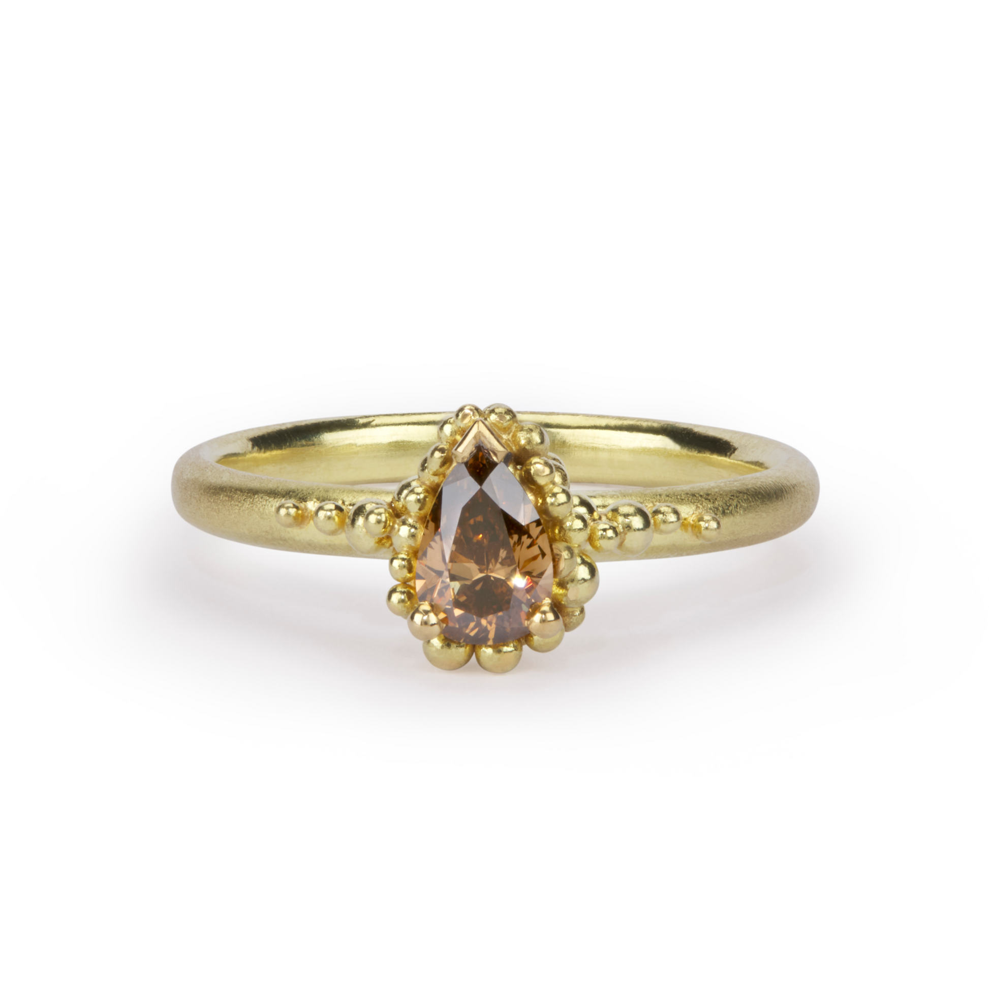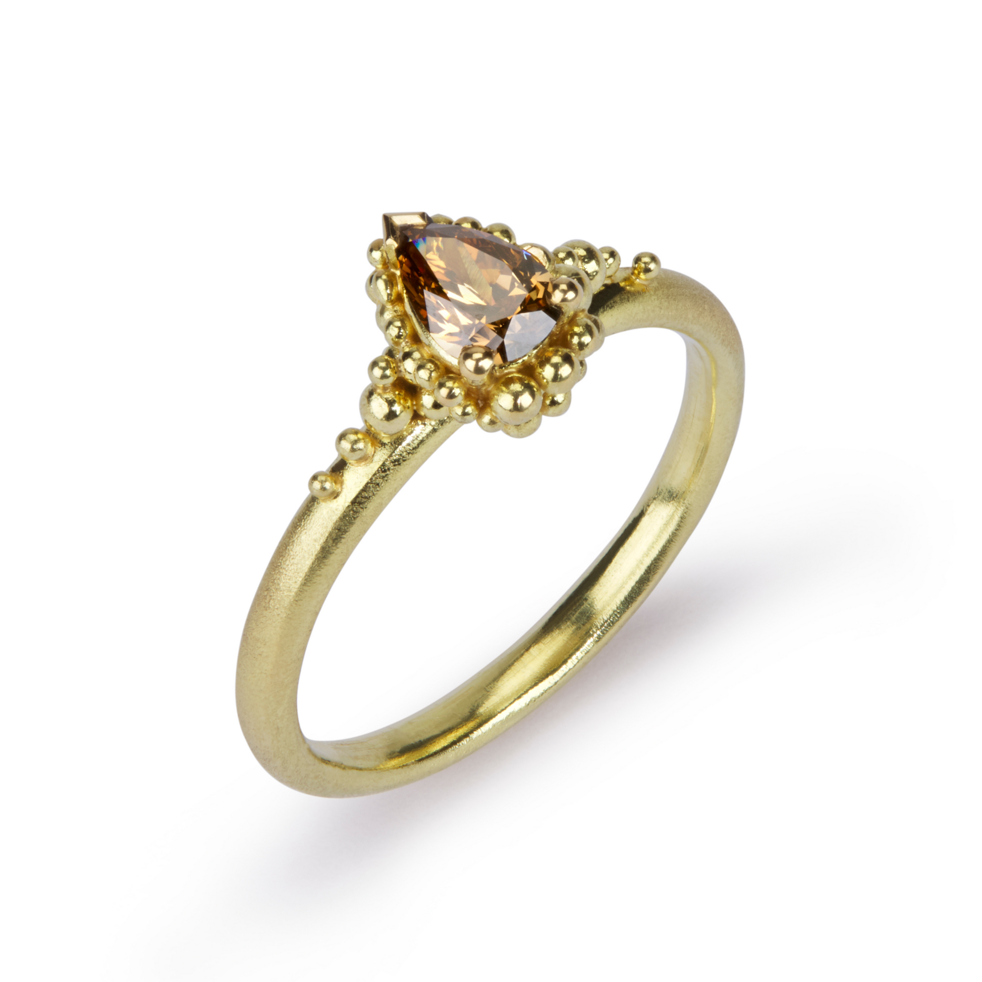 This showstopper ring features a pear shaped diamond in beautiful champagne tones.  The diamond is interlaced with fine 18ct yellow gold granulation and set on an 18ct yellow gold band.