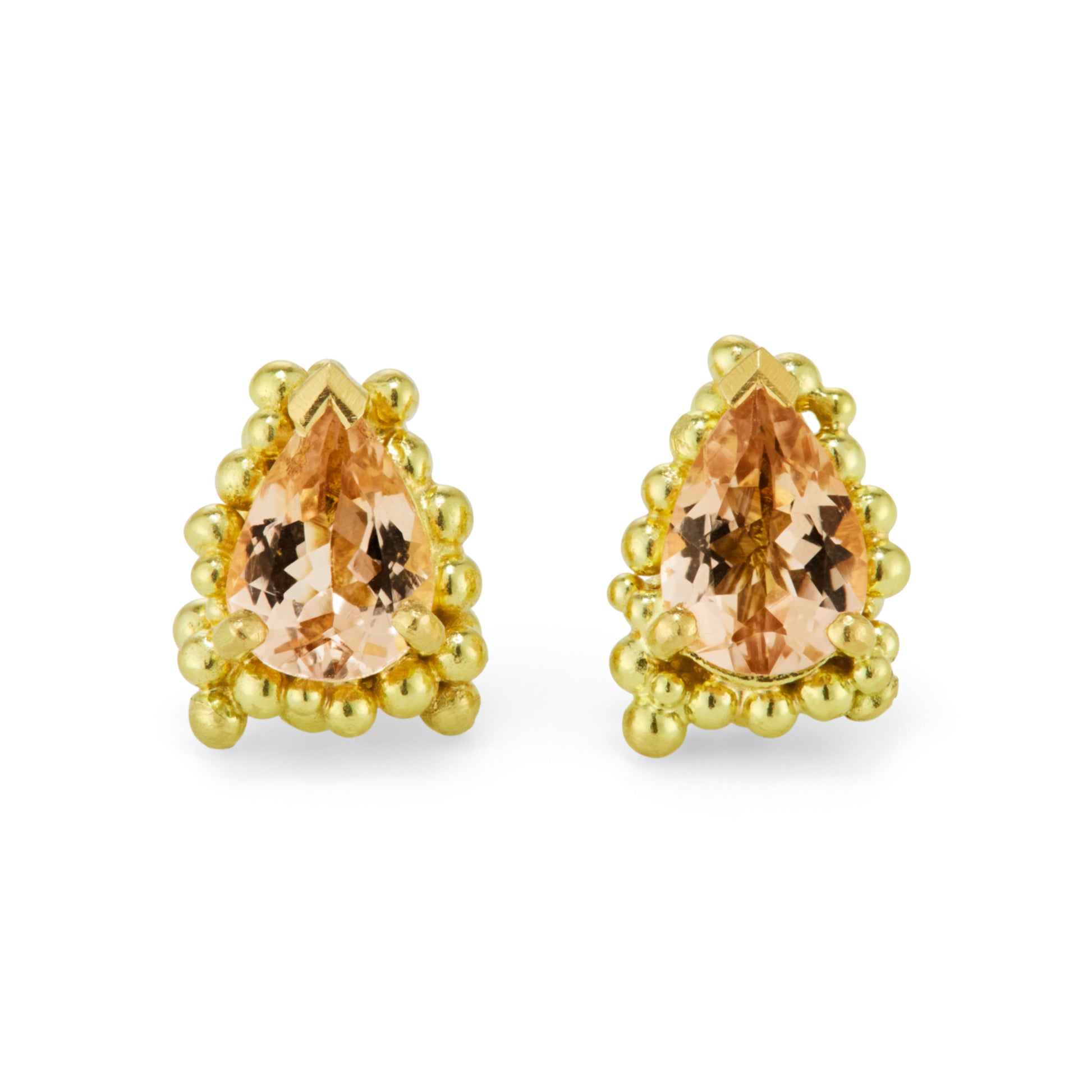 These beautiful earrings feature a blush pink pear shaped morganites, surrounded with rich yellow gold granules.