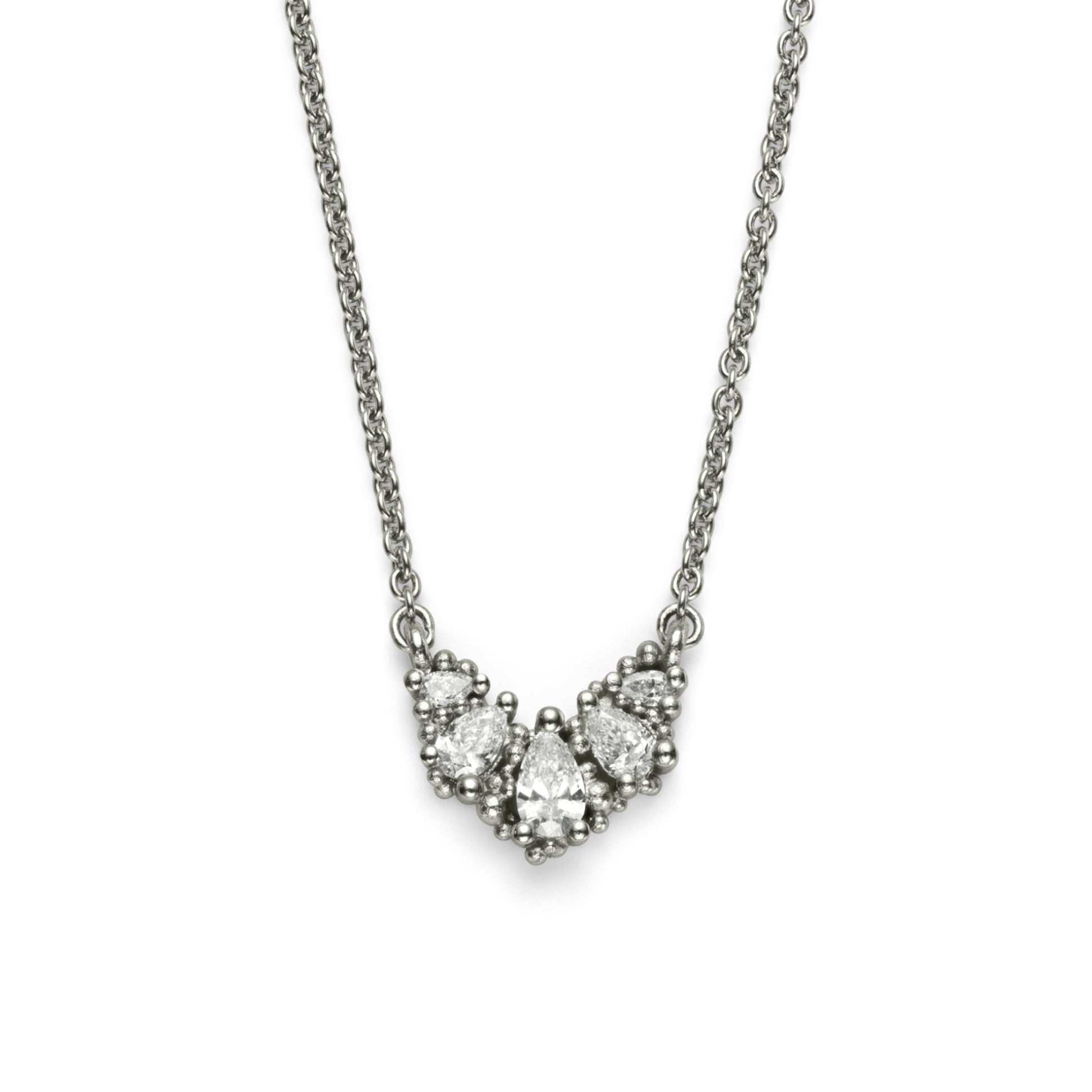 Five glorious diamond 'droplets', held in a gossamer of delicate platinum granulation, capture the light in this dazzling necklace.