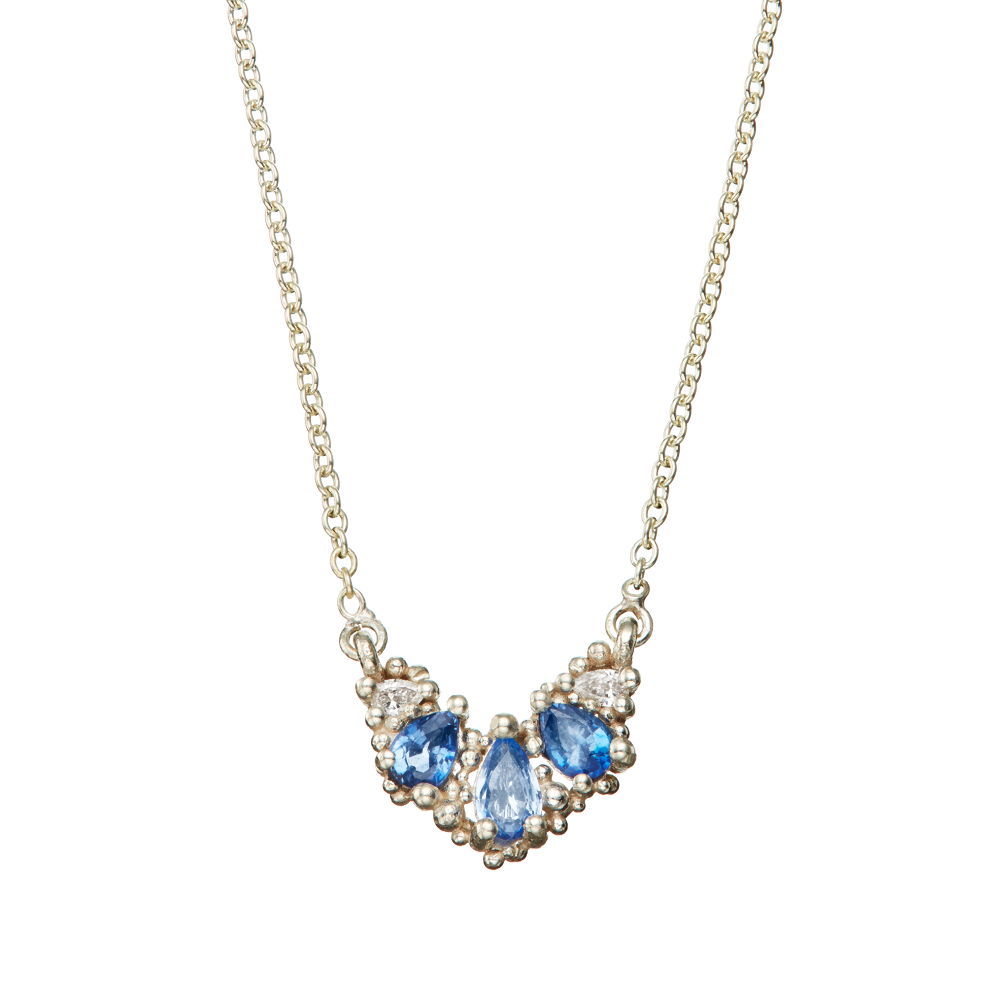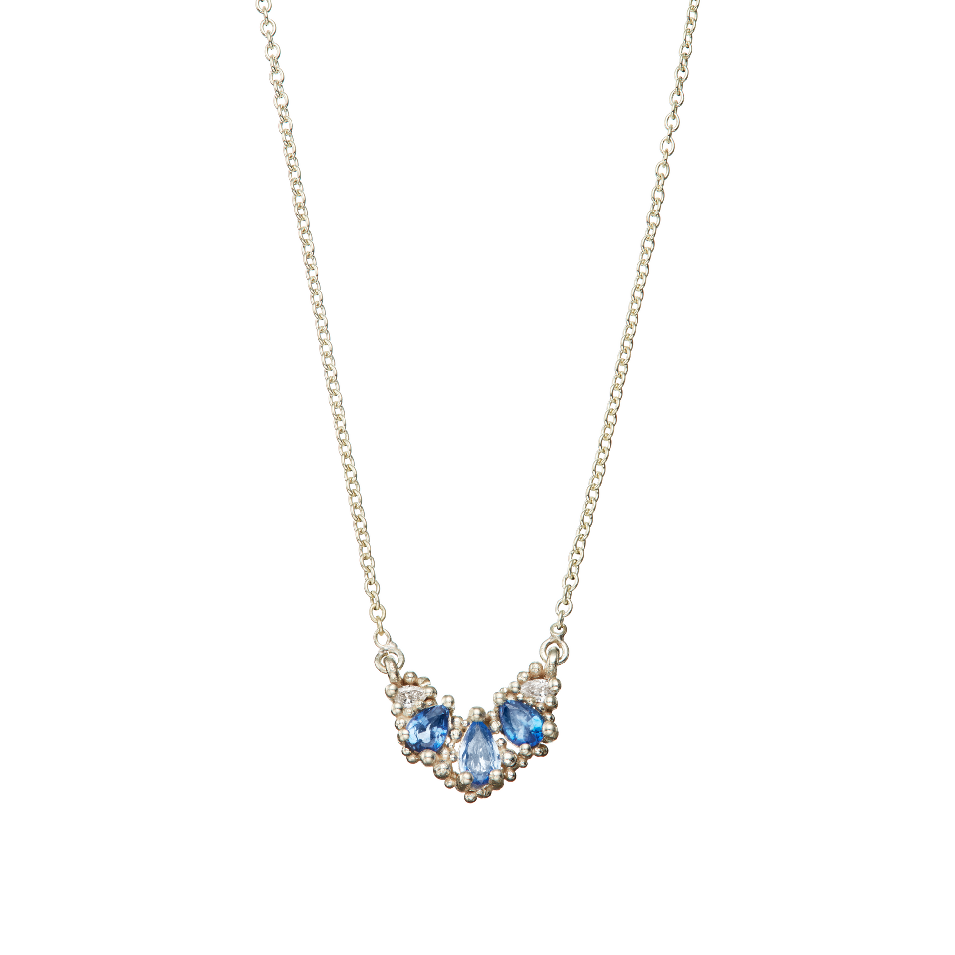 Five beautifully refreshing sapphire and diamond 'droplets are held in a gossamer of delicate white gold granulation.