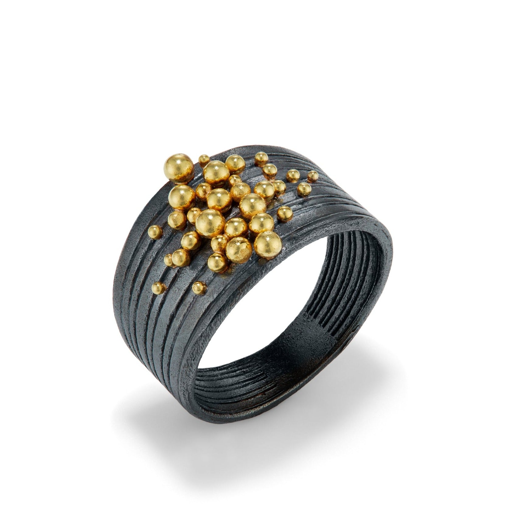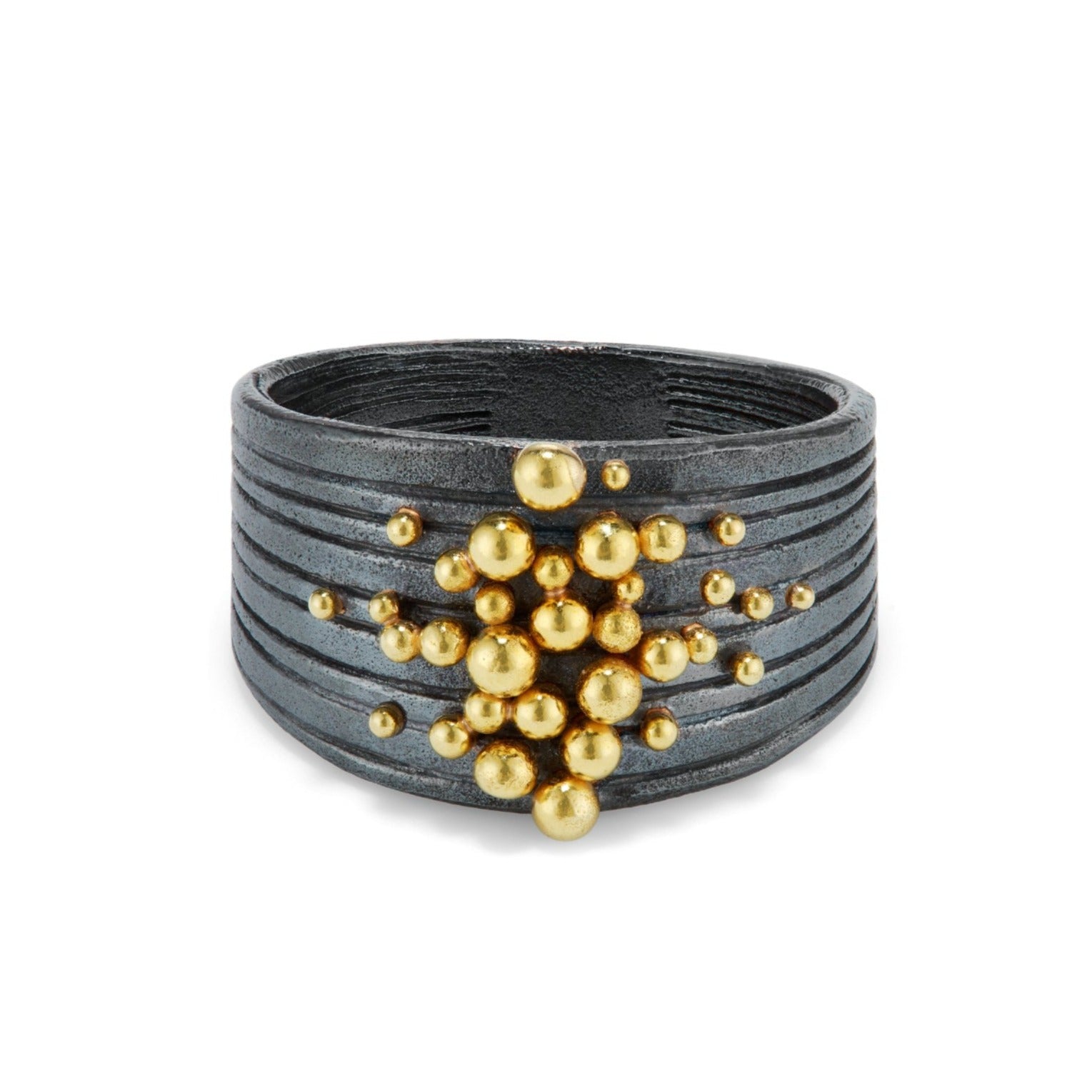 A generous tapered band of silver strands is adorned with a splash of 18ct gold droplets.