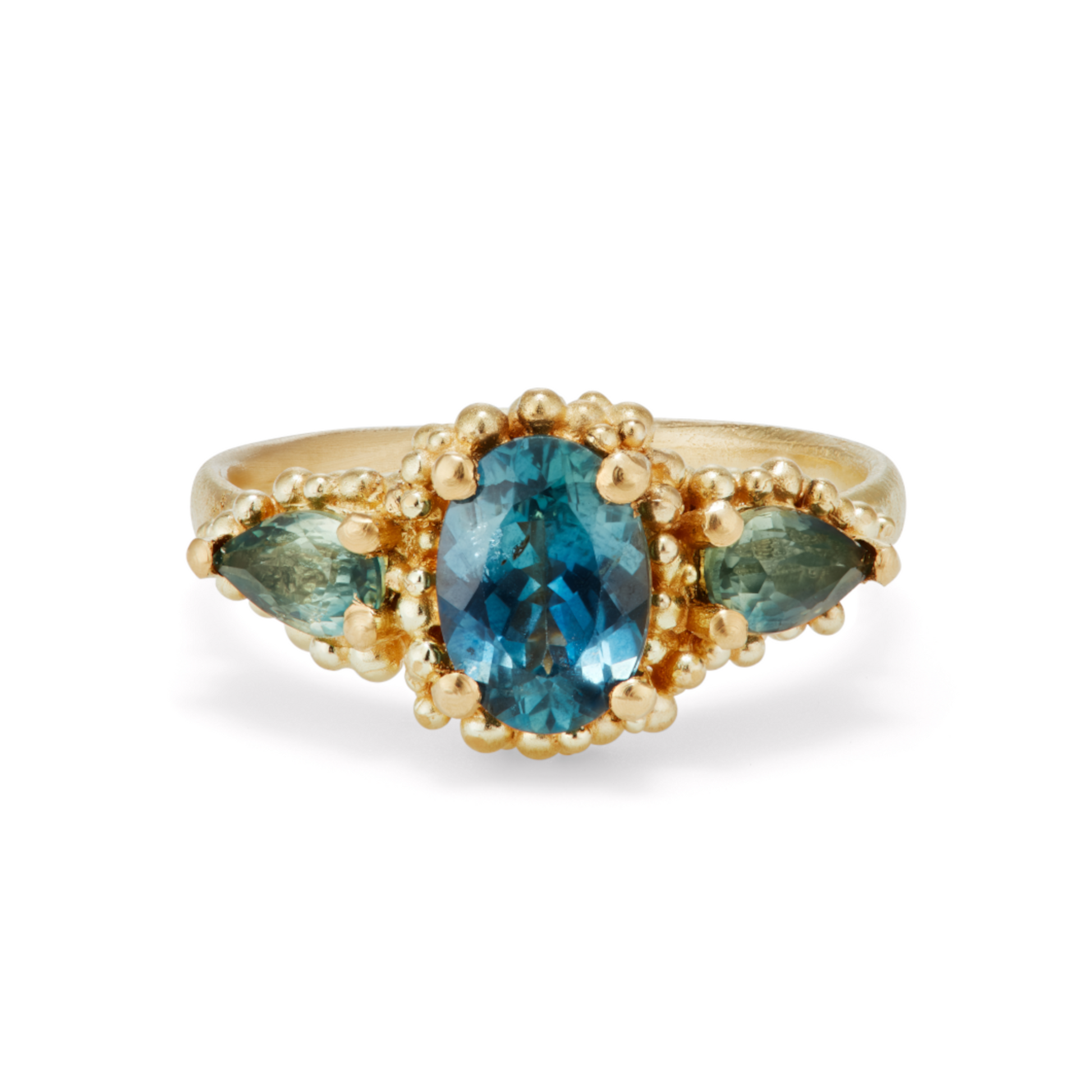 A stunning trio of sea blue sapphires, all nestled in luxurious 18ct yellow gold granulation.