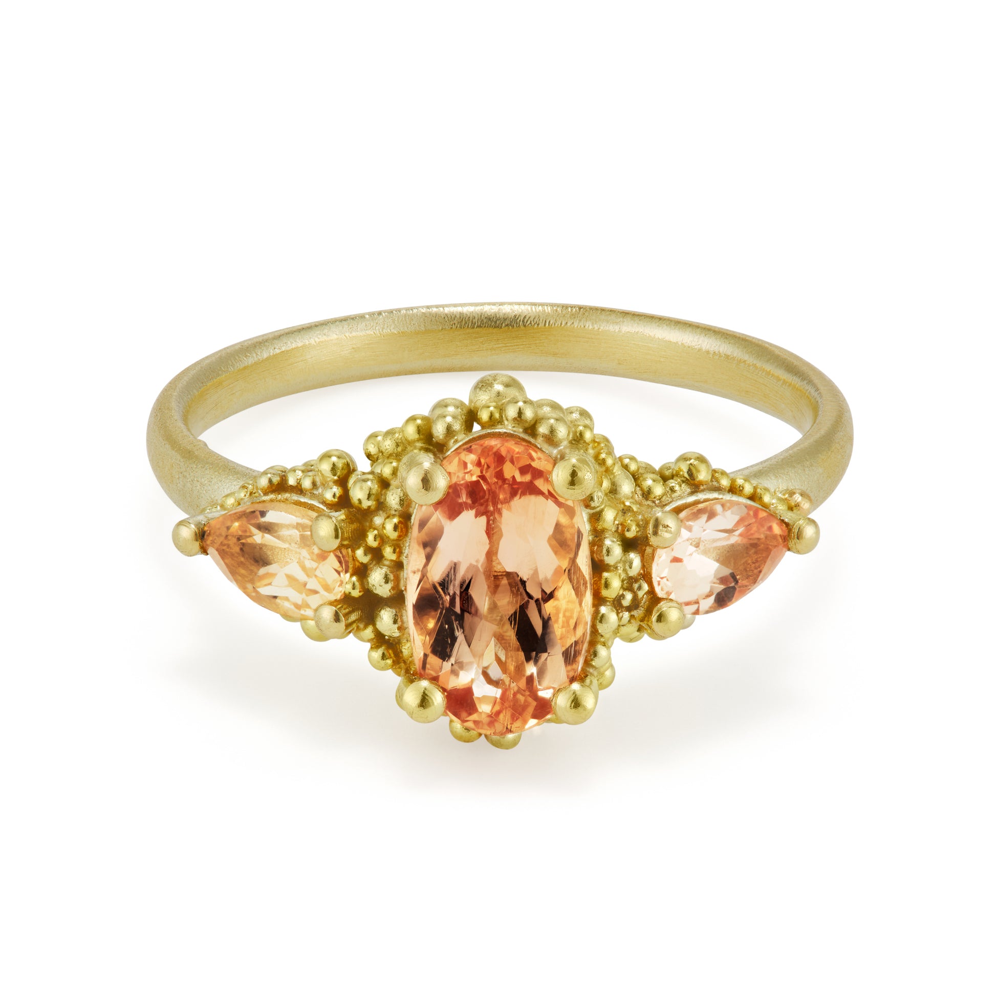 A delicious peach oval Topaz is flanked by two raindrop jewels - all nestled in clusters of yellow gold granulation.