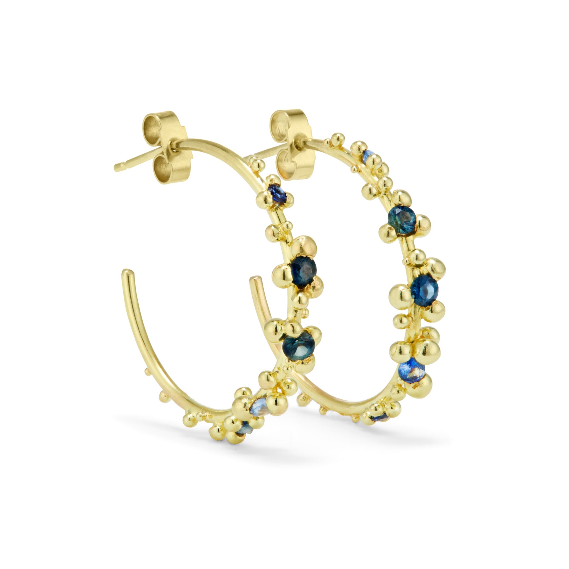 These generously jewelled hoop earrings are handcrafted in rich 18ct yellow gold. A shoreline of gold granulation is strewn with different ocean-toned sapphires.