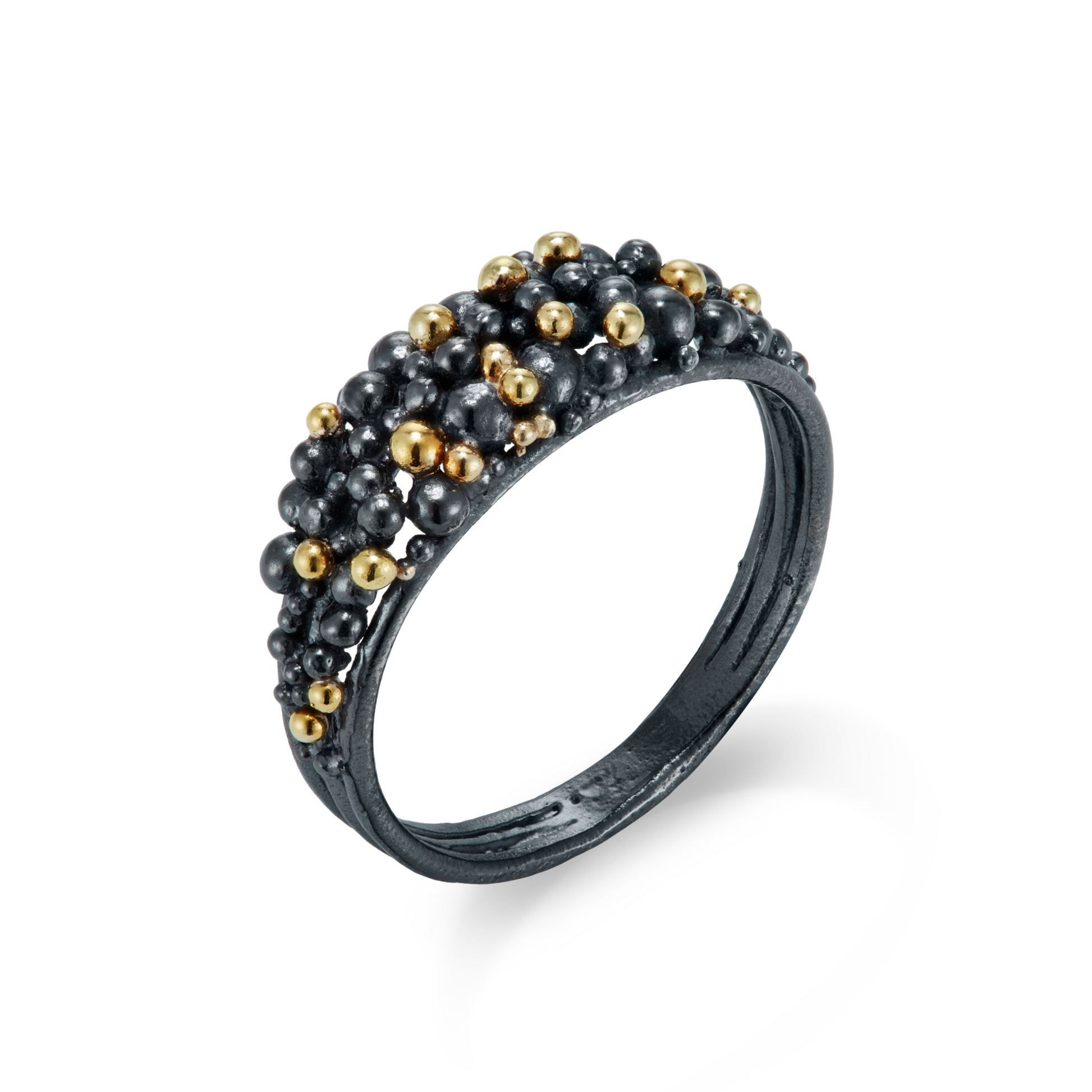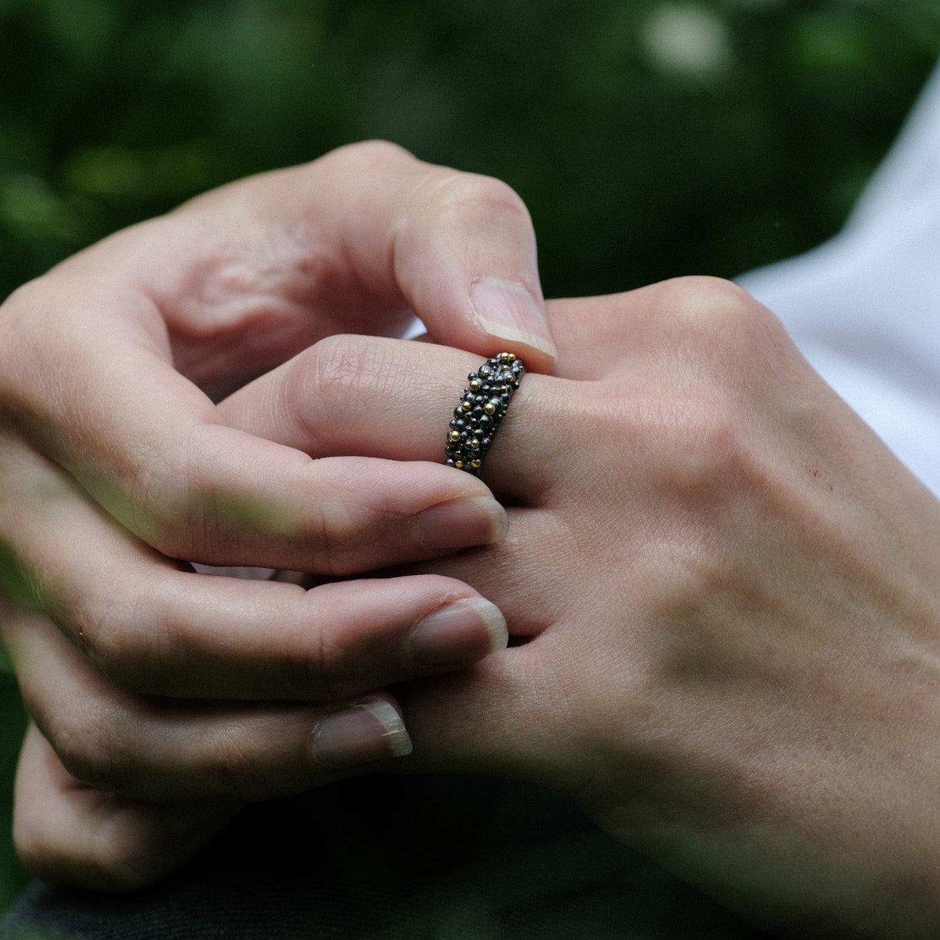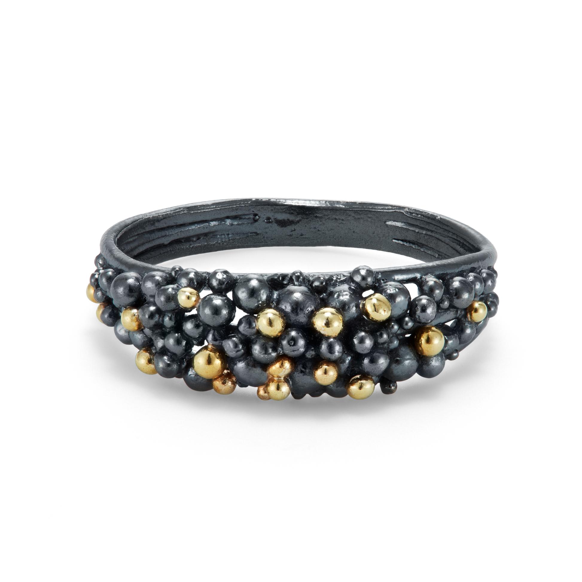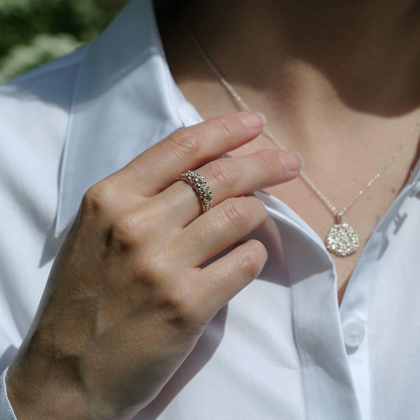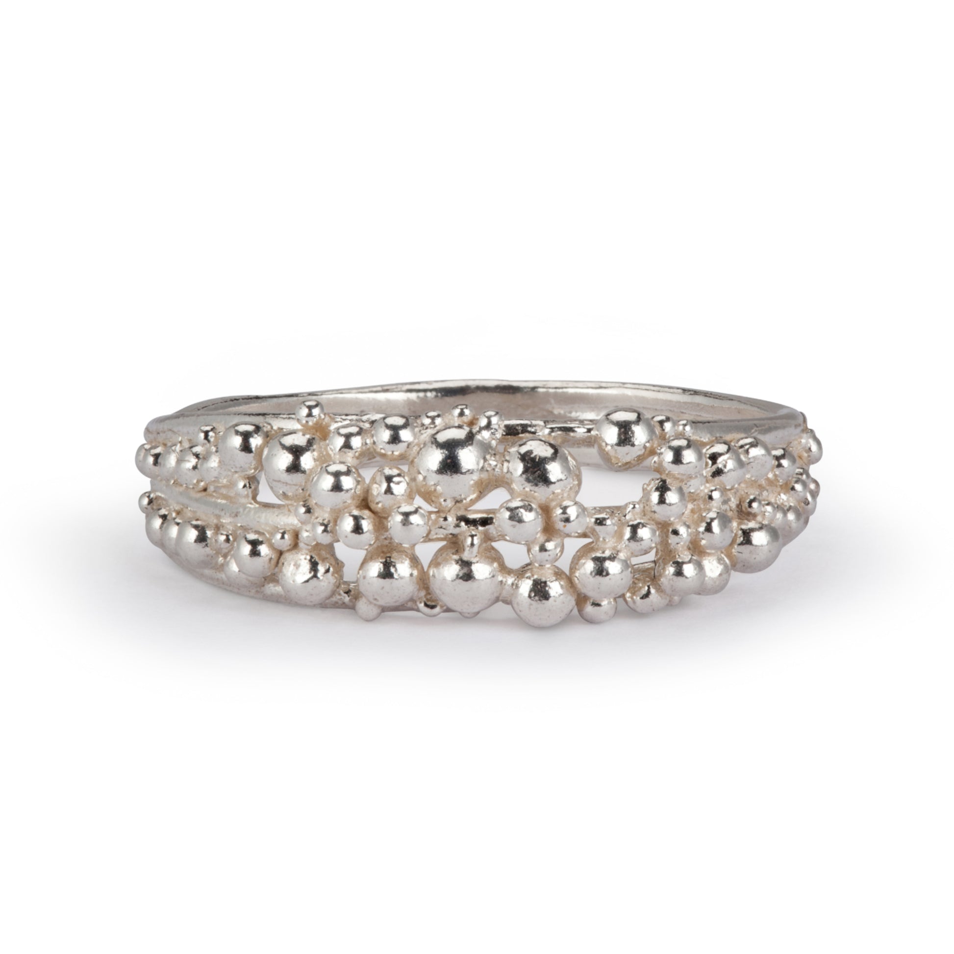 Shimmering silver bands are interlaced and entwined with a generous scattering of silver granules to form a single striking ring.