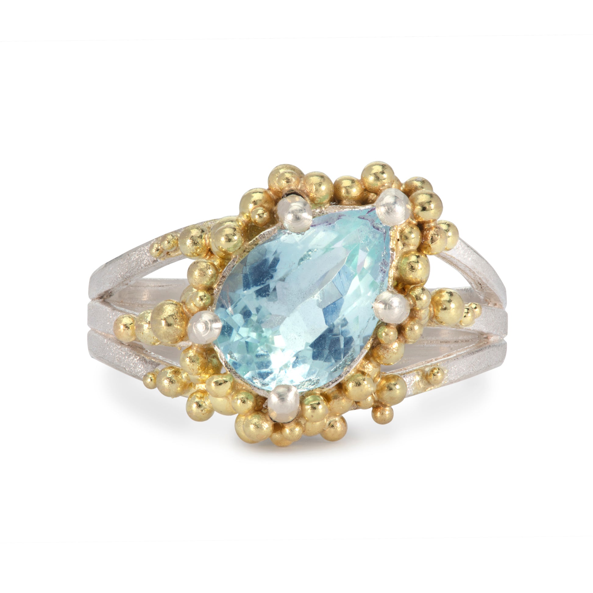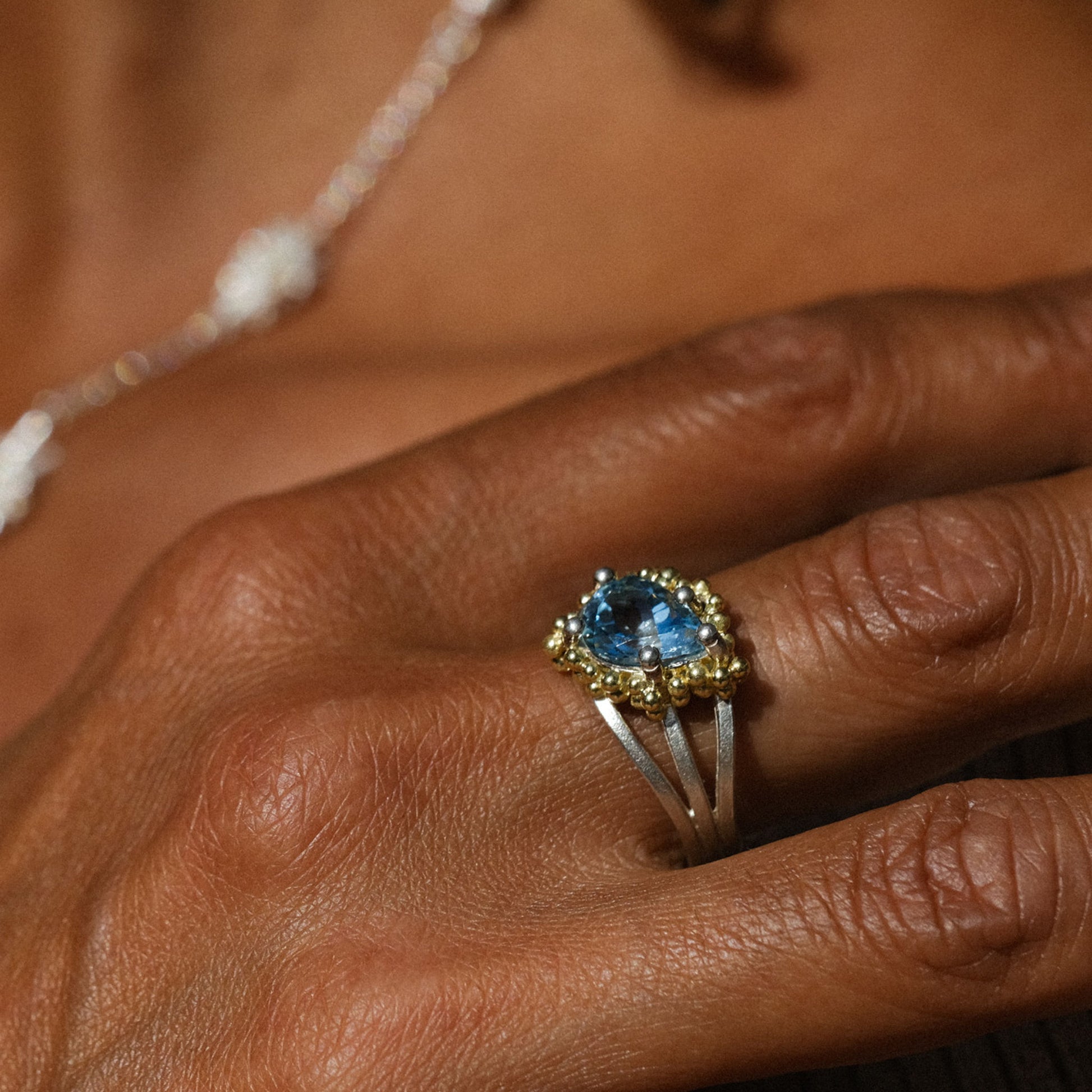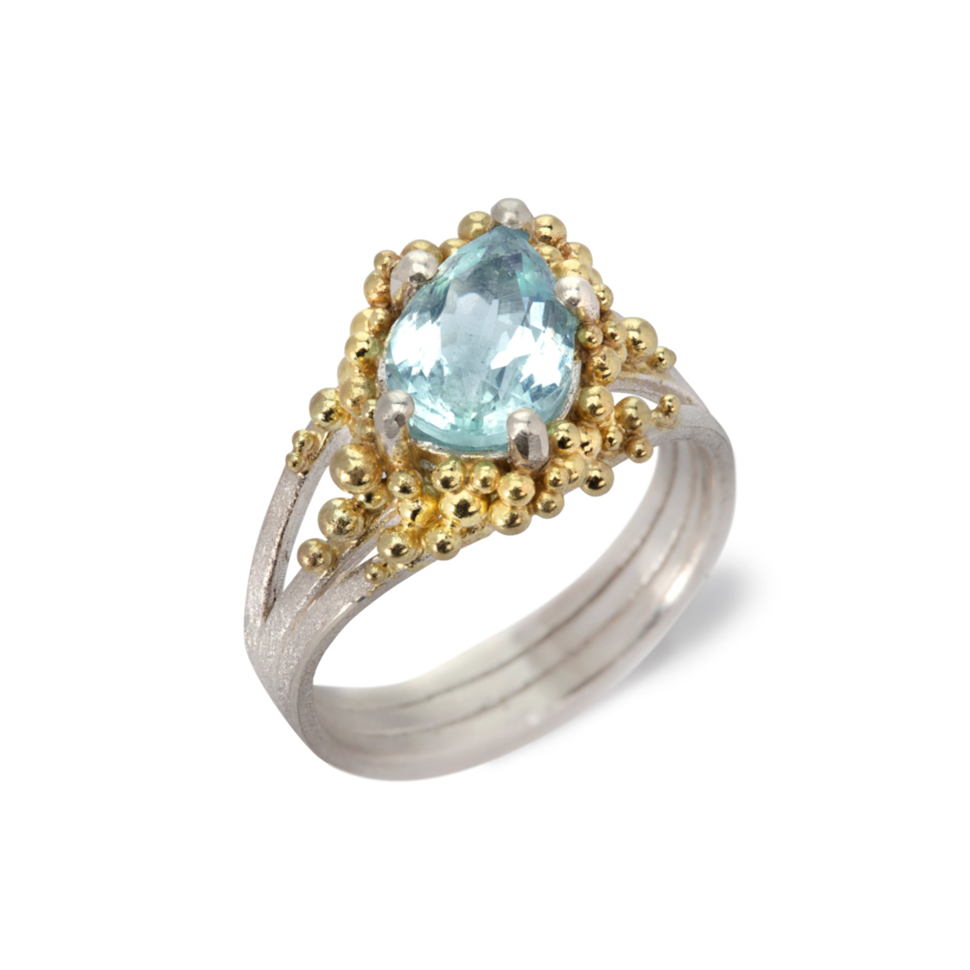 This pretty ring features a sky blue topaz shaped aquamarine, wrapped in 18ct yellow gold granulation and set on a silver band.