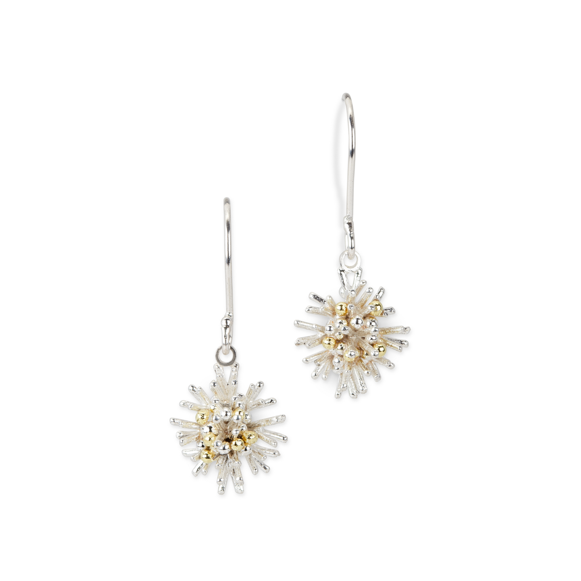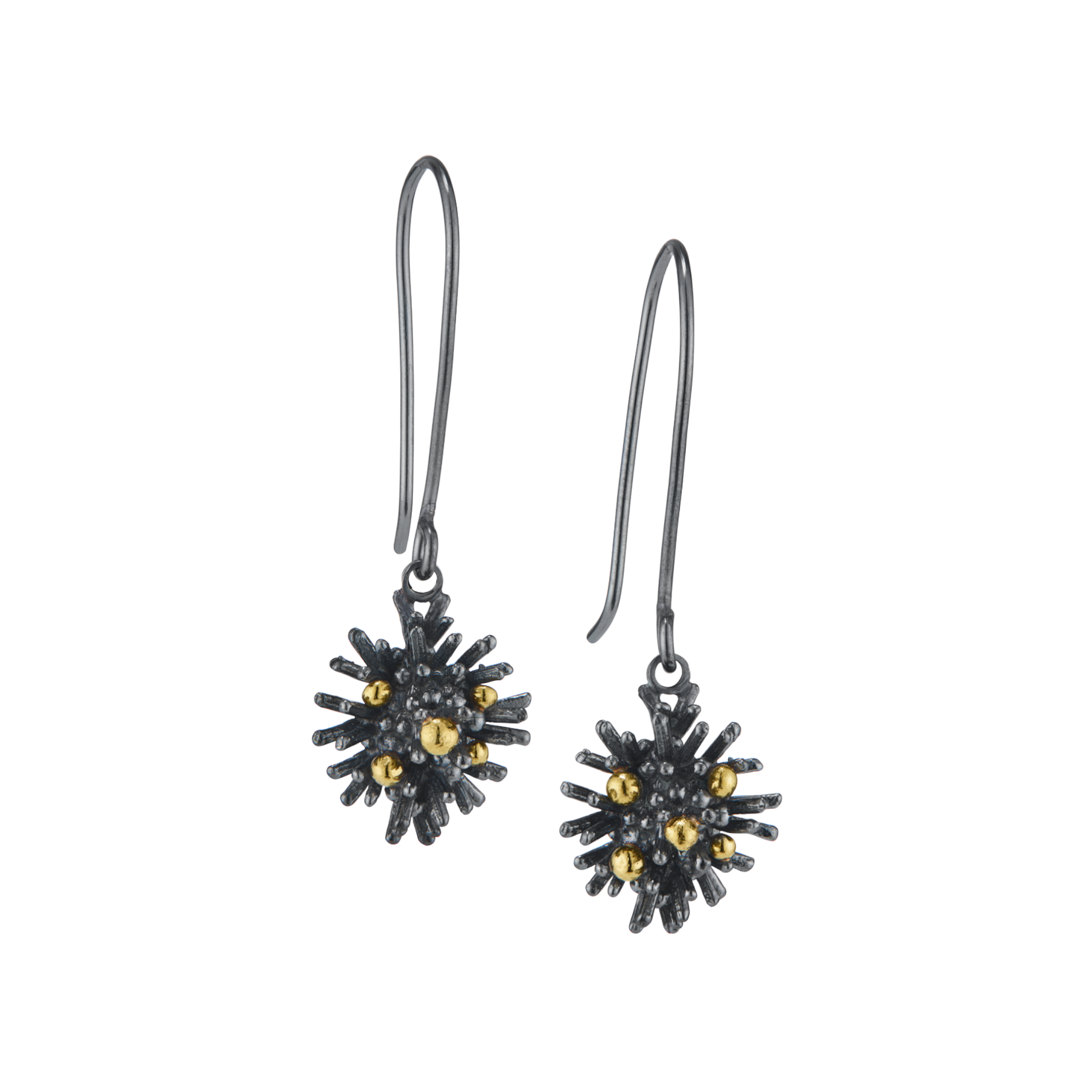 Inspired by Sea Urchins, these silver spine drop earrings form a contemporary structure, which are meticulously embedded and scattered with combinations of gold and silver granulation.