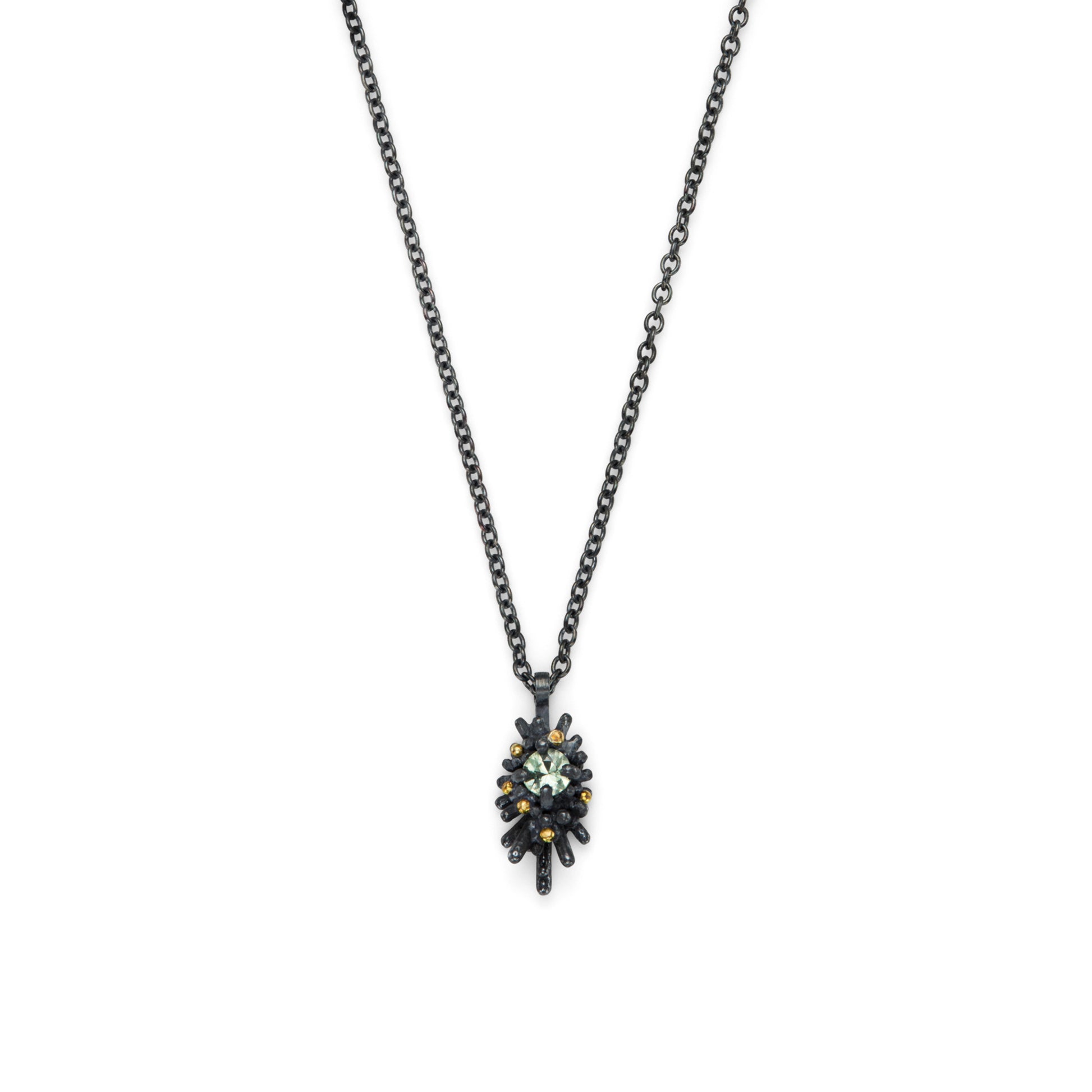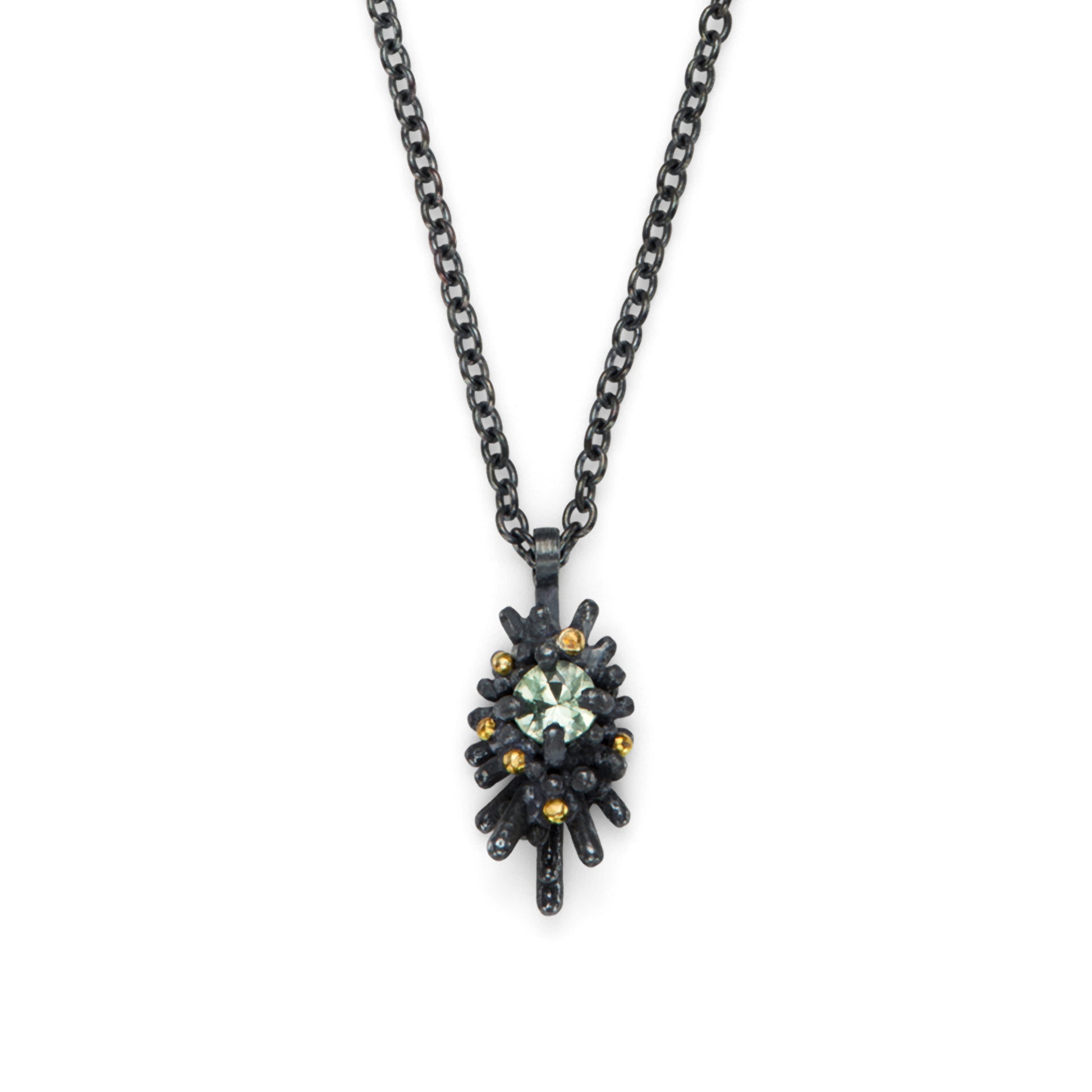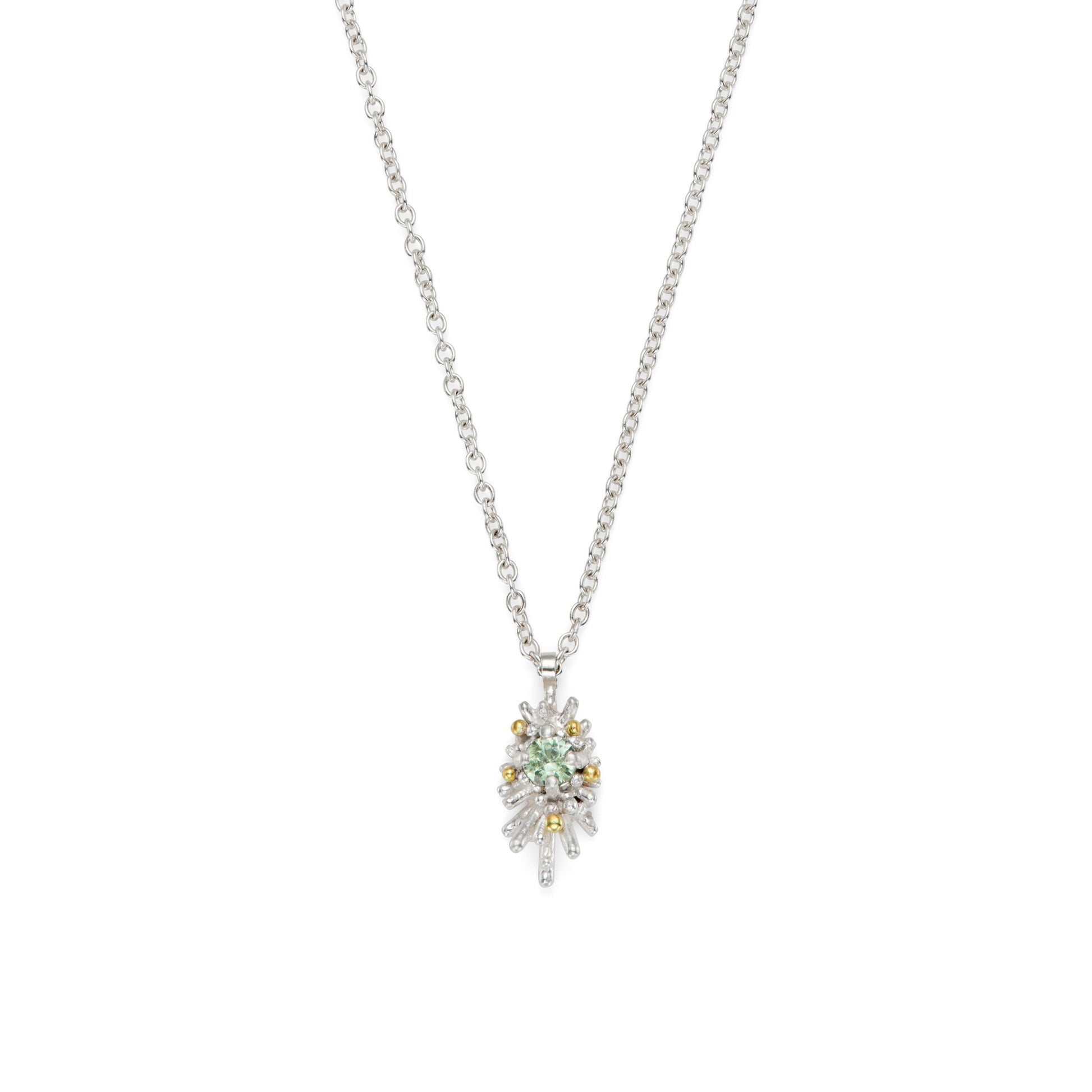 A delicately sculptural pendant featuring a silver sea urchin, set with a sparkling green sapphire. Available in a choice of silver and 18ct gold or oxidised silver & 18ct gold granulation.