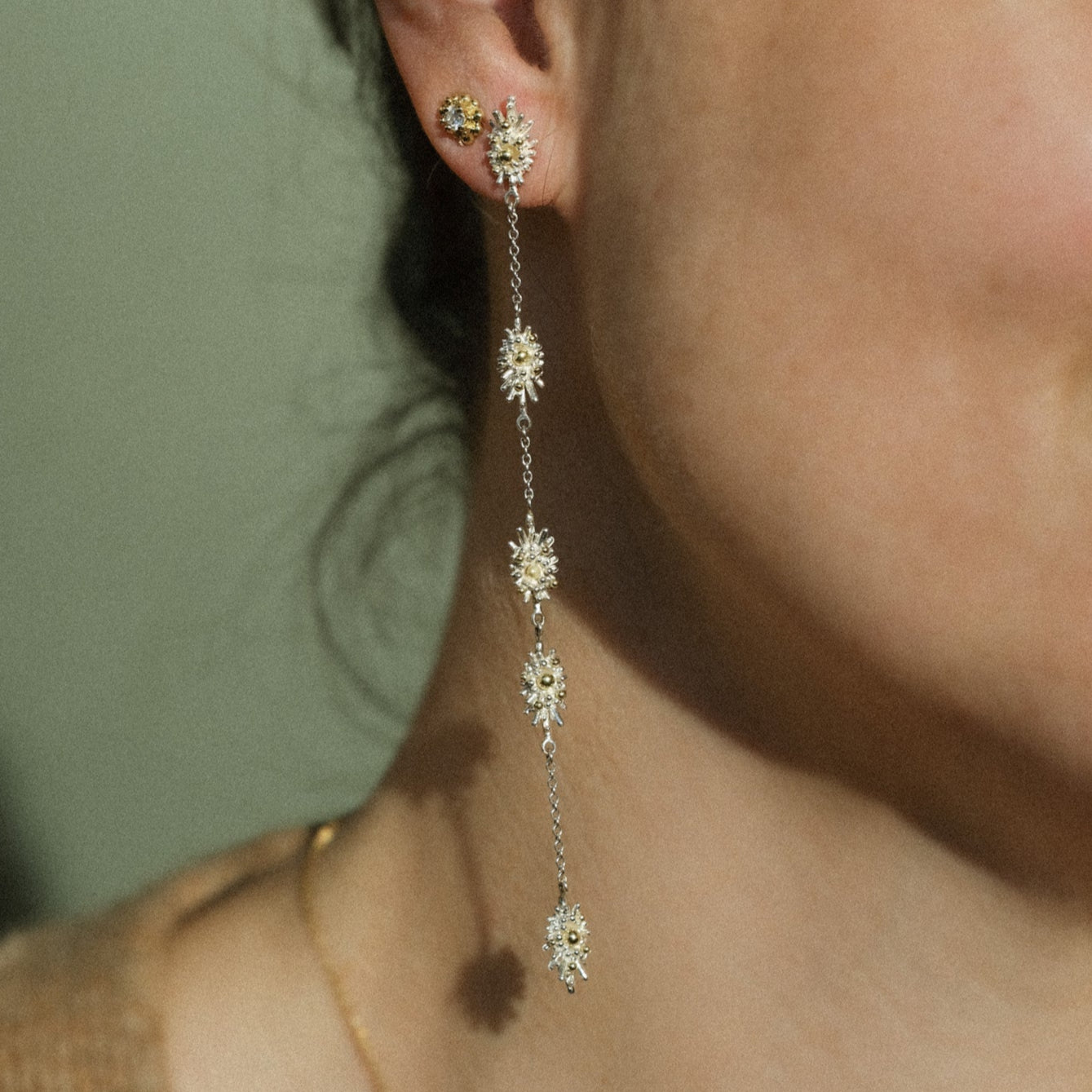 Statement earrings, featuring a flow of five delicately sculptural sea urchin elements -  interspersed with contrasting silver and 18ct gold granulation.