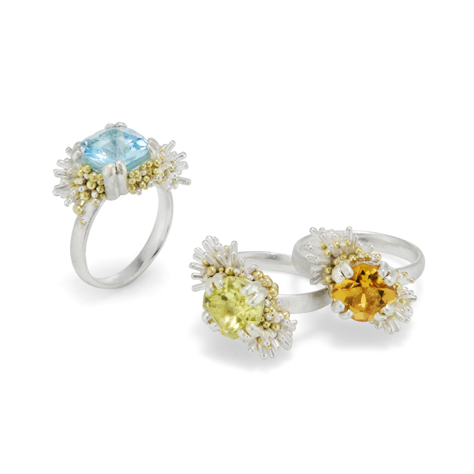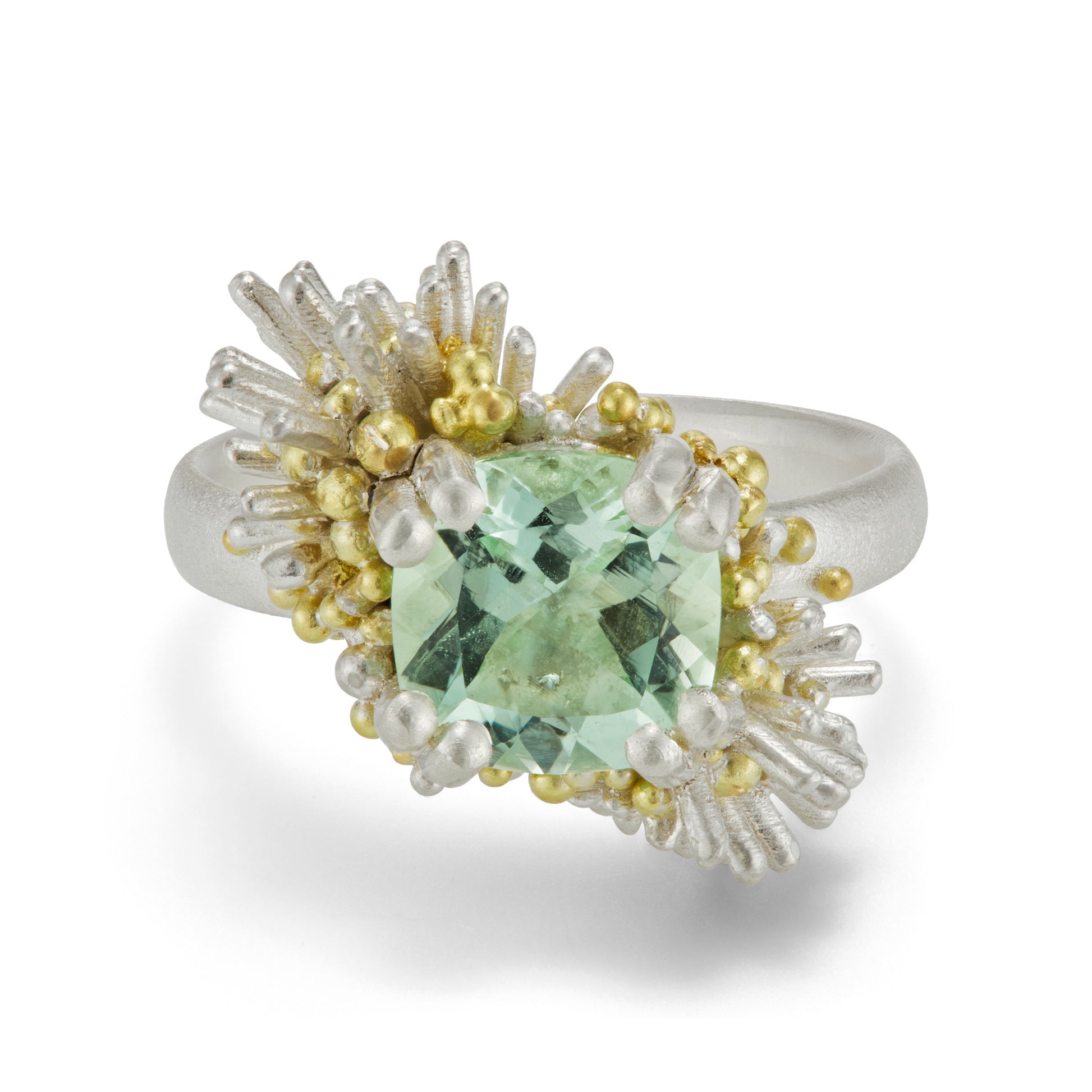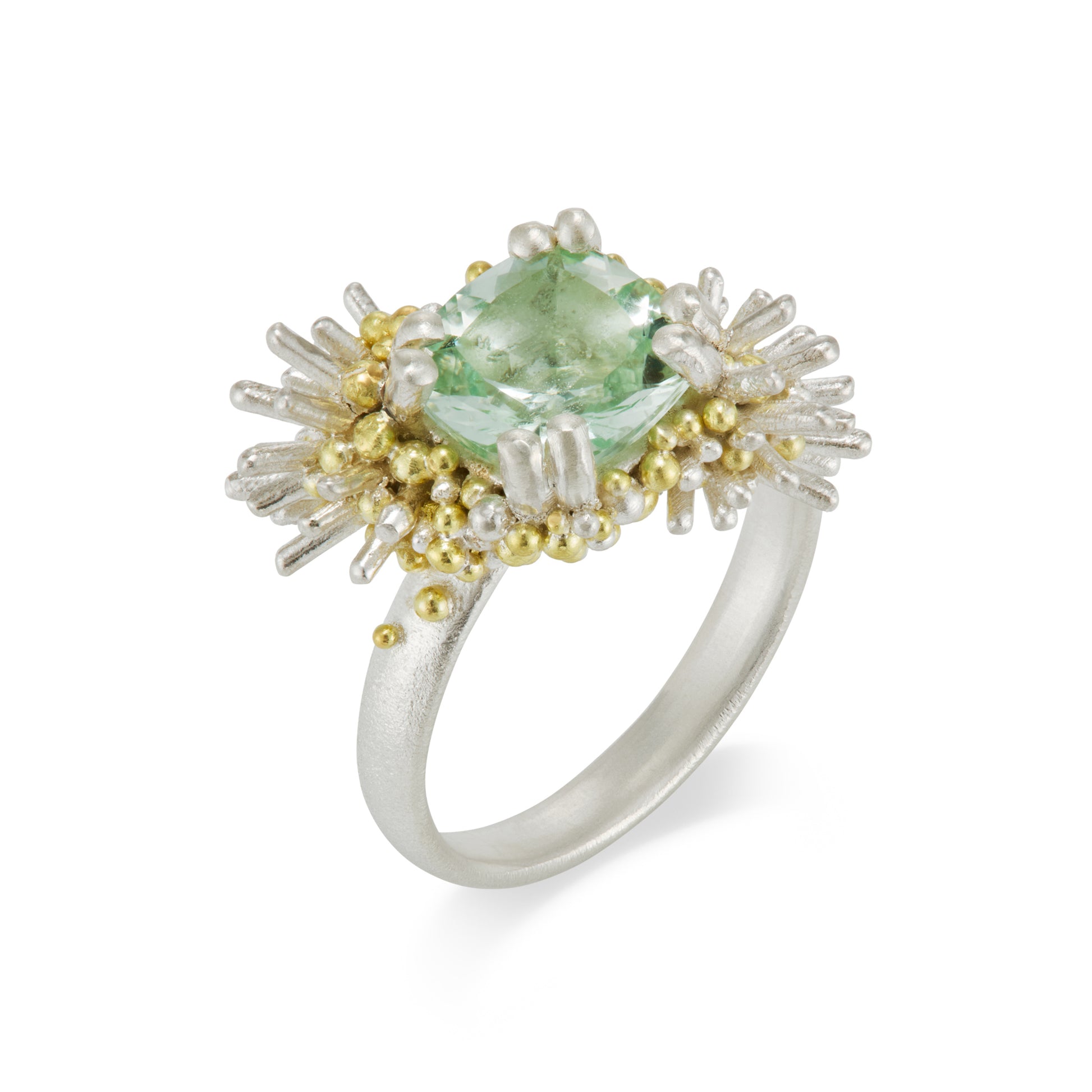This ethically sourced green amethyst has been encased in a bed of softly sculptural sea urchin quills and flowing silver and 18ct yellow gold granulation.