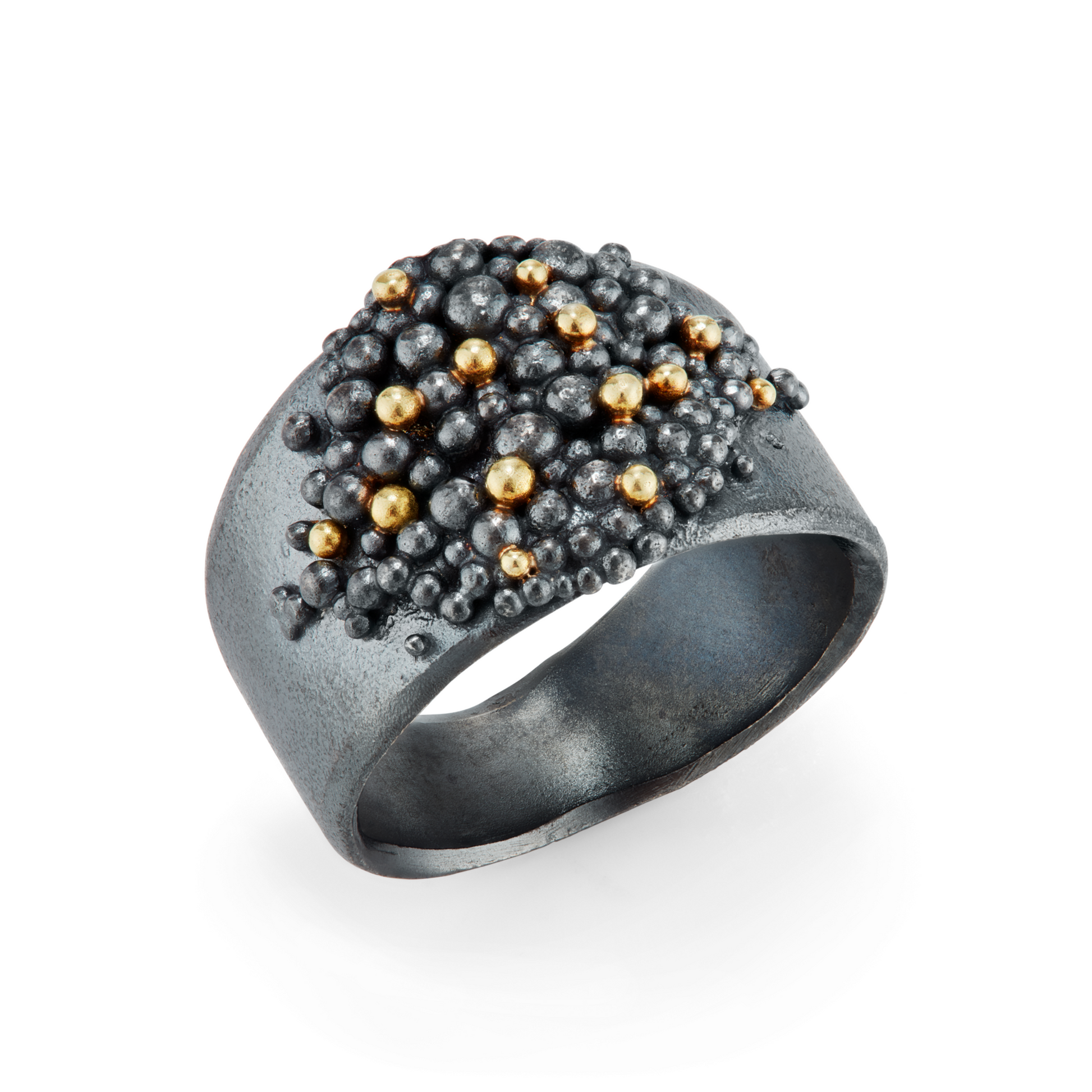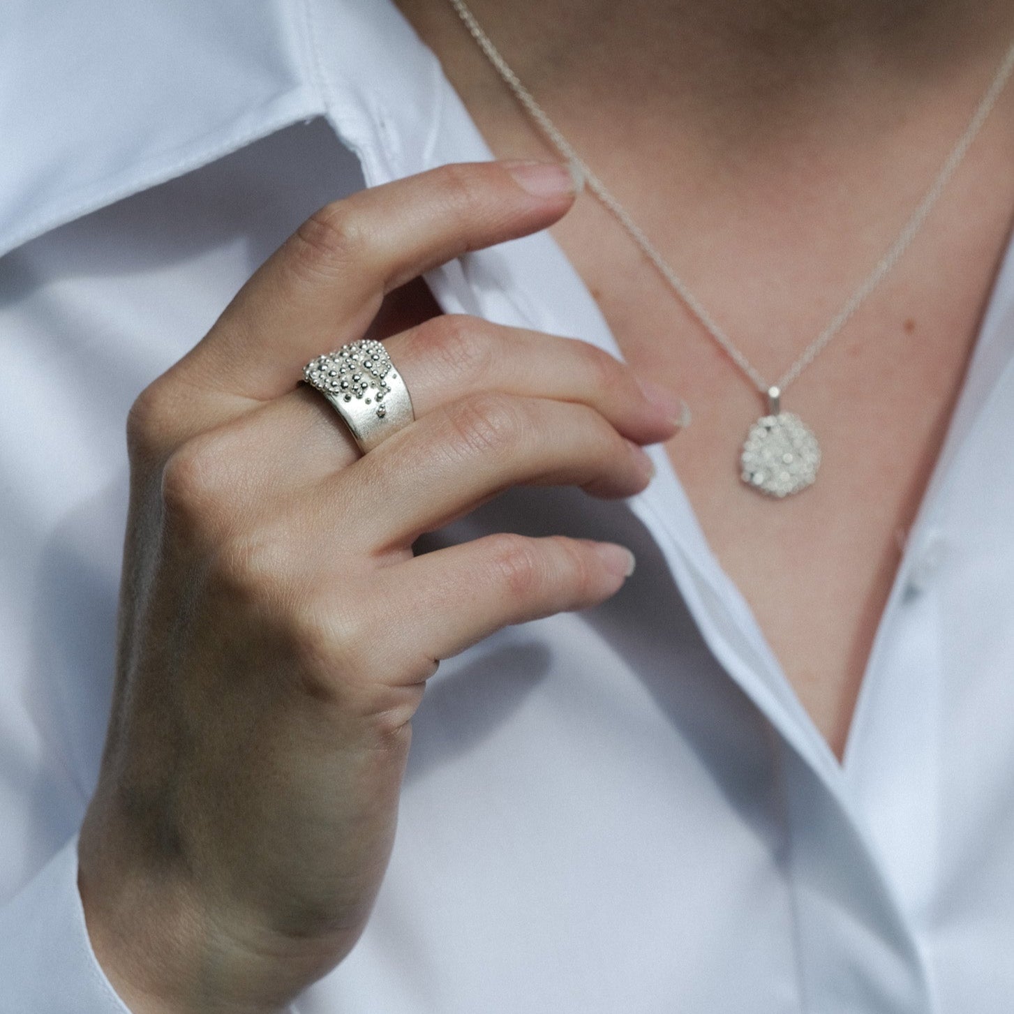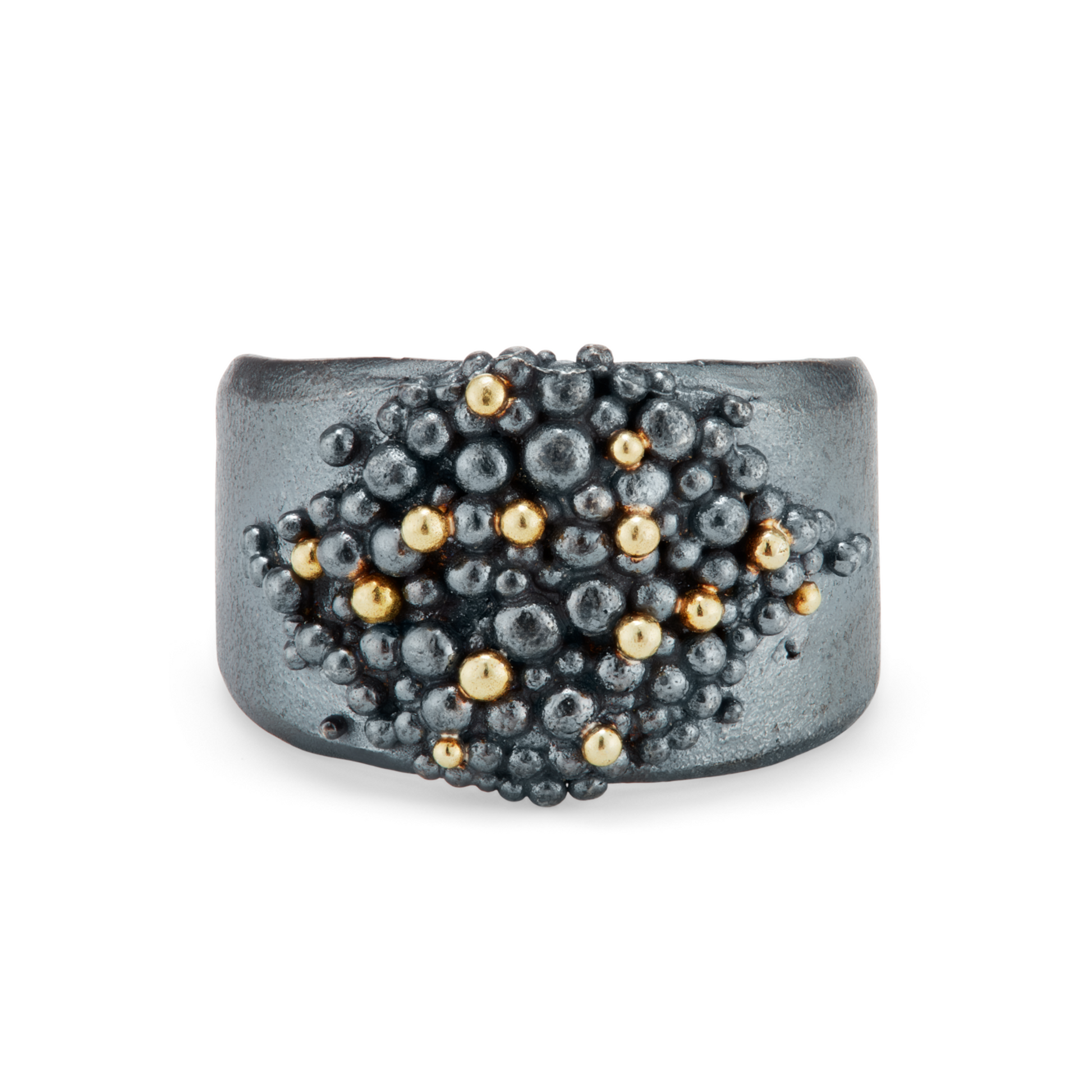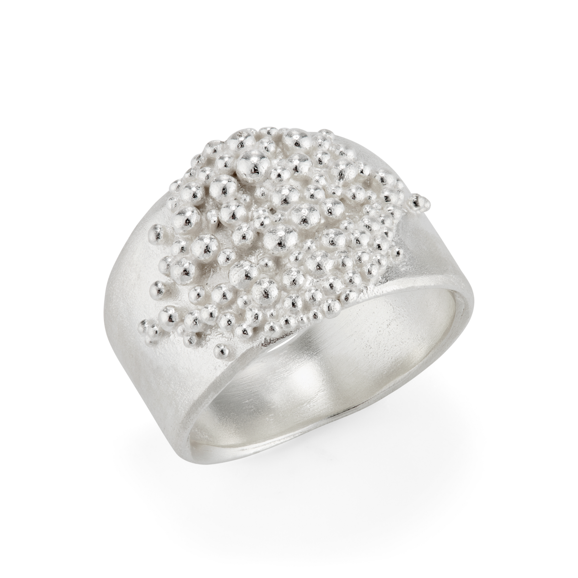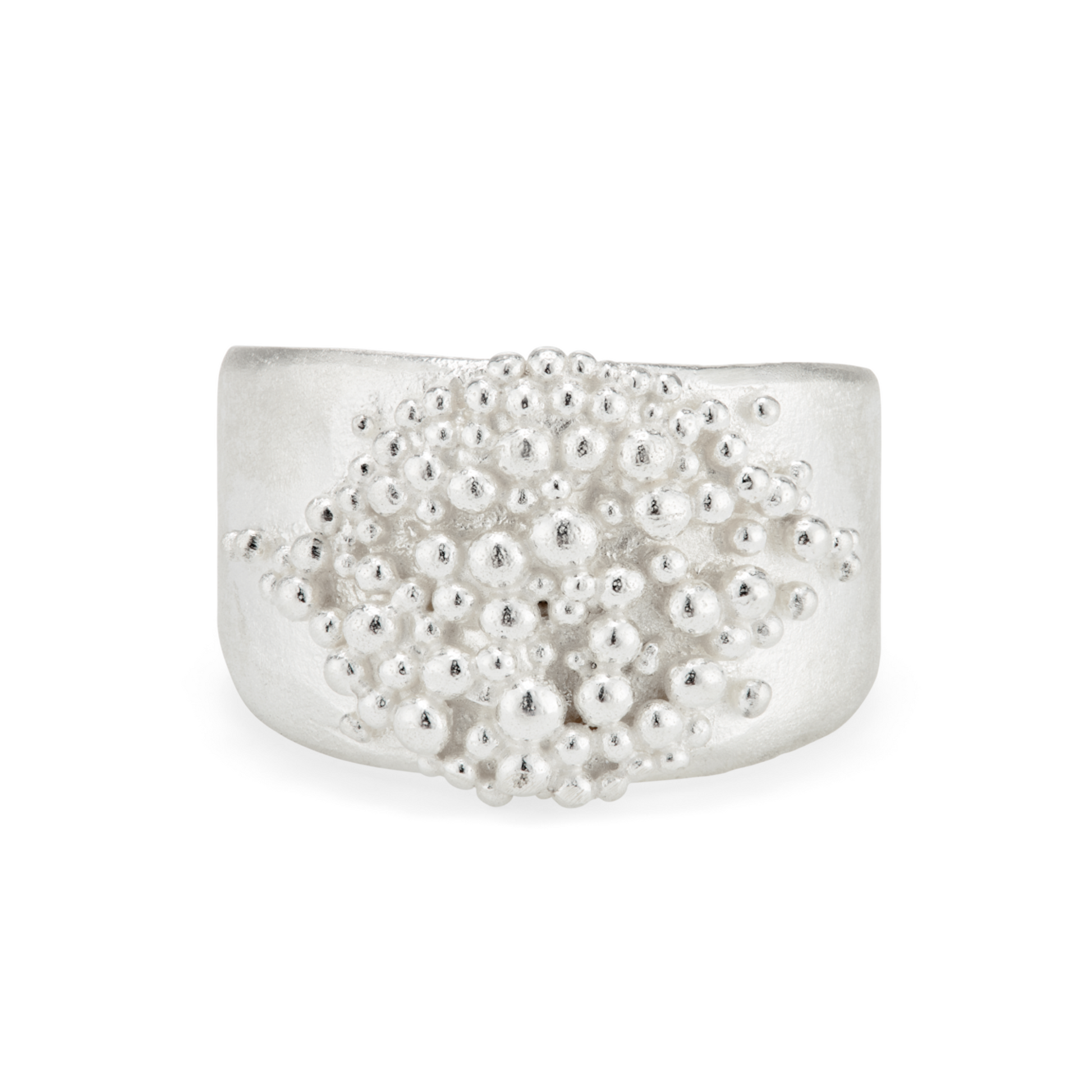 Tactile granules are strewn at the fore of a generous band and contrast with the smoothly forged matt-brushed silver.