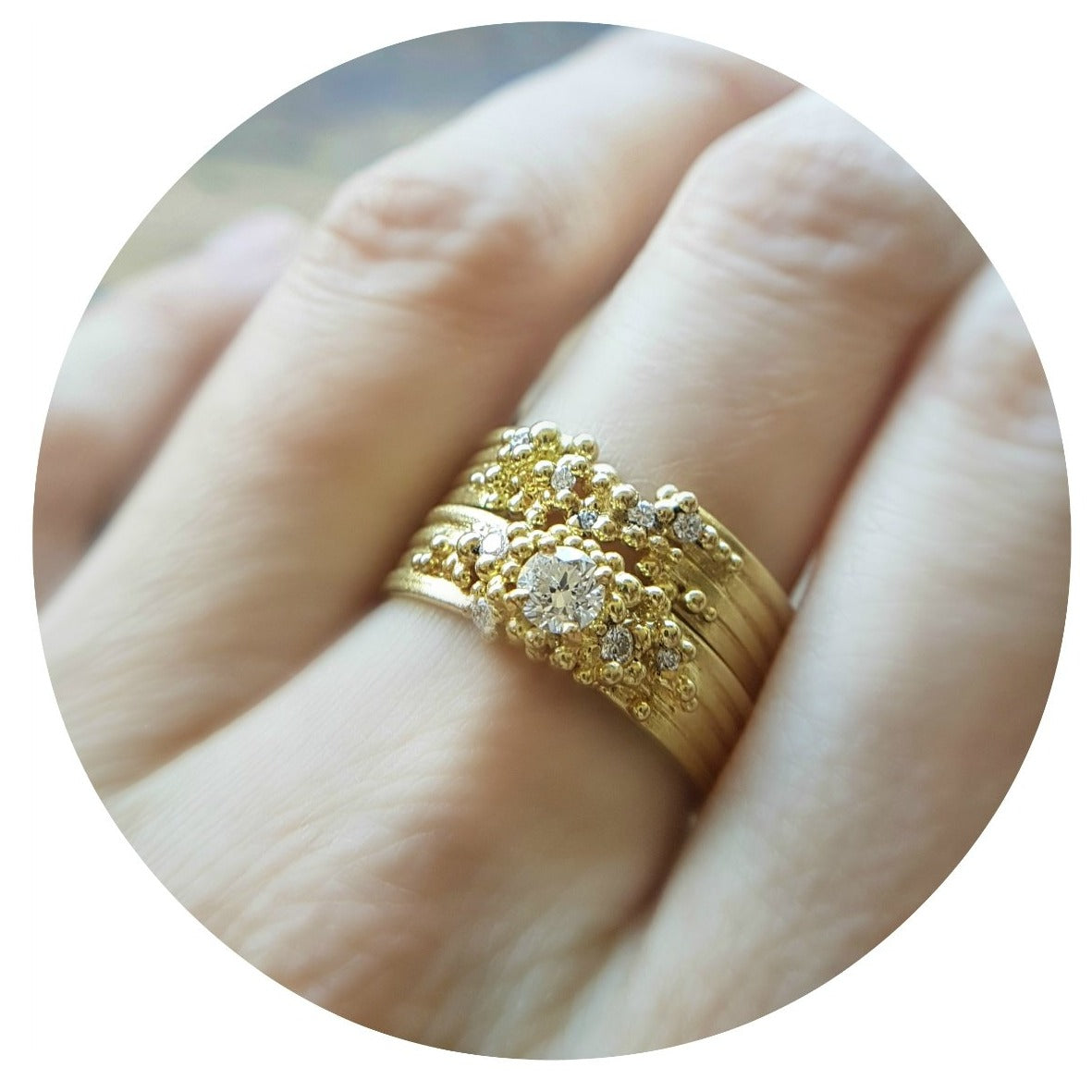 A froth of shimmering diamonds and golden granules meet in this beautiful wedding band.